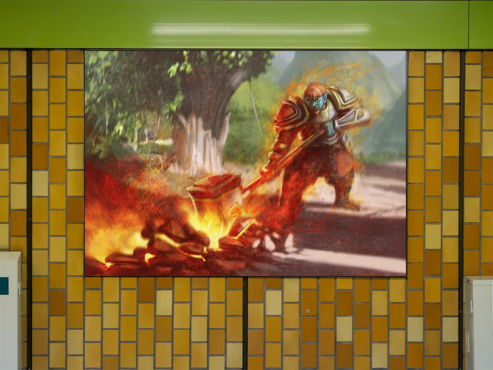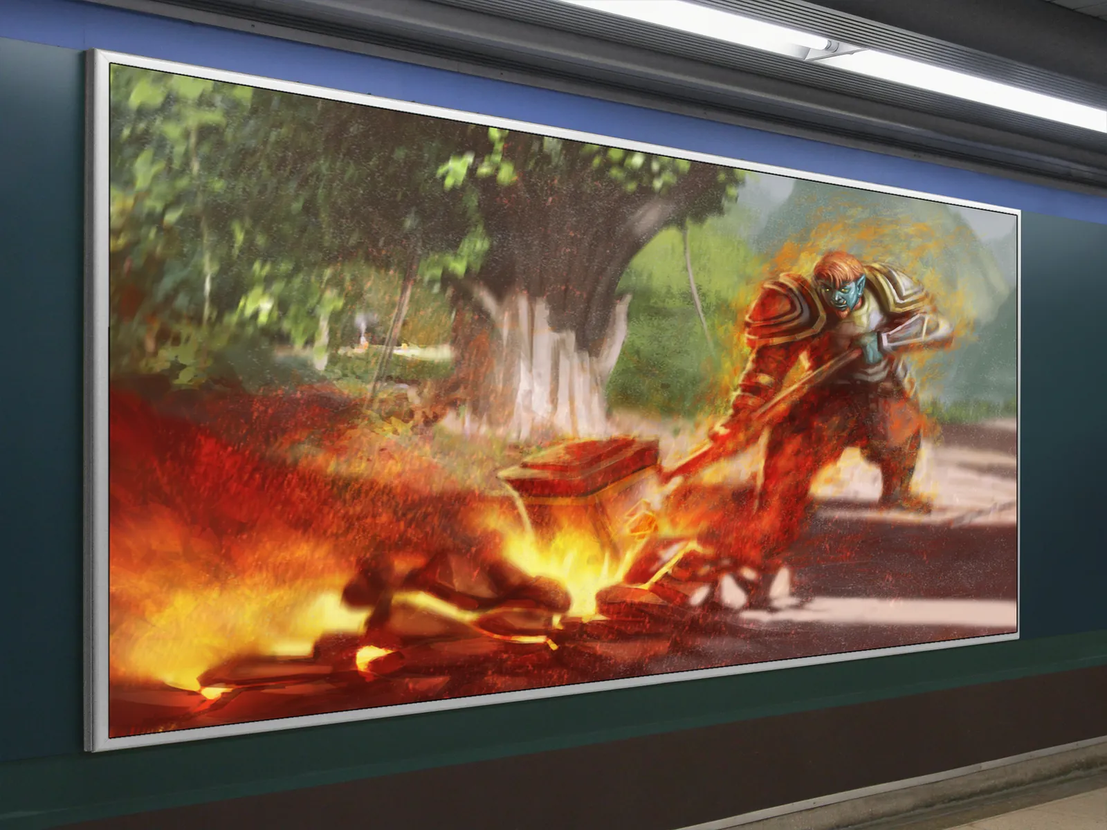 Additionally, the forward-driving stance and blazing impact pull the viewer straight into the strike. However, the softened background and painterly motion prevent visual clutter. Consequently, the paladin’s form remains dominant, readable, and powerful even at a distance.