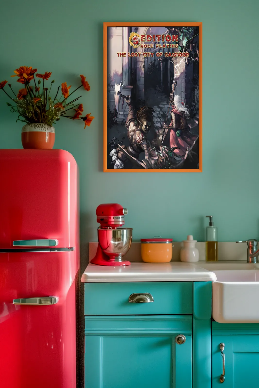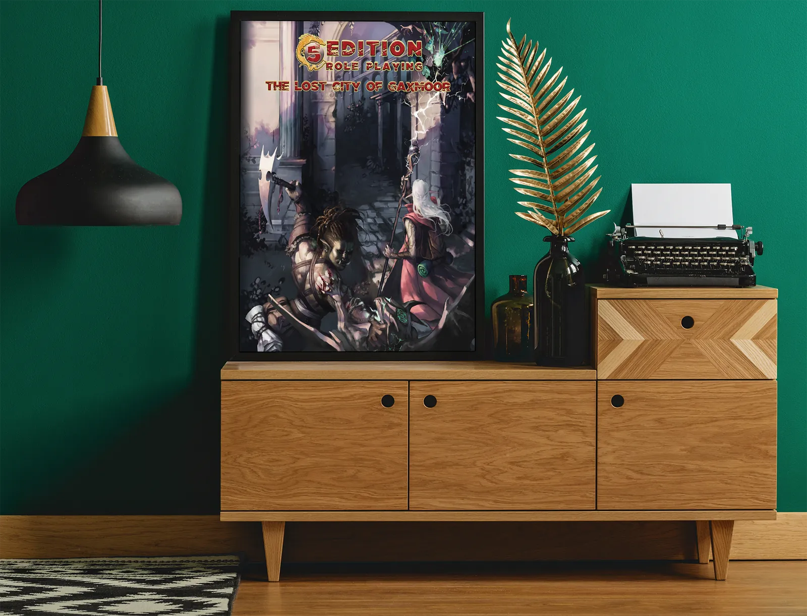 Lost City of Gaxmoor 5E cover art canvas print shows adventurers battling through a ruined city charged with arcane power, designed for tabletop gaming displays.