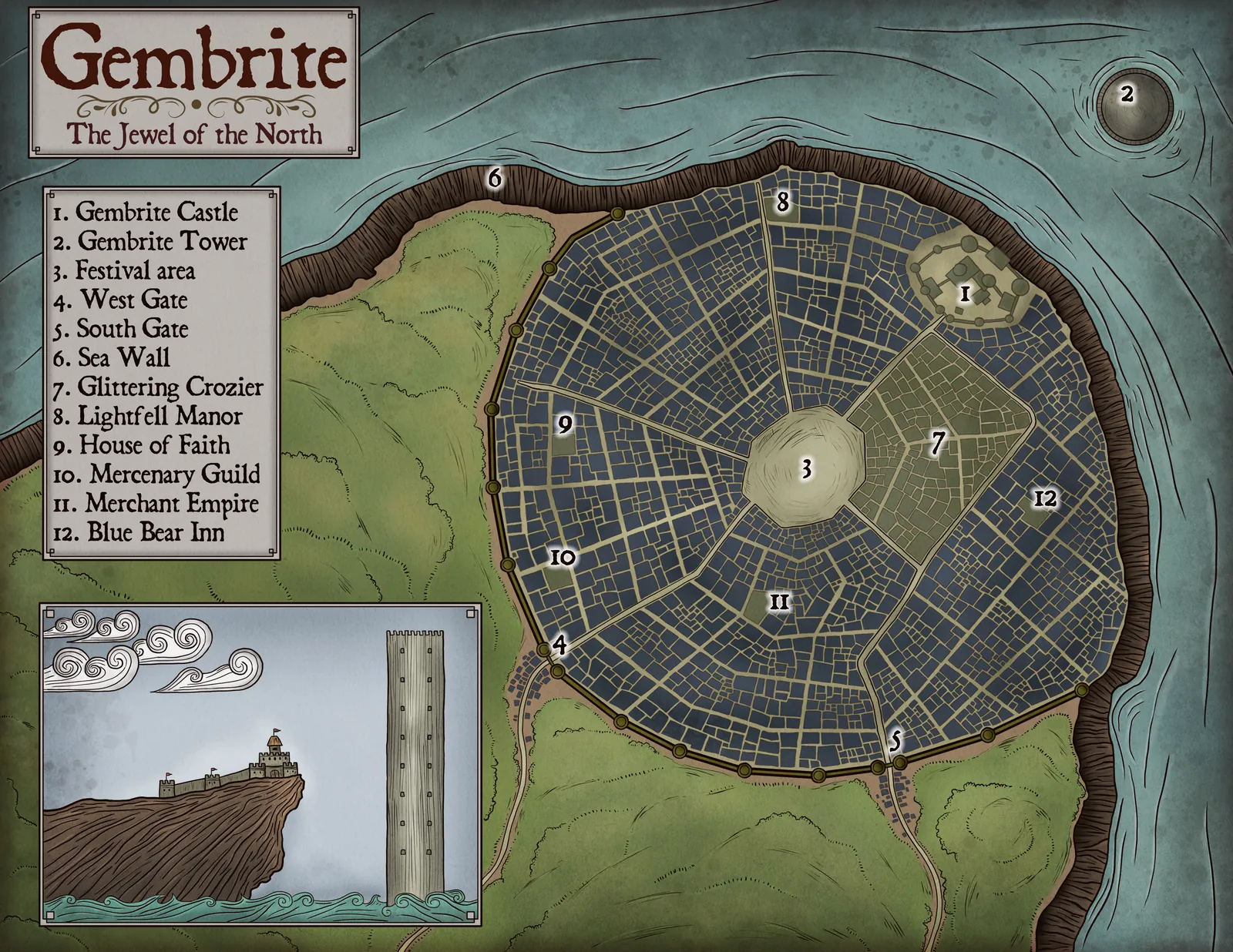 Additionally, the circular city wall encloses twelve numbered locations tied to a legend. Street layouts define districts from Gembrite Castle to the Blue Bear Inn. A decorative inset shows the clifftop tower against stylized clouds.