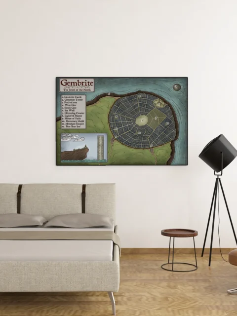 This map gives dungeon masters a coastal settlement with tactical clarity. It speaks to TTRPG players who run seafaring campaigns and port city encounters. The gembrite fantasy battle map canvas print serves session prep and wall display, particularly for D&D 5e coastal arcs.