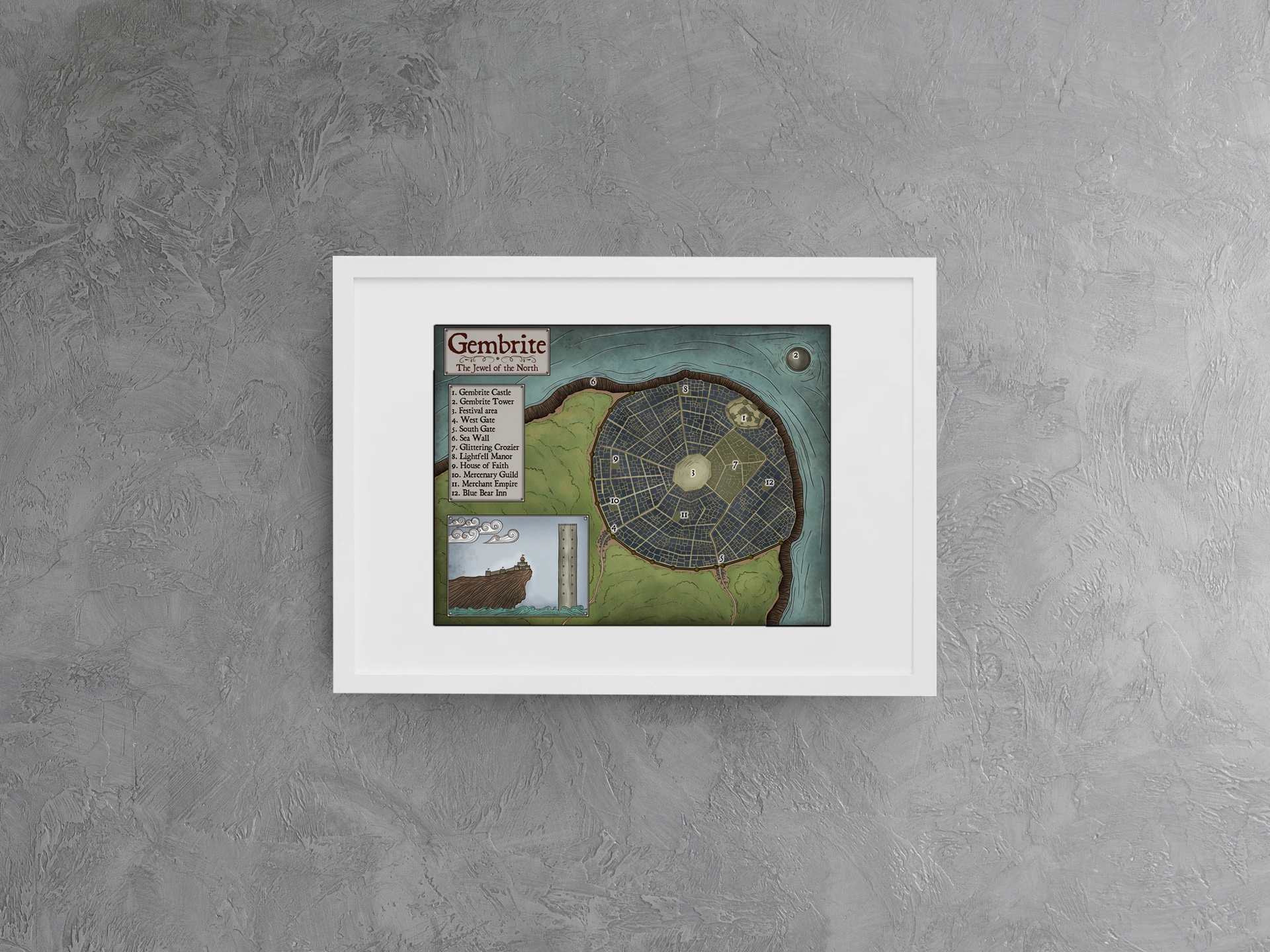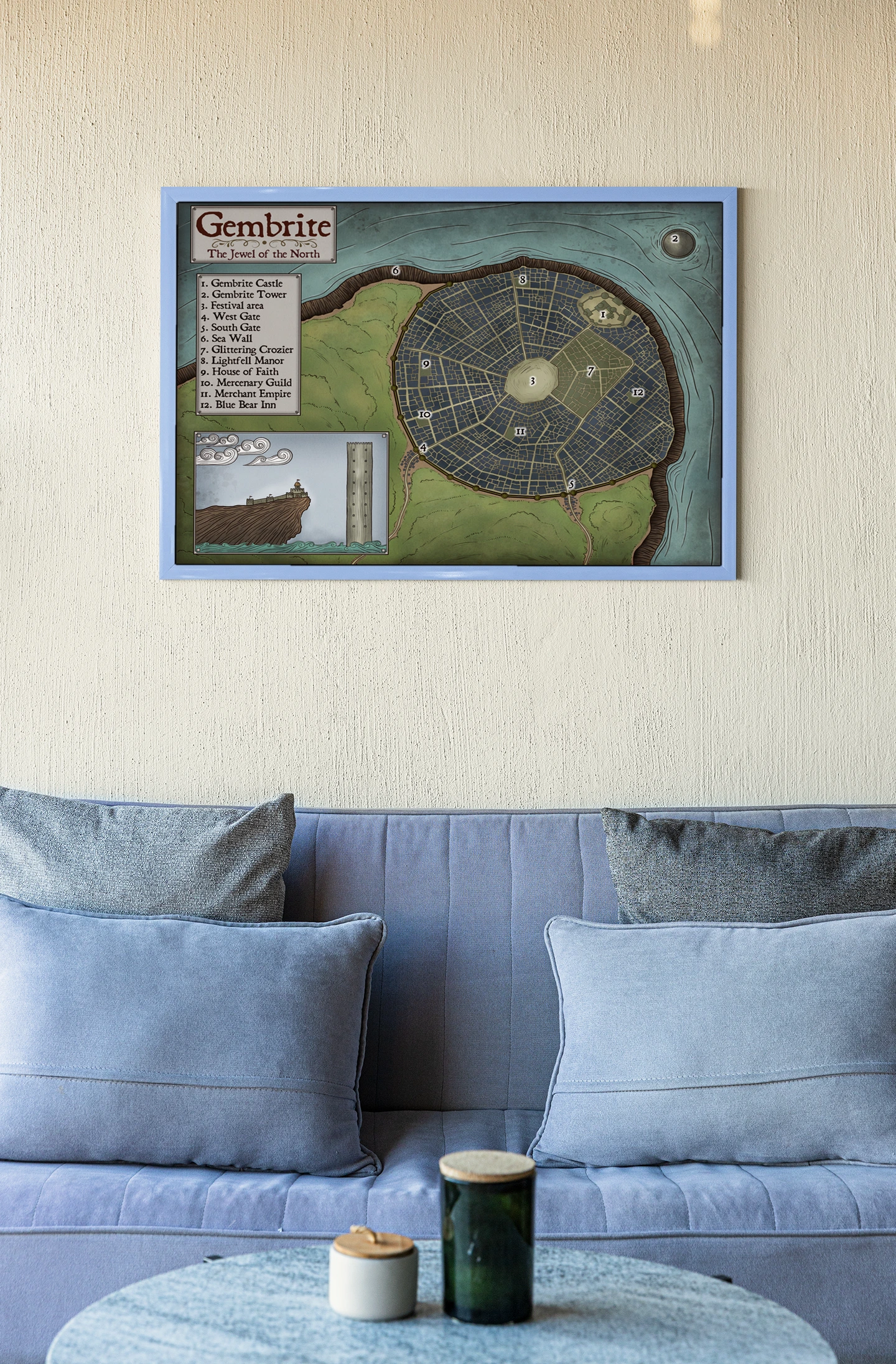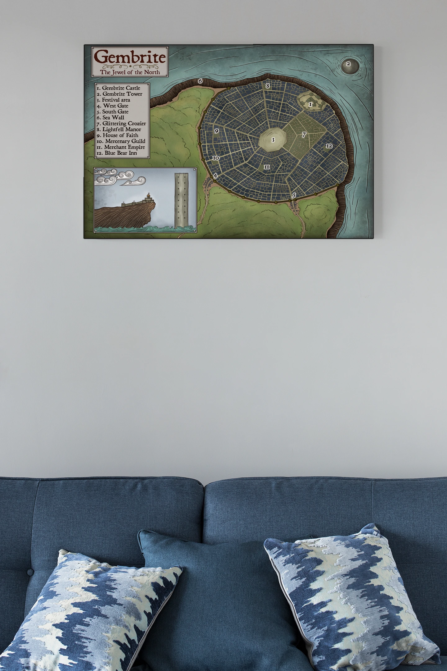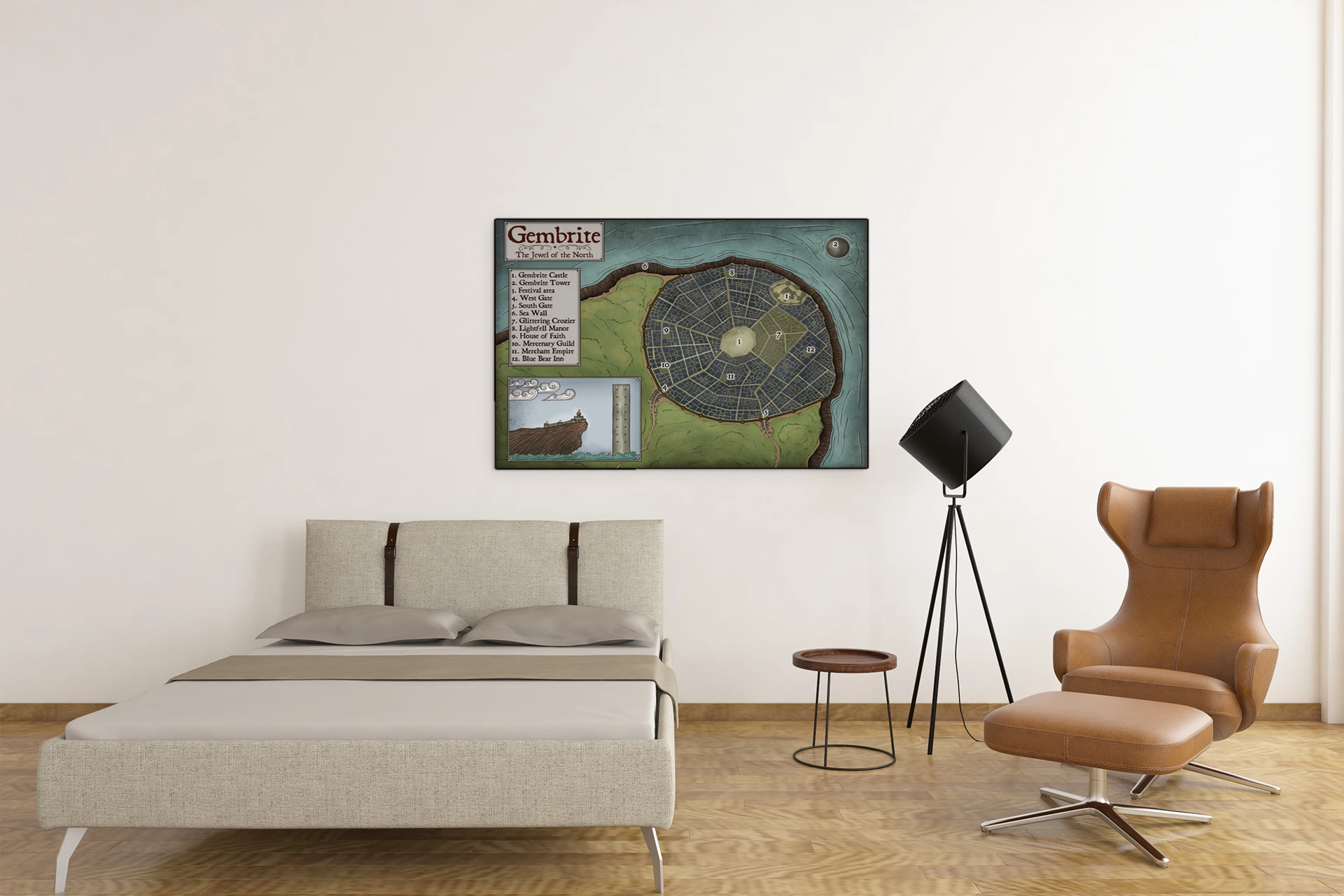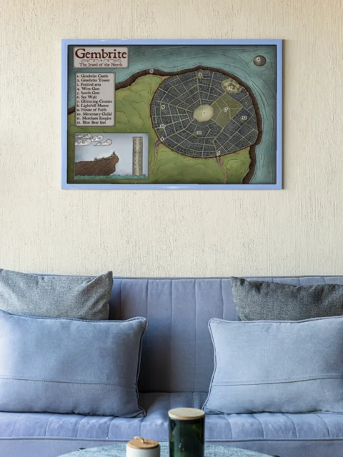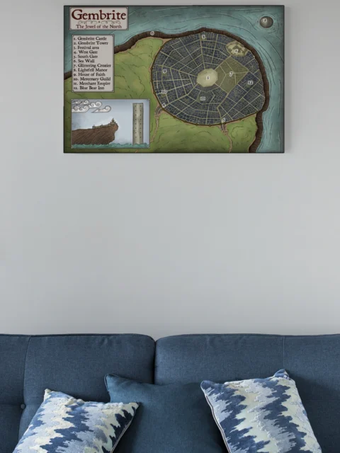 Gembrite sits on a fortified promontory between green land and blue harbor. This gembrite fantasy battle map canvas print captures a walled settlement with numbered districts and a clifftop tower. The color palette runs muted blues, greens, and tan across urban blocks.