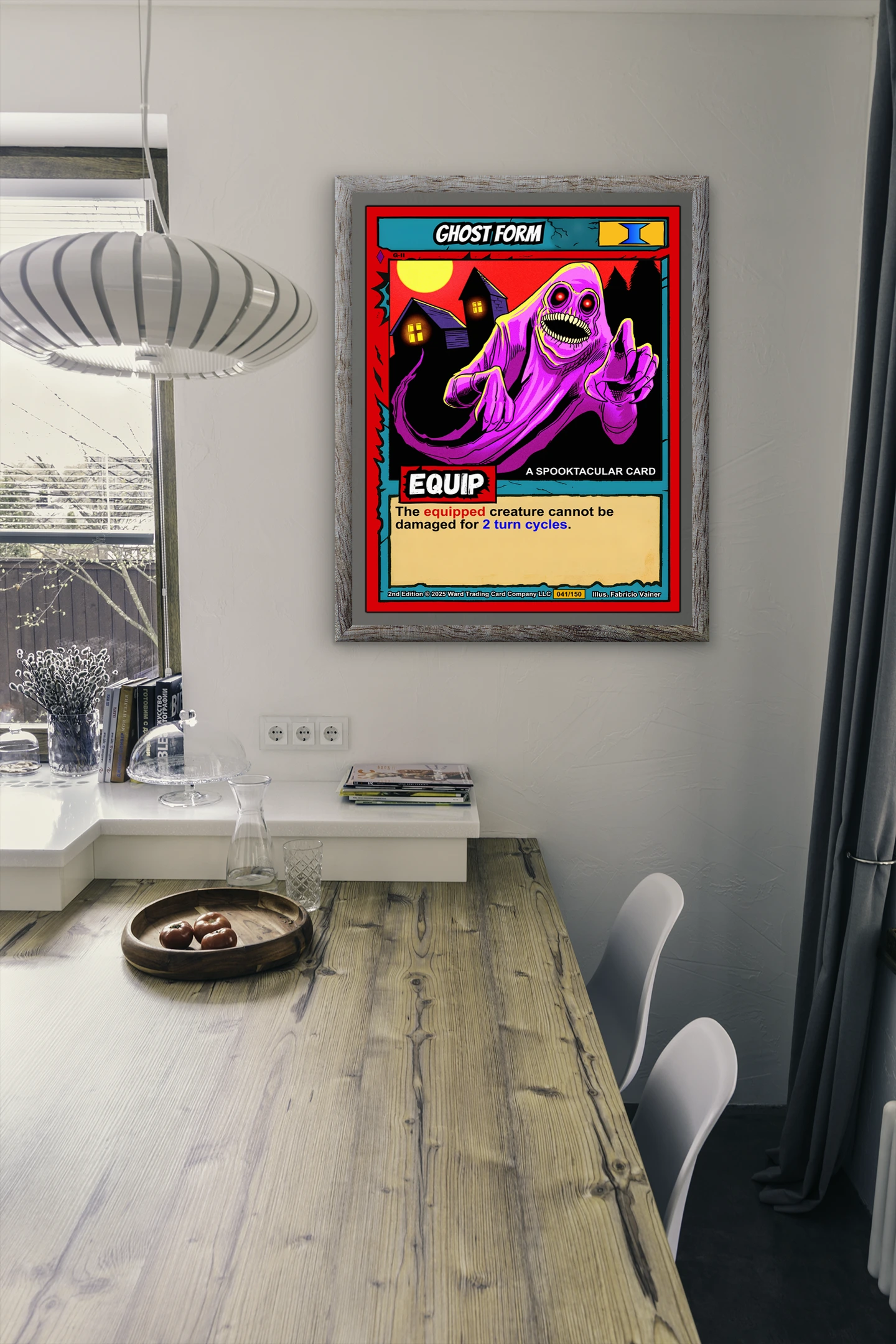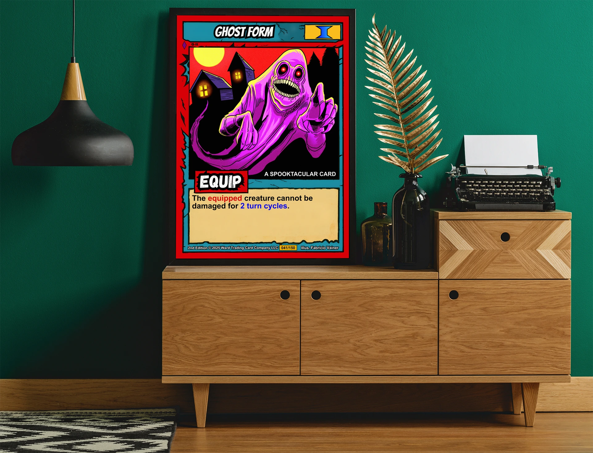 Ghost Form Fantasy Canvas Print from Ward TCG: A grinning pink-purple specter with red eyes reaches from a moonlit haunted landscape in bold retro colors.