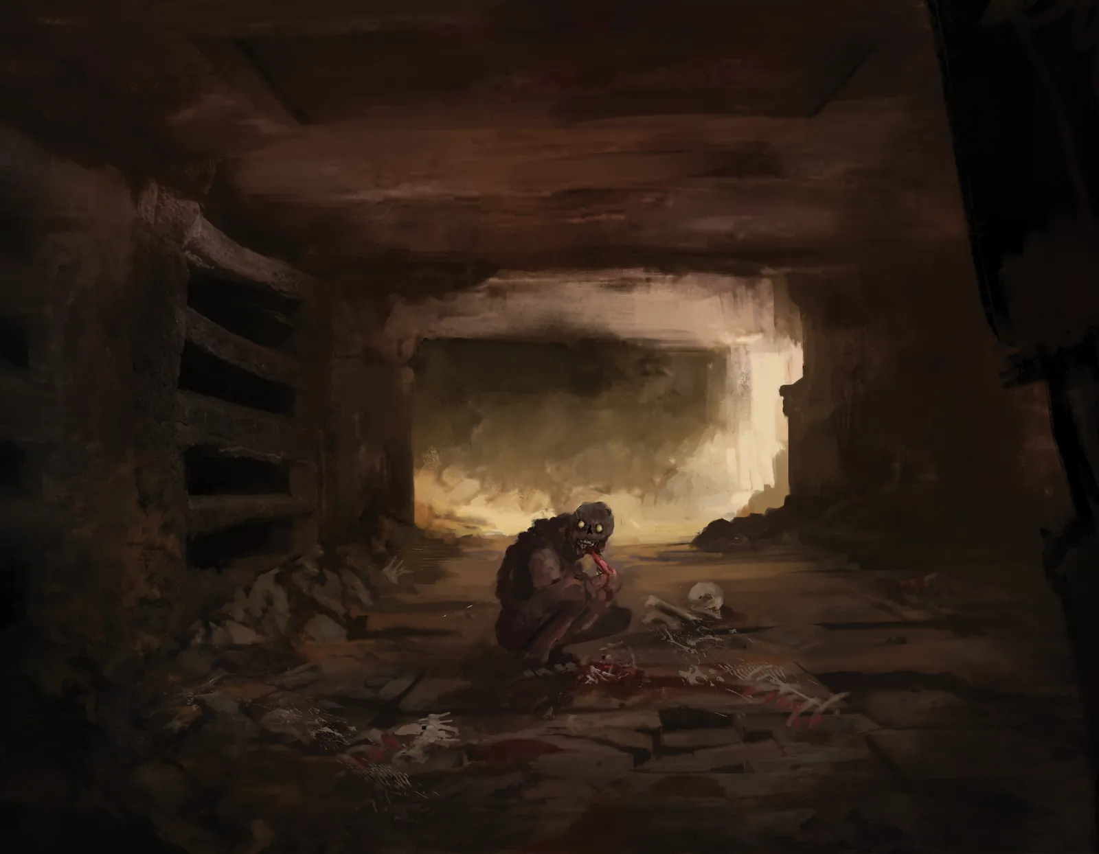 Ghouls immediately sets a grim tone, as Ghouls fantasy canvas artwork draws focus to a lone creature crouched in a ruined passage. Moreover, the confined tunnel heightens tension and directs attention inward. However, the soft glow ahead suggests depth beyond the darkness.