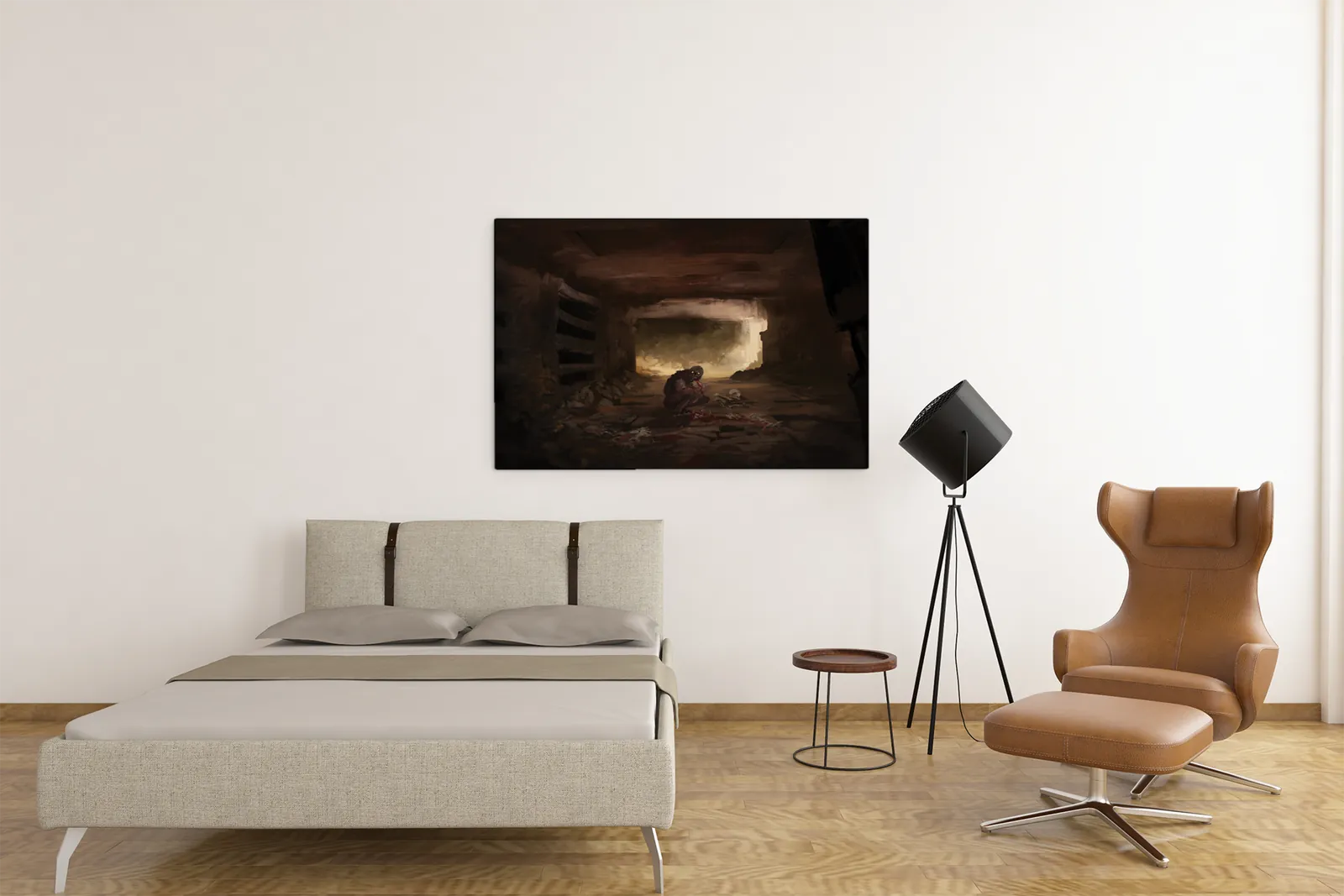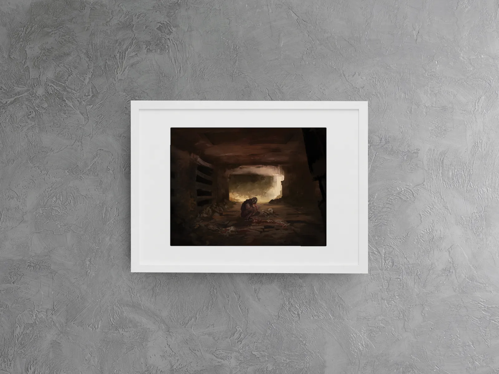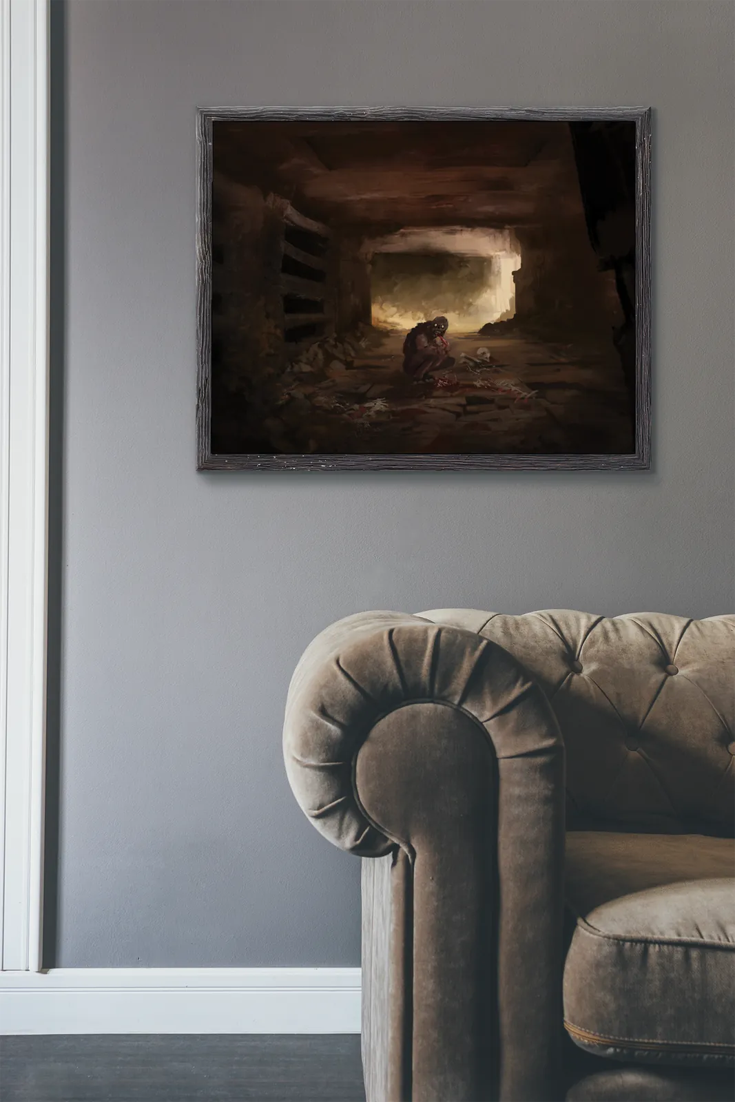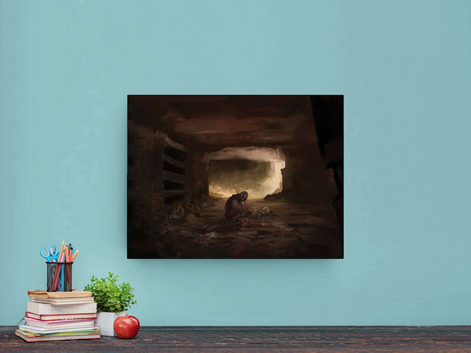 Finally, muted earth tones dominate the palette. Therefore, shadows feel heavy without overwhelming detail. Moreover, subtle highlights guide the eye through the corridor. As a result, Ghouls fantasy canvas artwork delivers atmosphere through restraint rather than excess.