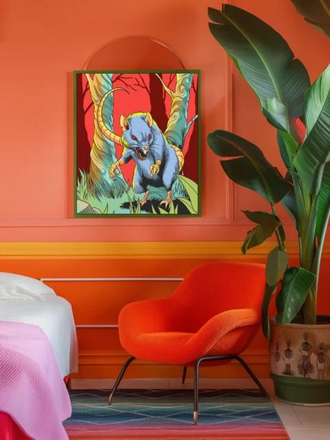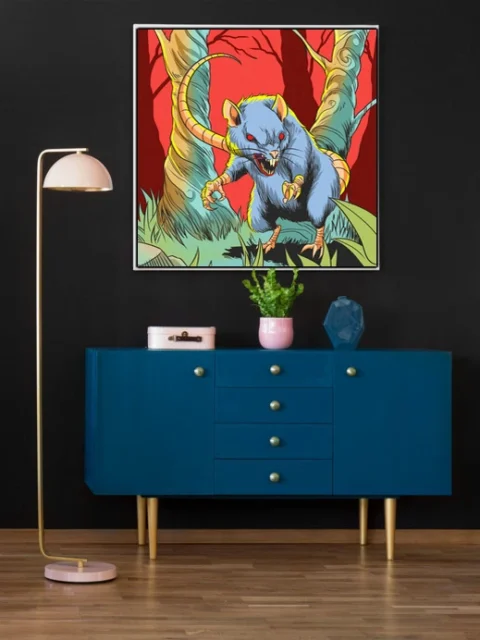 A monstrous anthropomorphic rat creature crouches with jaws wide and fangs exposed. This giant rat art trading card art canvas print presents Fabricio Vainer’s horror-pulp illustration as a standalone piece. Notably, the segmented pink tail curves dramatically behind the snarling beast.