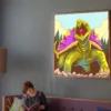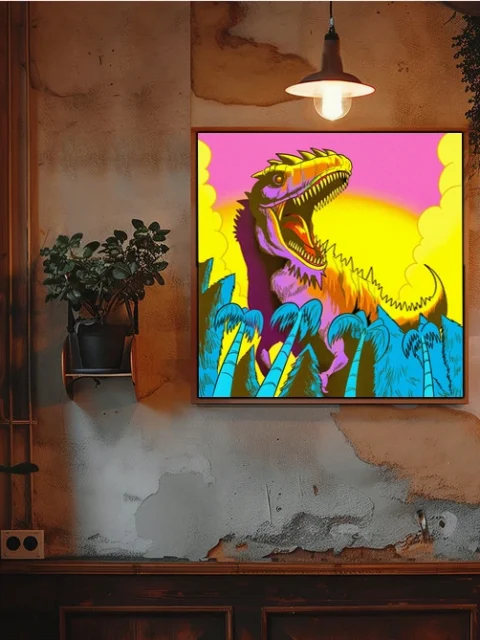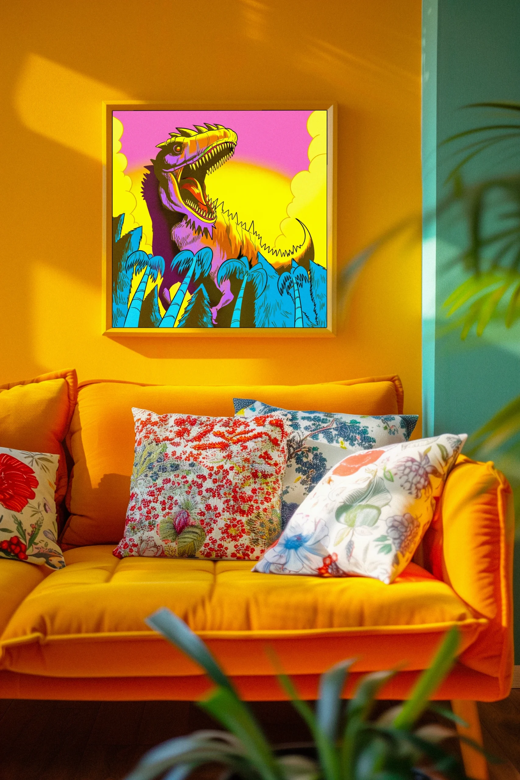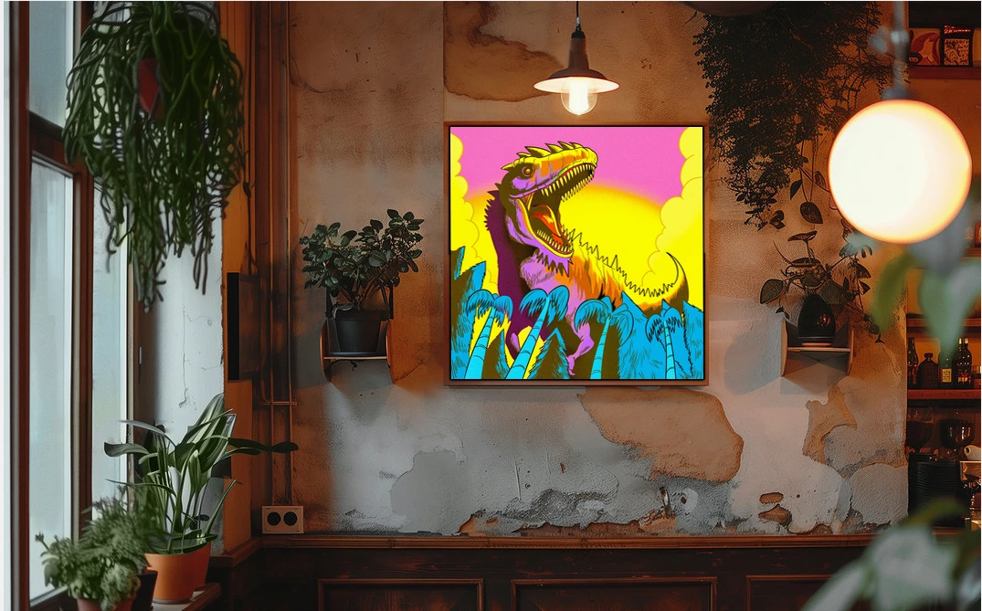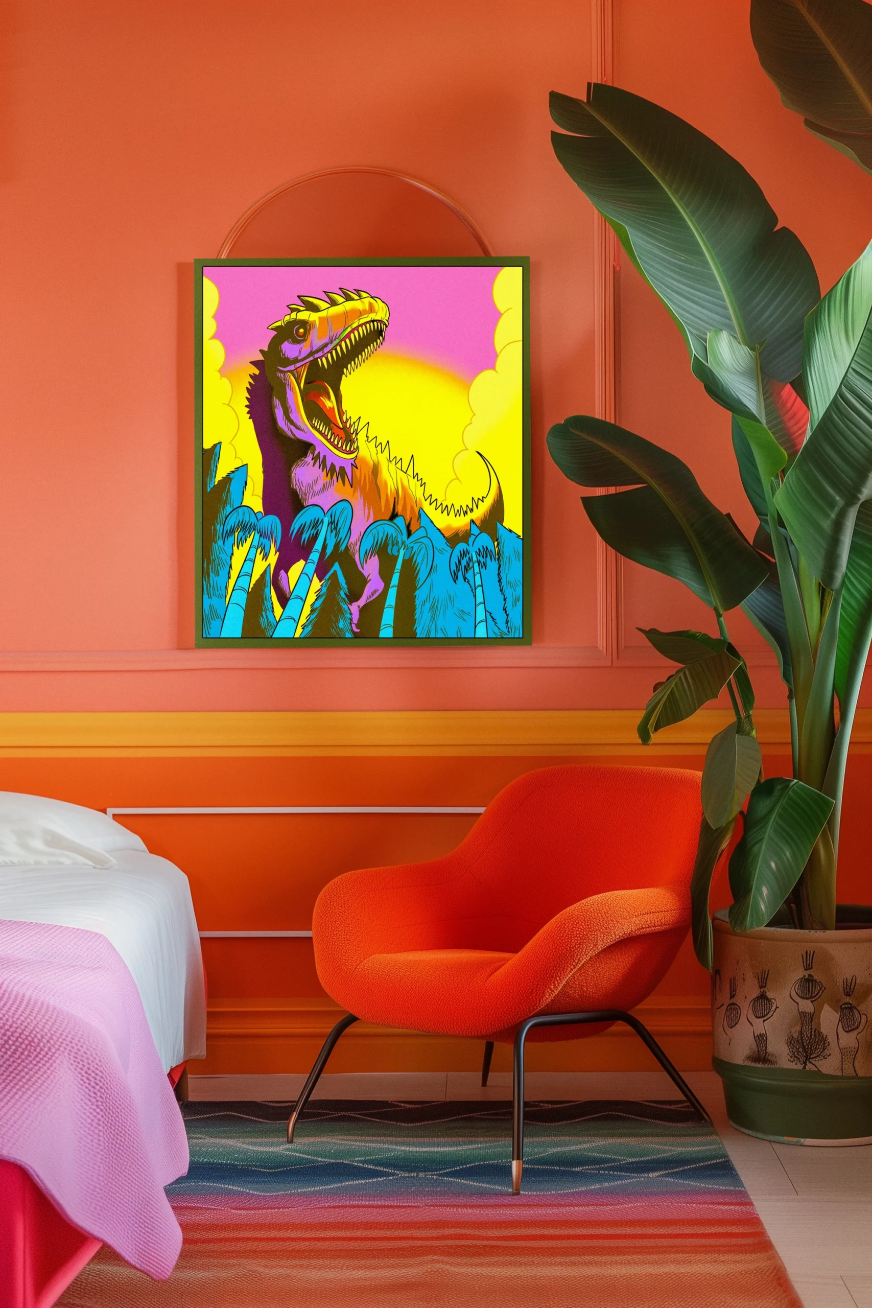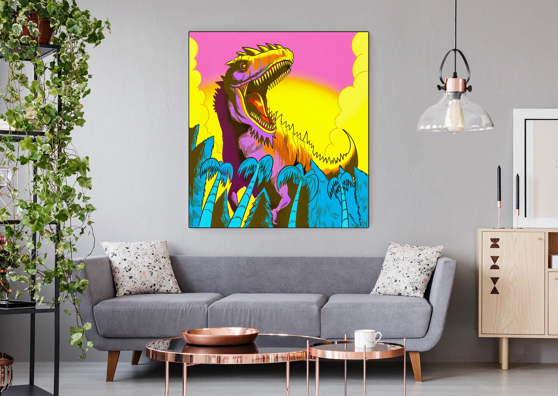 The print suits game rooms where prehistoric aggression and pop-art sensibility intersect on collector walls. Additionally, the high-contrast palette holds visibility in spaces with ambient or accent lighting.