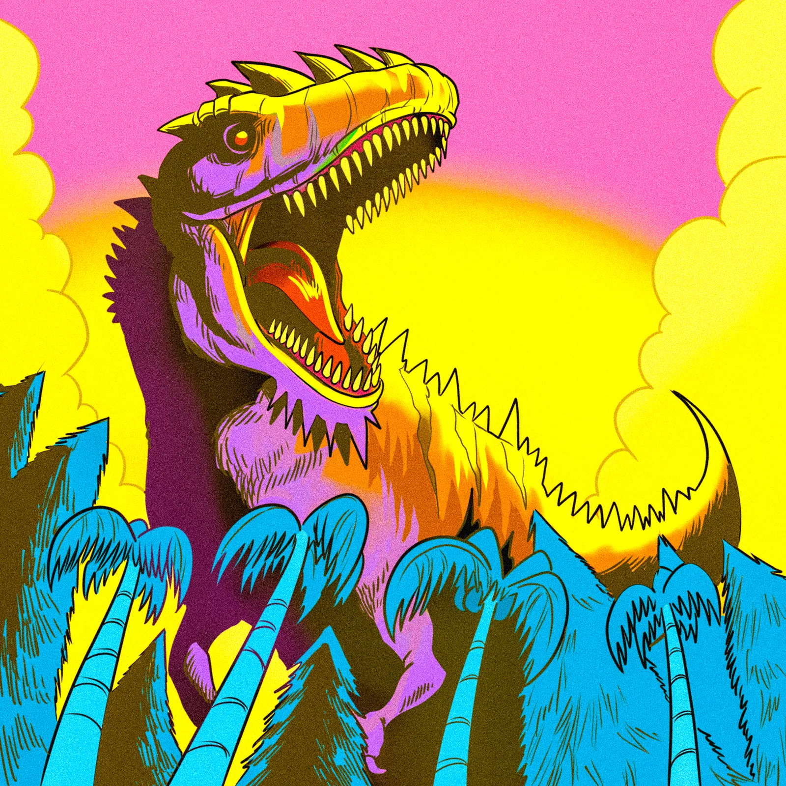 Additionally, the composition centers the creature against a hot pink sky and enormous yellow sun. Cyan-blue palm trees anchor the foreground in stylized silhouette. The palette uses flat fills with heavy black outlines, moreover evoking retro pulp cover art.