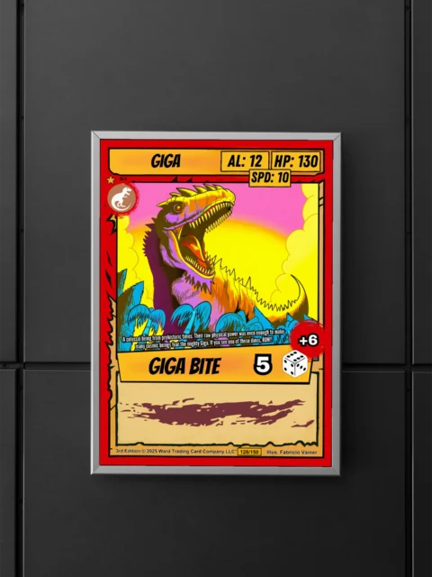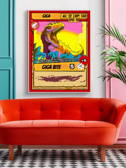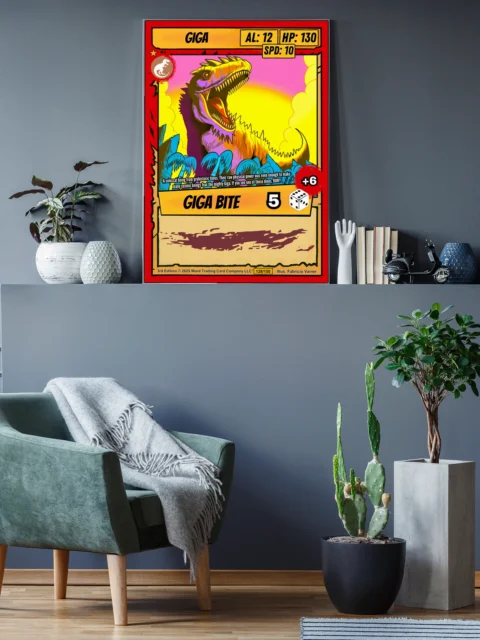 At room scale, the heavy black outlines and high-saturation palette command attention from across the space. Ward TCG collectors recognize the retro gaming aesthetic and cel-shaded illustration technique. This giga trading card canvas print appeals to dinosaur enthusiasts who grew up with tactile card games.