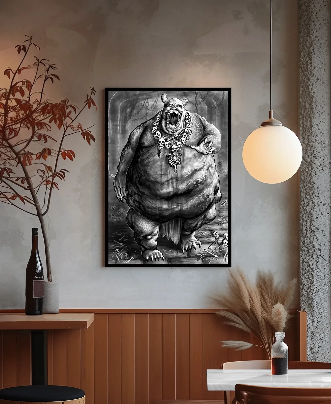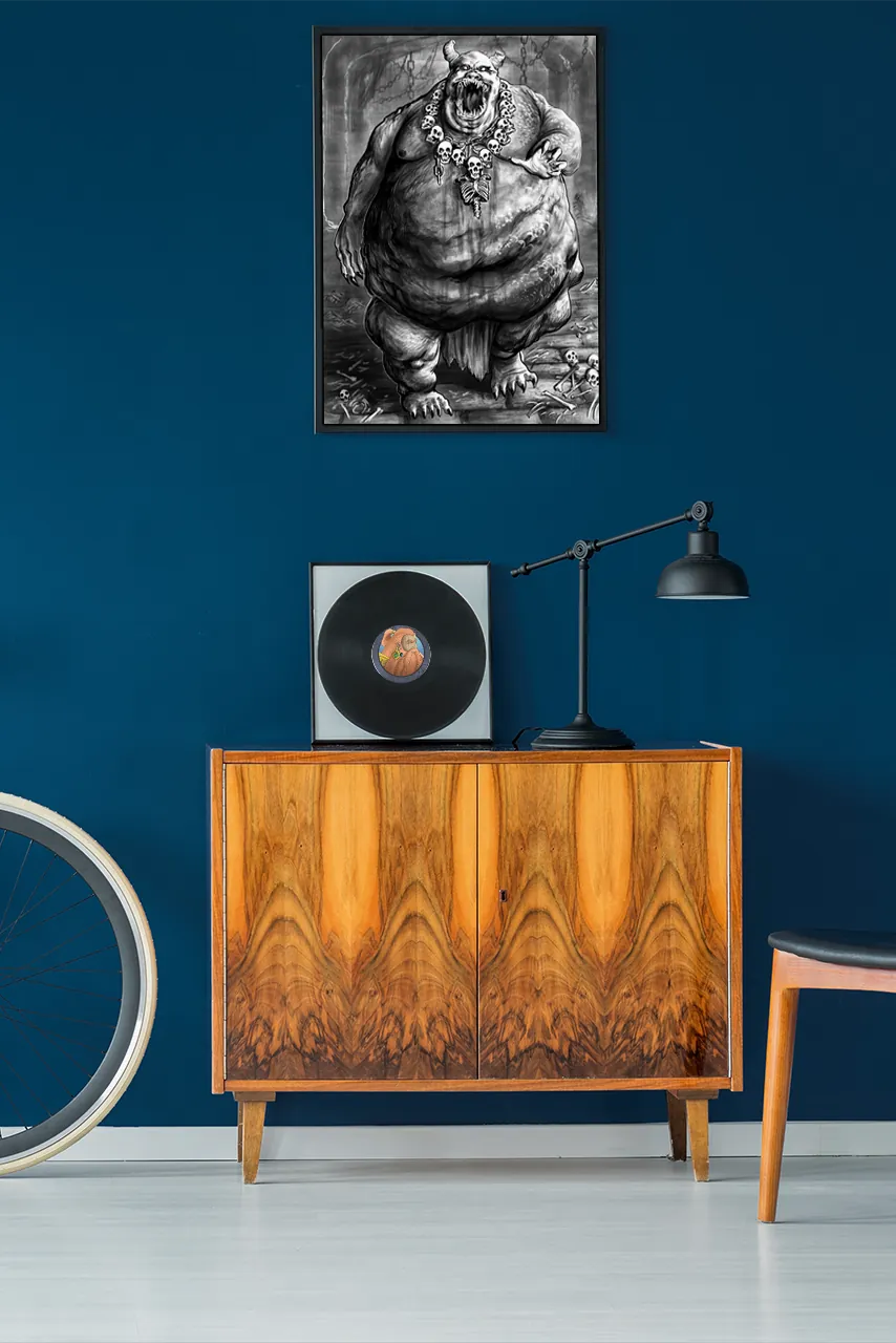 Finally, stark grayscale tones sharpen every fold, scar, and skeletal ornament into raw visual impact. Consequently, Glutton Demon canvas print artwork lands as a brutal statement of corruption and appetite, where horror is defined by mass, proximity, and momentum.