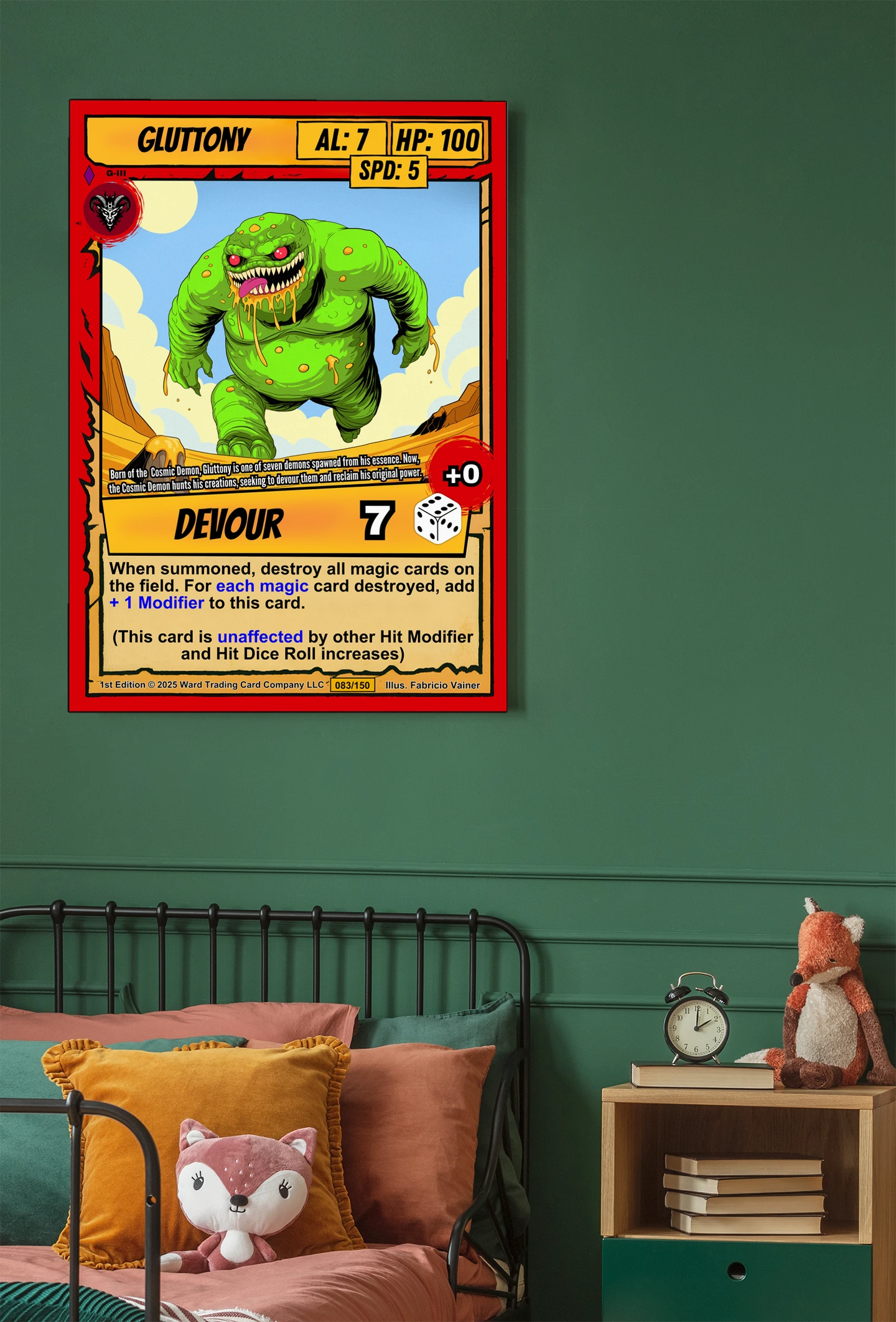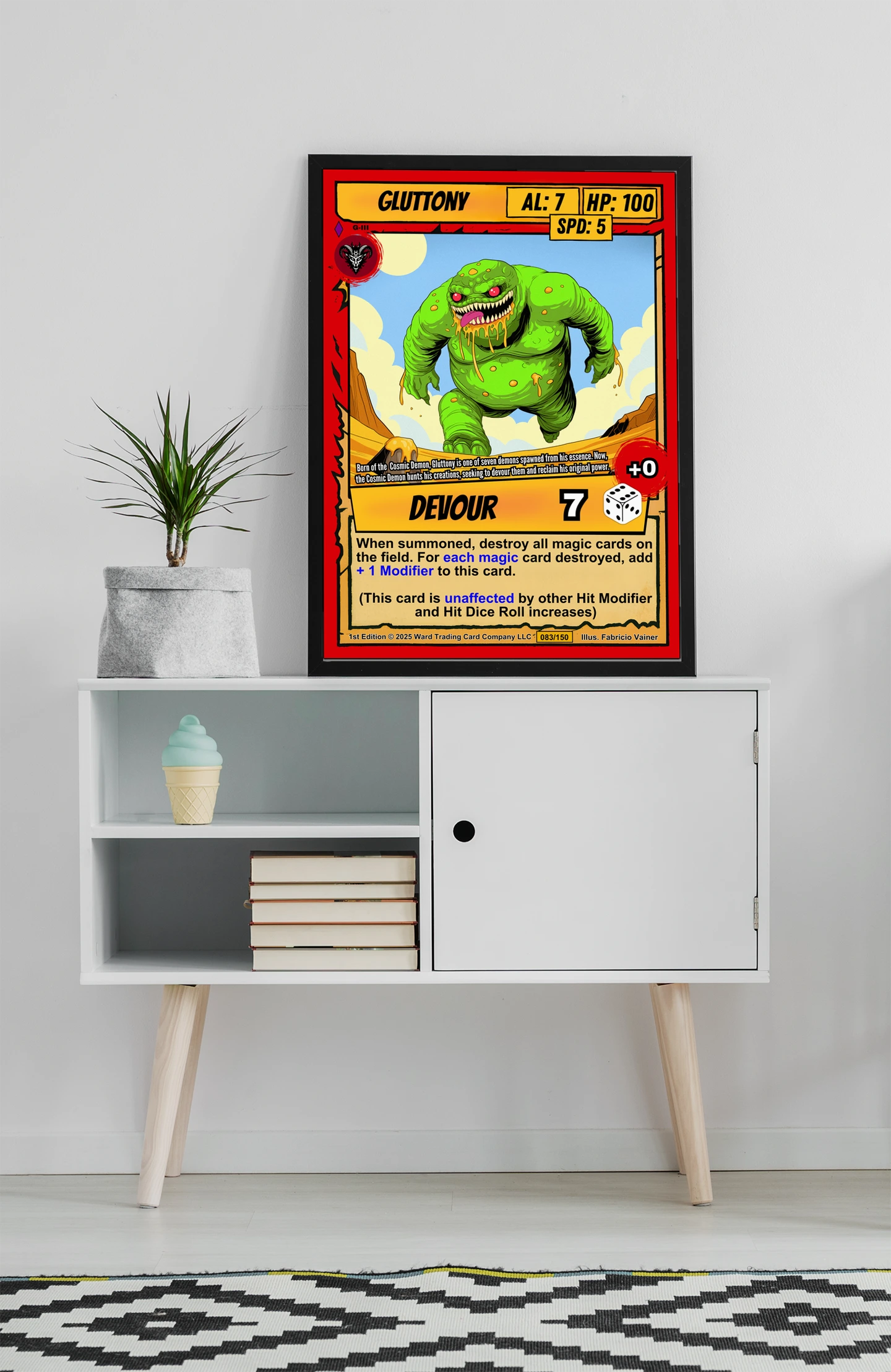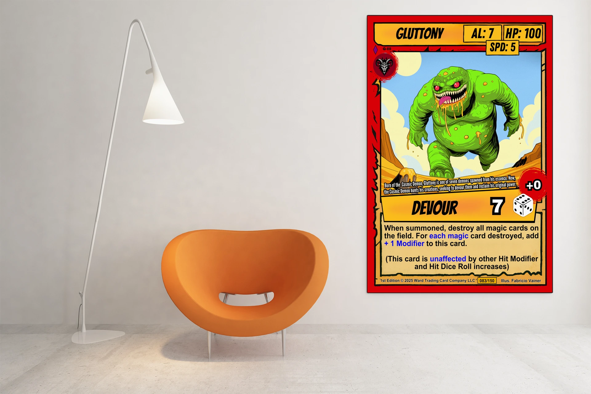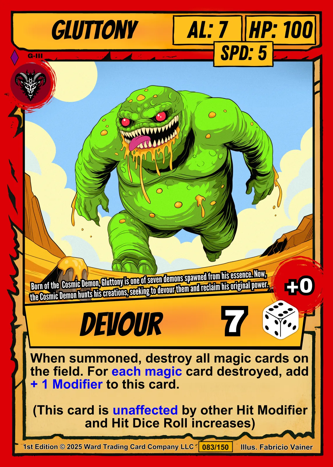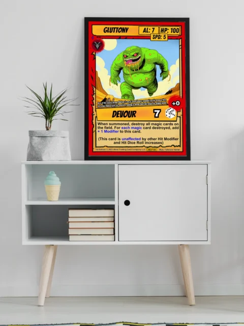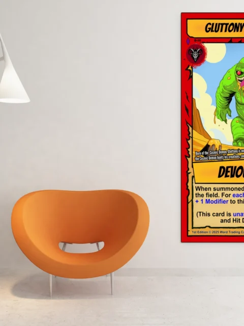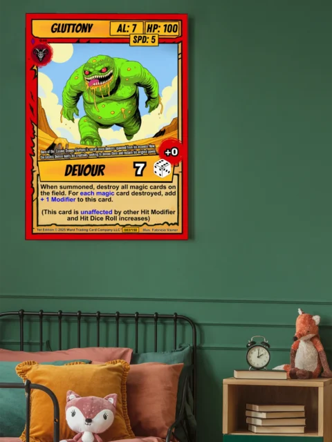 The desert canyon backdrop and cream ability text box read clearly from across the room. Collectors seeking grotesque monster art from the Ward TCG lineup will recognize the signature comic-book linework. This gluttony trading card canvas print delivers the card numbered 083/150 in full detail.