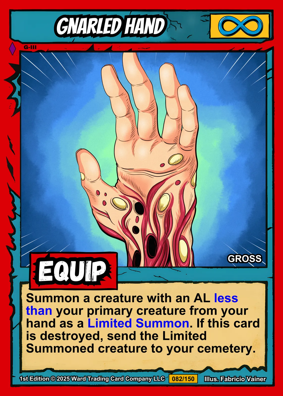 Additionally, the thick red border features jagged black lightning bolt accents along the left edge. A cyan banner displays ‘GNARLED HAND’ in bold white 3D block letters. The yellow stat boxes sit below the artwork alongside the red ‘EQUIP’ label.
