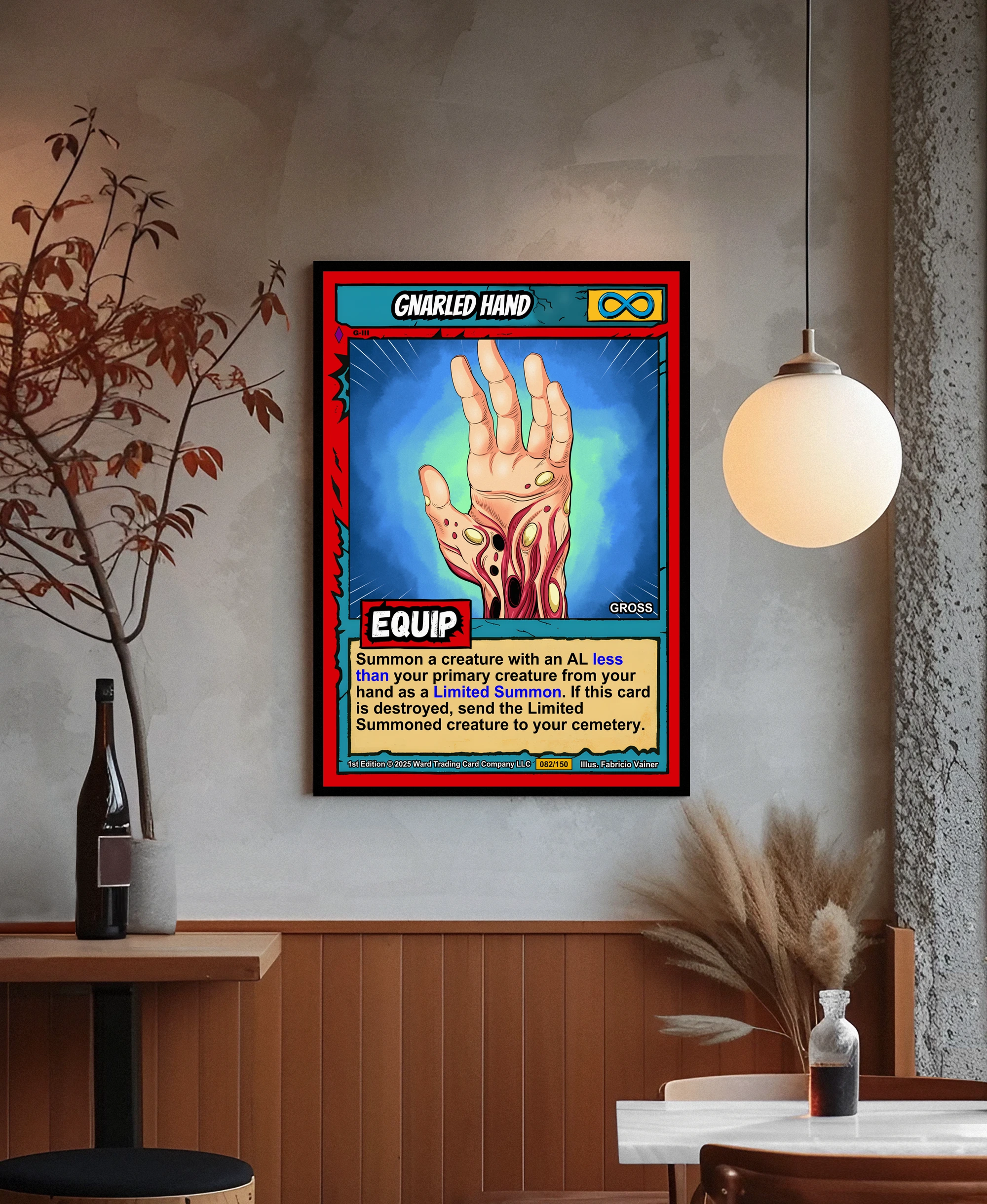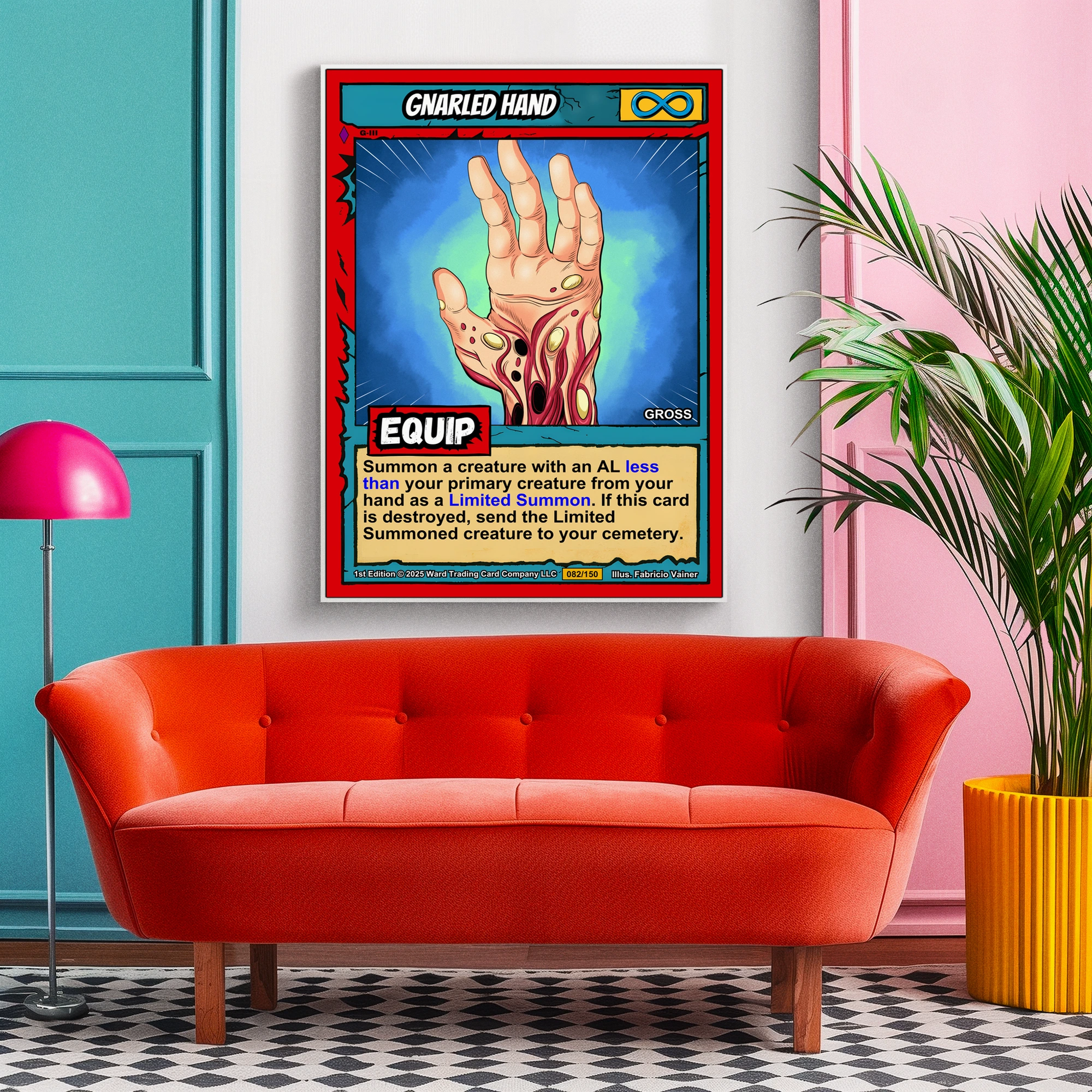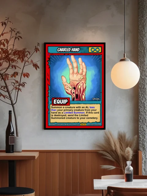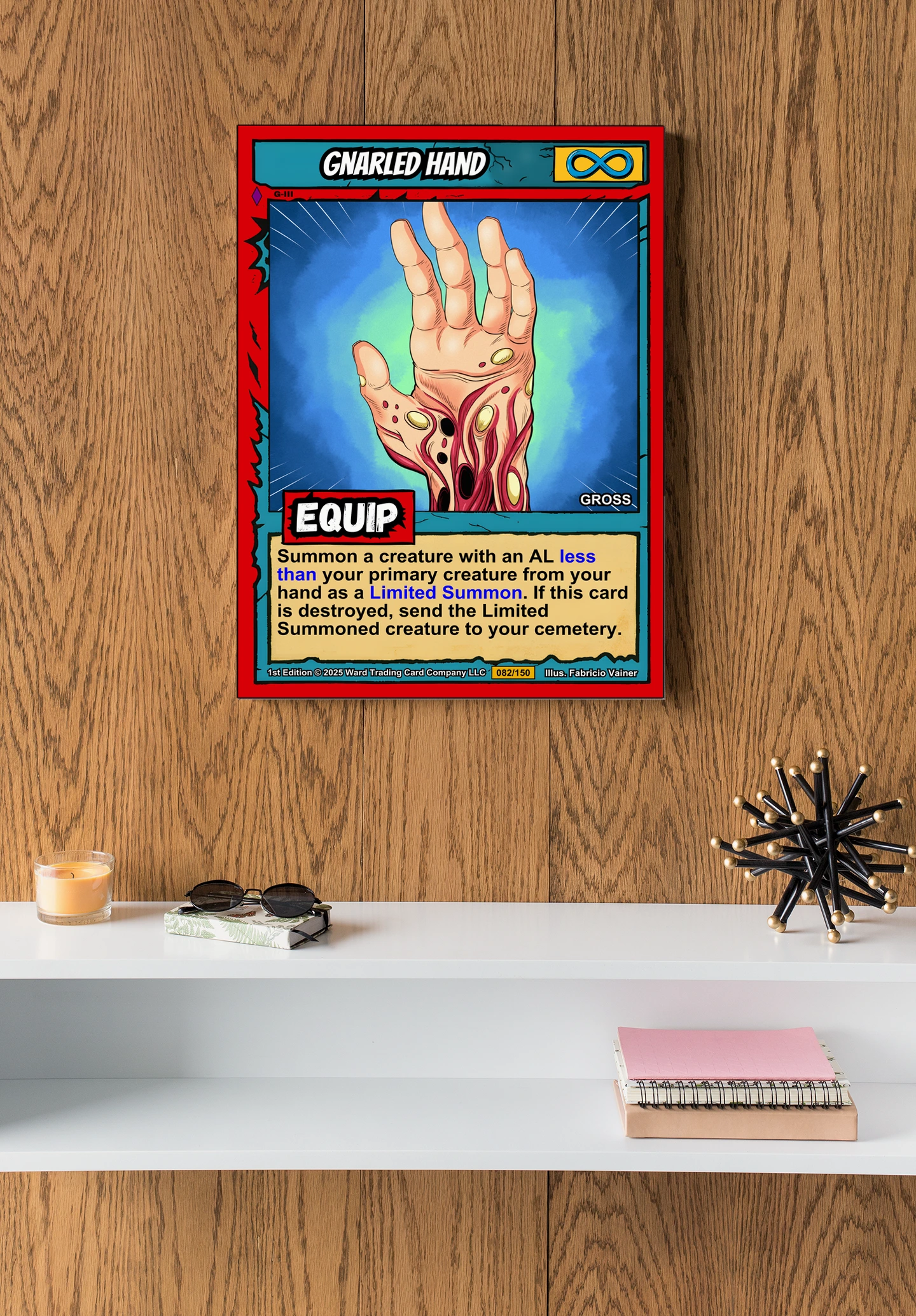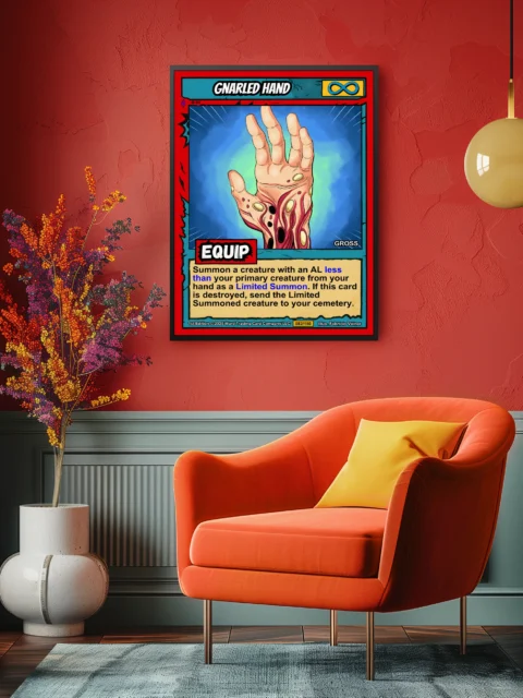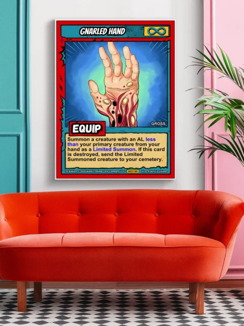 At room scale, the horror grotesque illustration commands attention with disturbing anatomical detail. This gnarled hand trading card canvas print appeals to collectors who appreciate body horror aesthetics. Indeed, the cel-shaded rendering and high contrast make every element instantly readable from across the room.