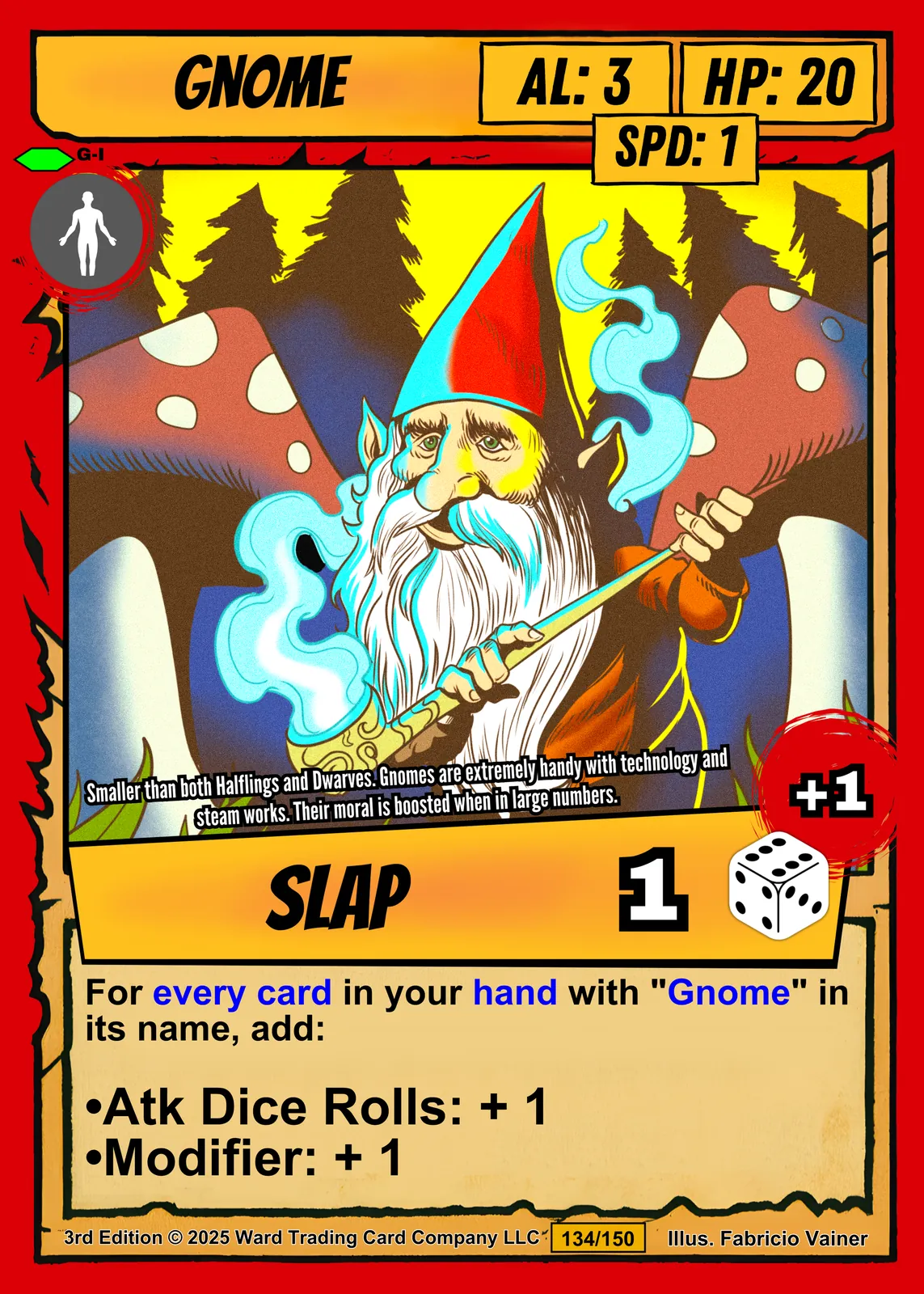 Blue magical flames spiral from a gnome wizard’s staff against spotted mushrooms. Fabricio Vainer’s cel-shaded illustration brings this gnome trading card canvas print vivid dimension. The golden border frames his red pointed hat perfectly.