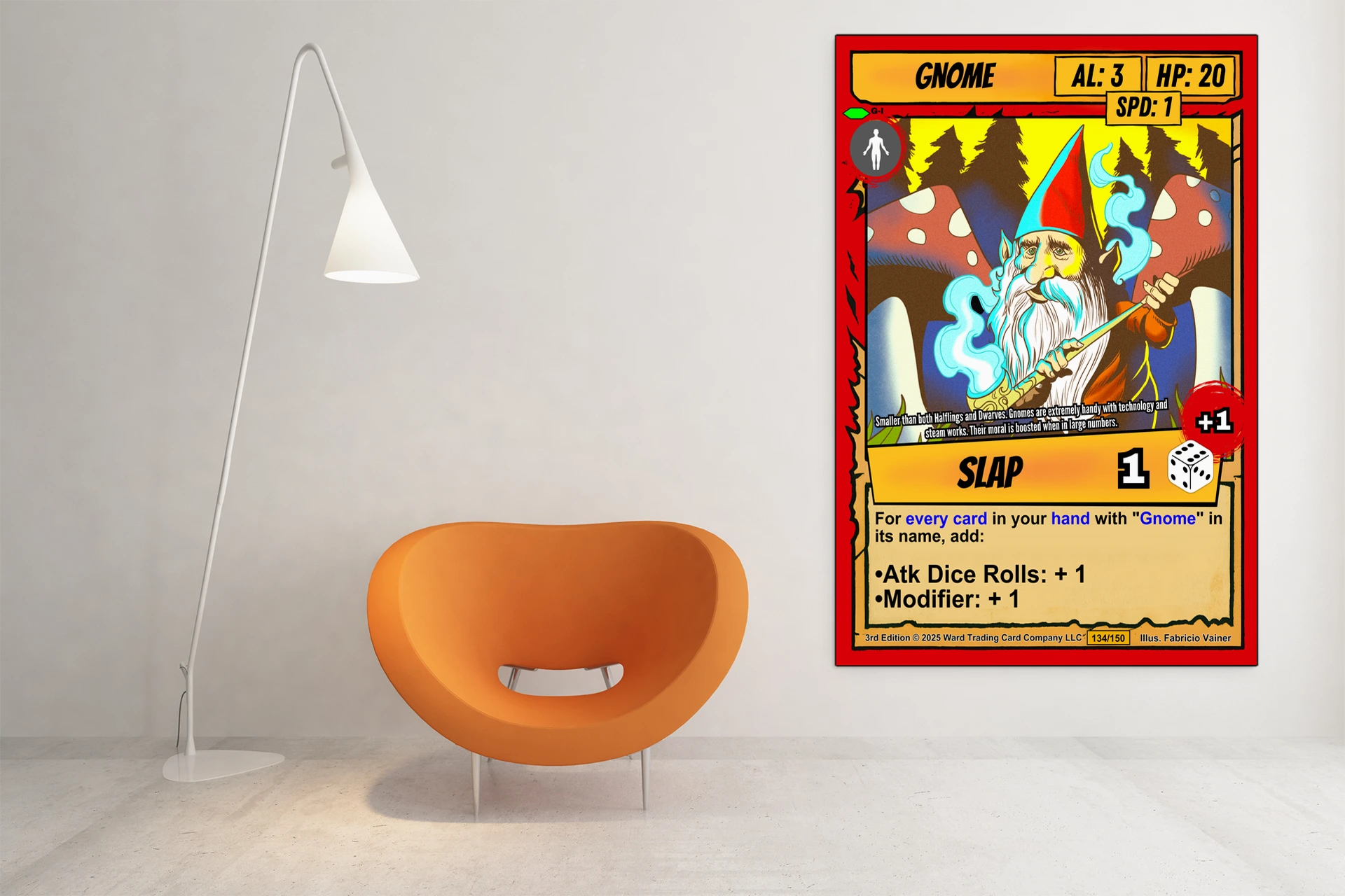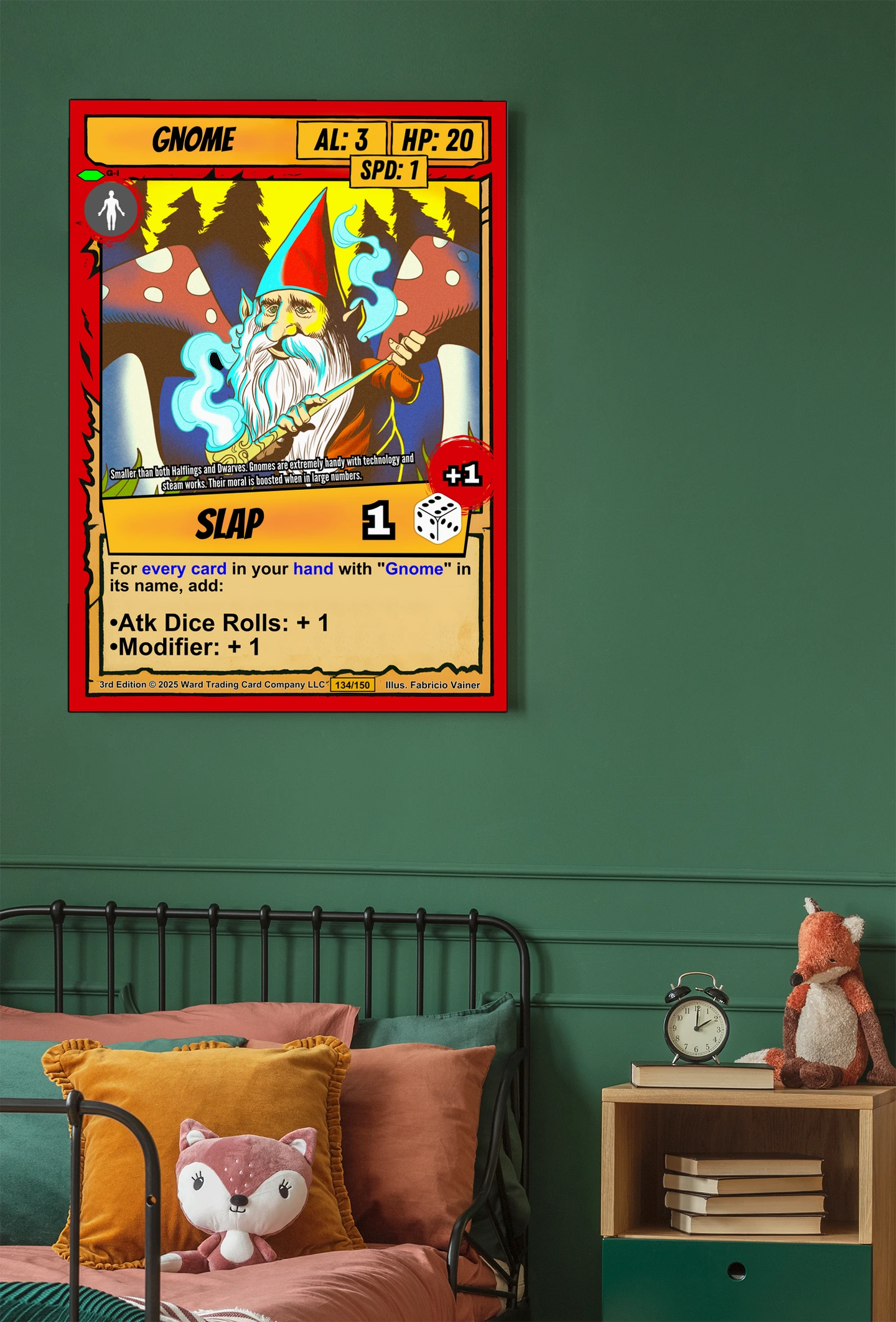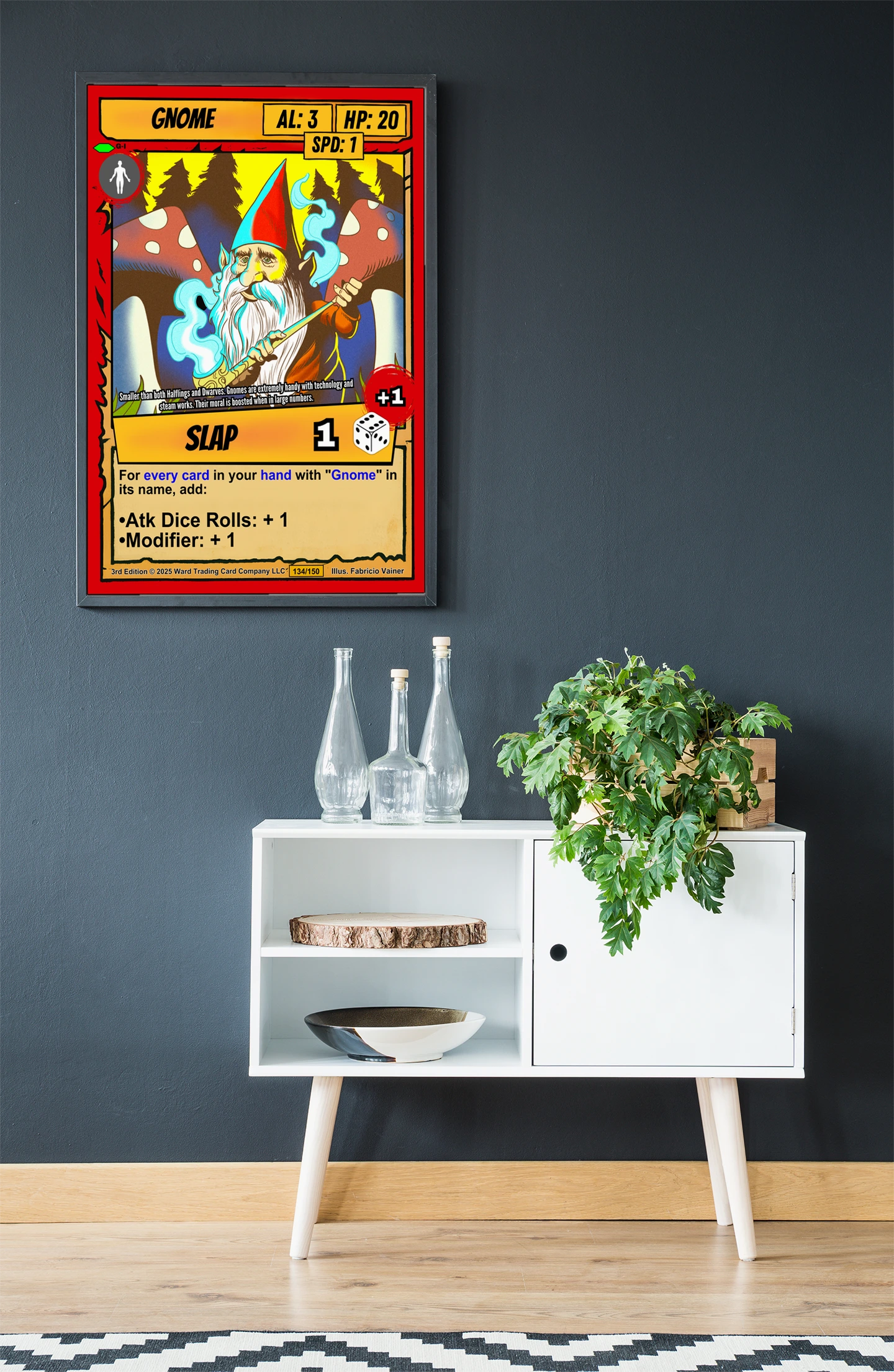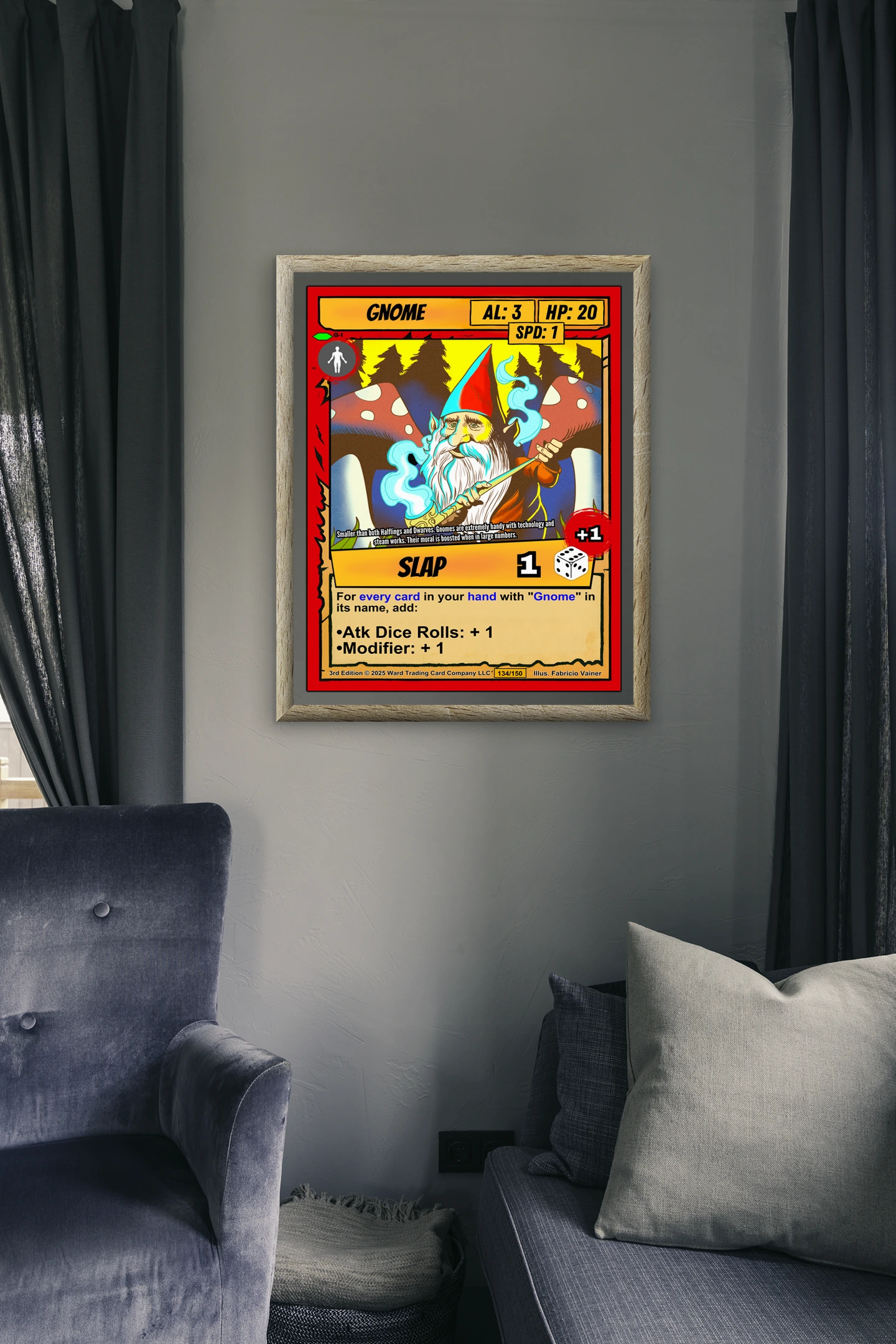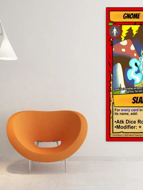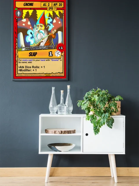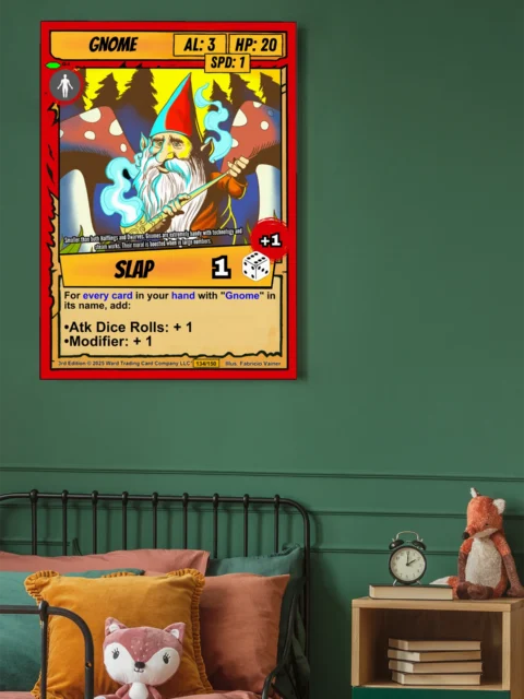 Canvas texture gives Vainer’s bold linework physical presence that screens cannot match. TCG collectors and fantasy enthusiasts recognize quality when they see it. This gnome trading card canvas print particularly appeals to those who value craftsmanship.