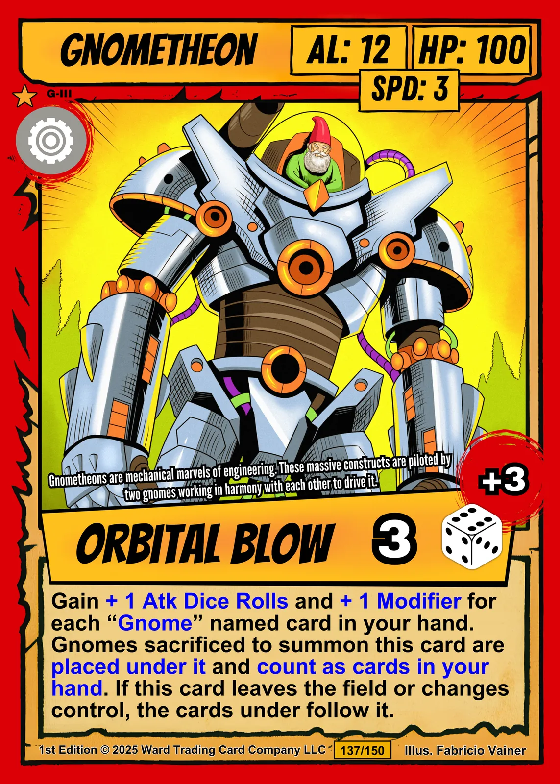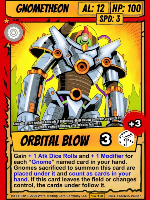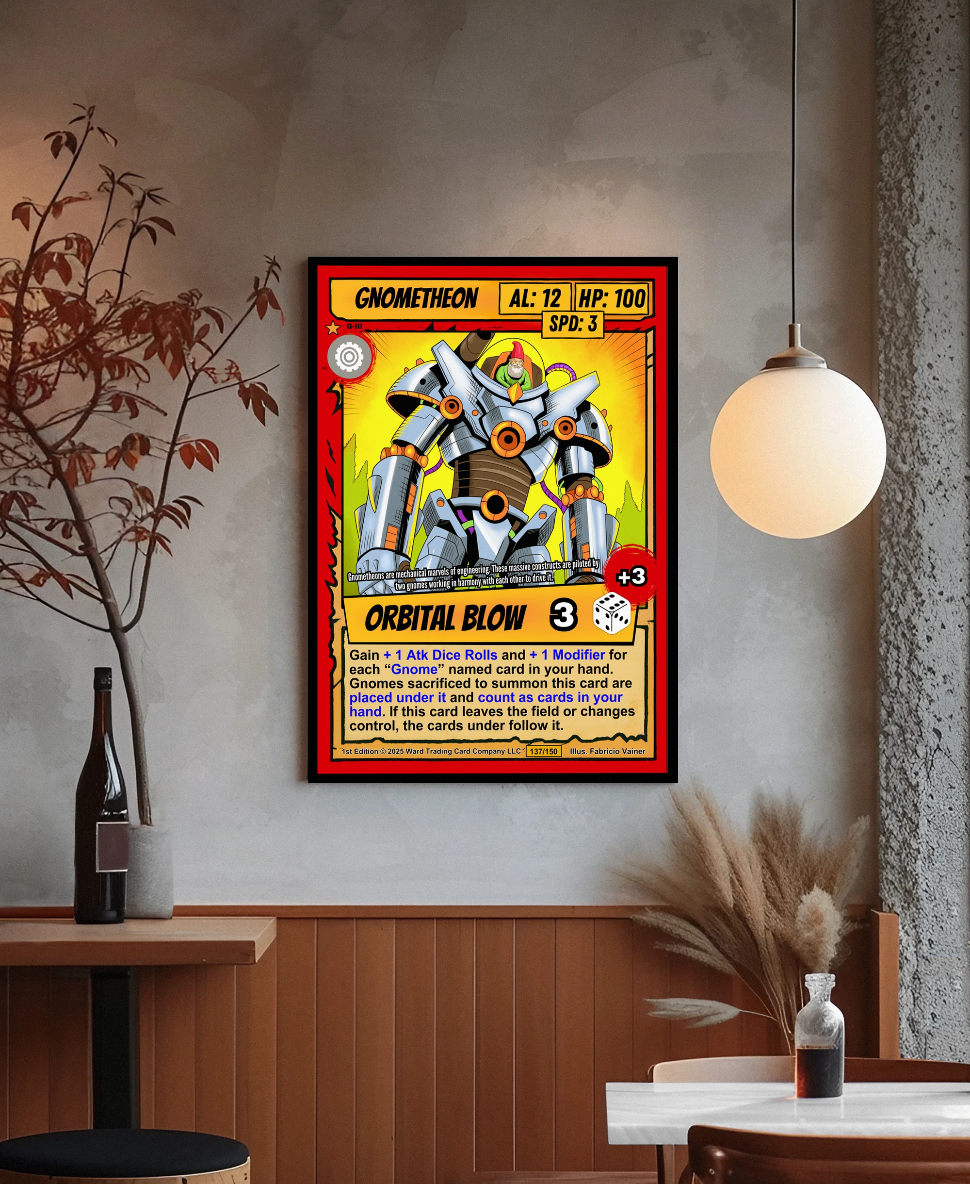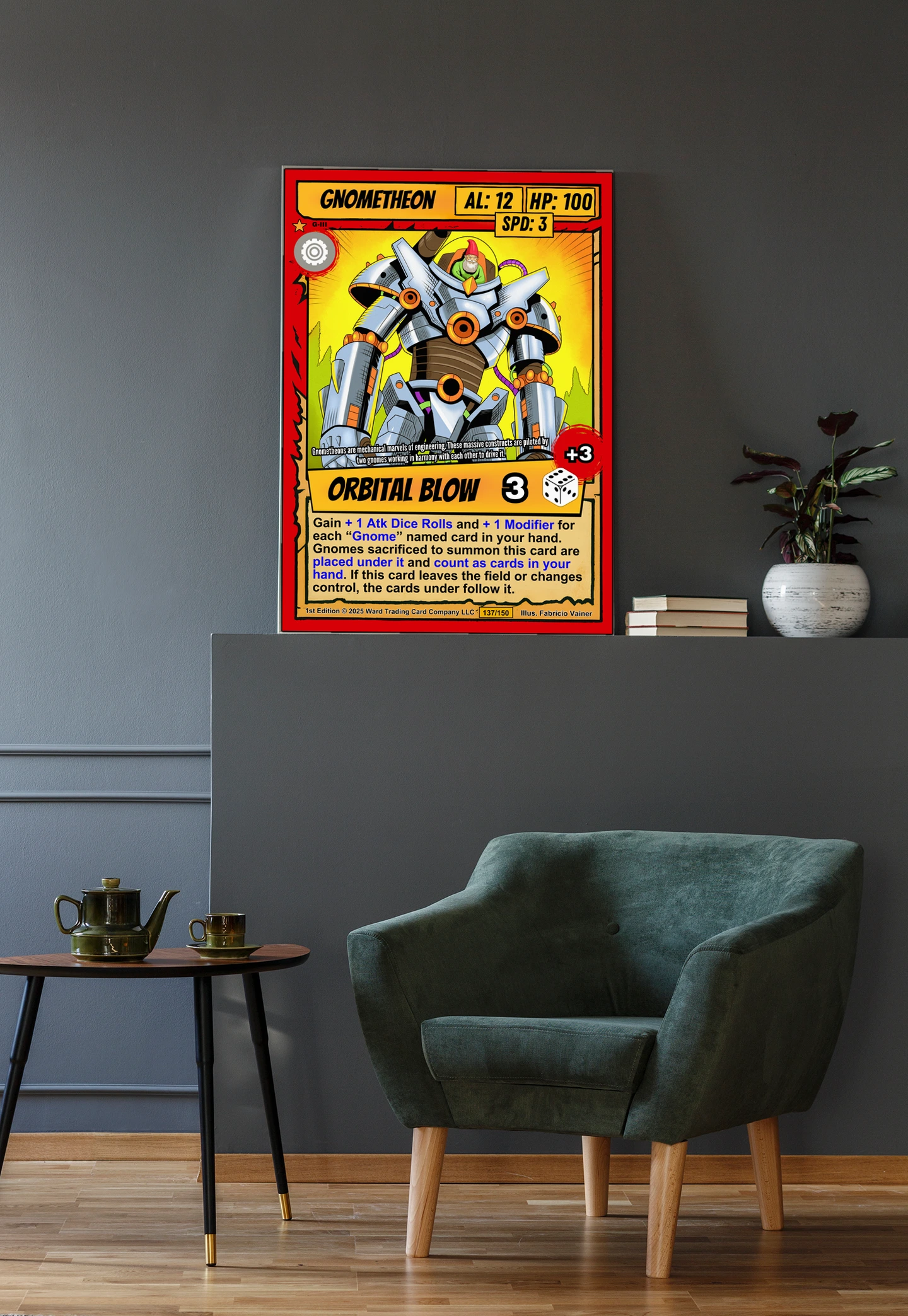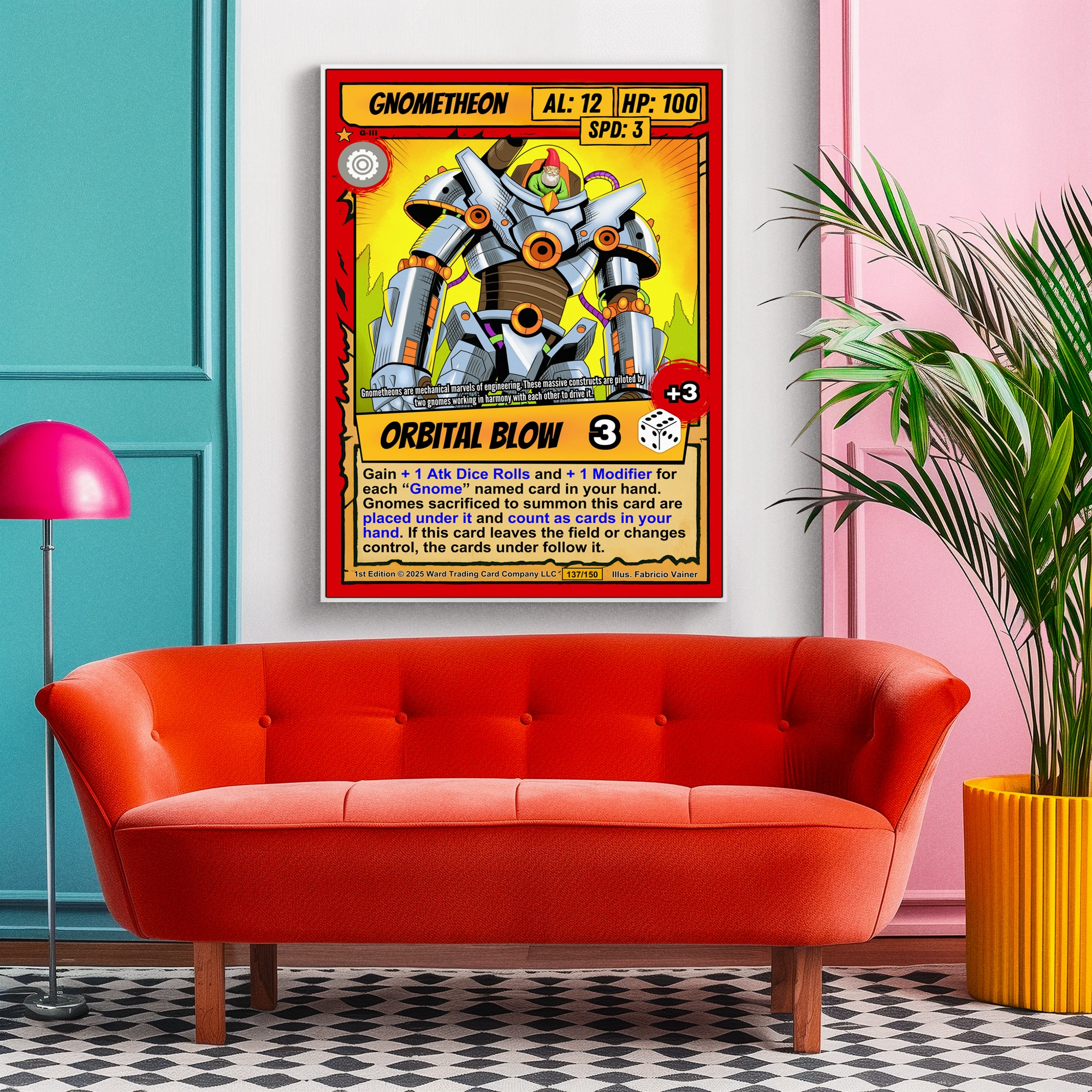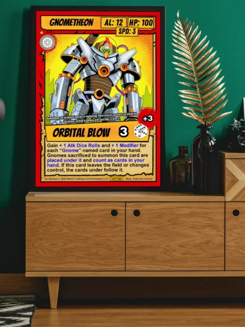 Ward TCG collectors recognize the cel-shaded linework and pop art palette immediately. This gnometheon trading card canvas print reads clearly from across the room. The comic book illustration style appeals to mecha fans and card game collectors alike.
