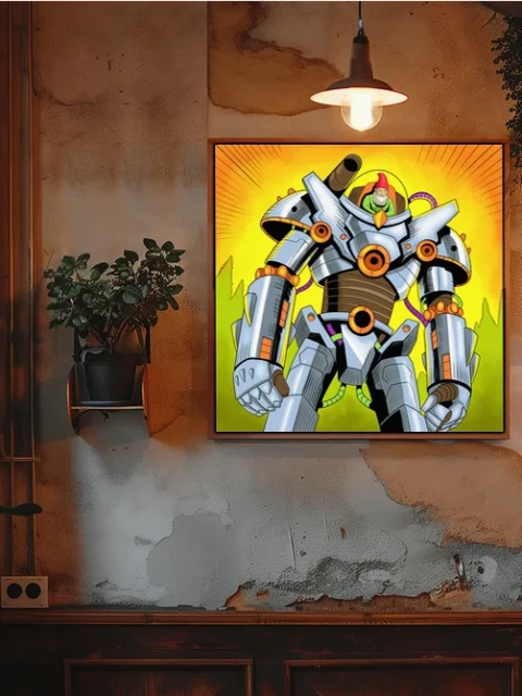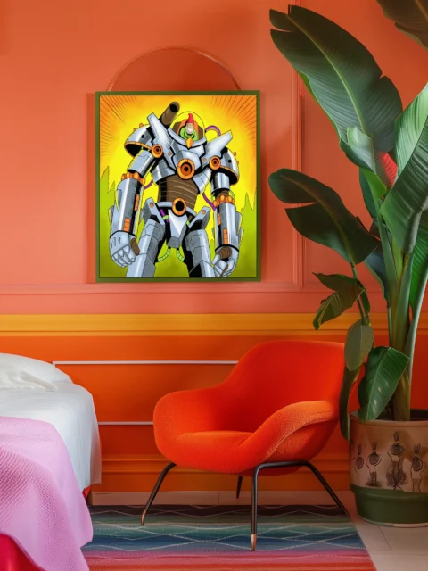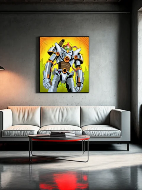 On the wall, the absurdist humor registers immediately at canvas dimensions. Ward TCG collectors and retro sci-fi enthusiasts both recognize the bold pop art color palette. This gnometheon2 art trading card art canvas print delivers playful mecha design without card borders.