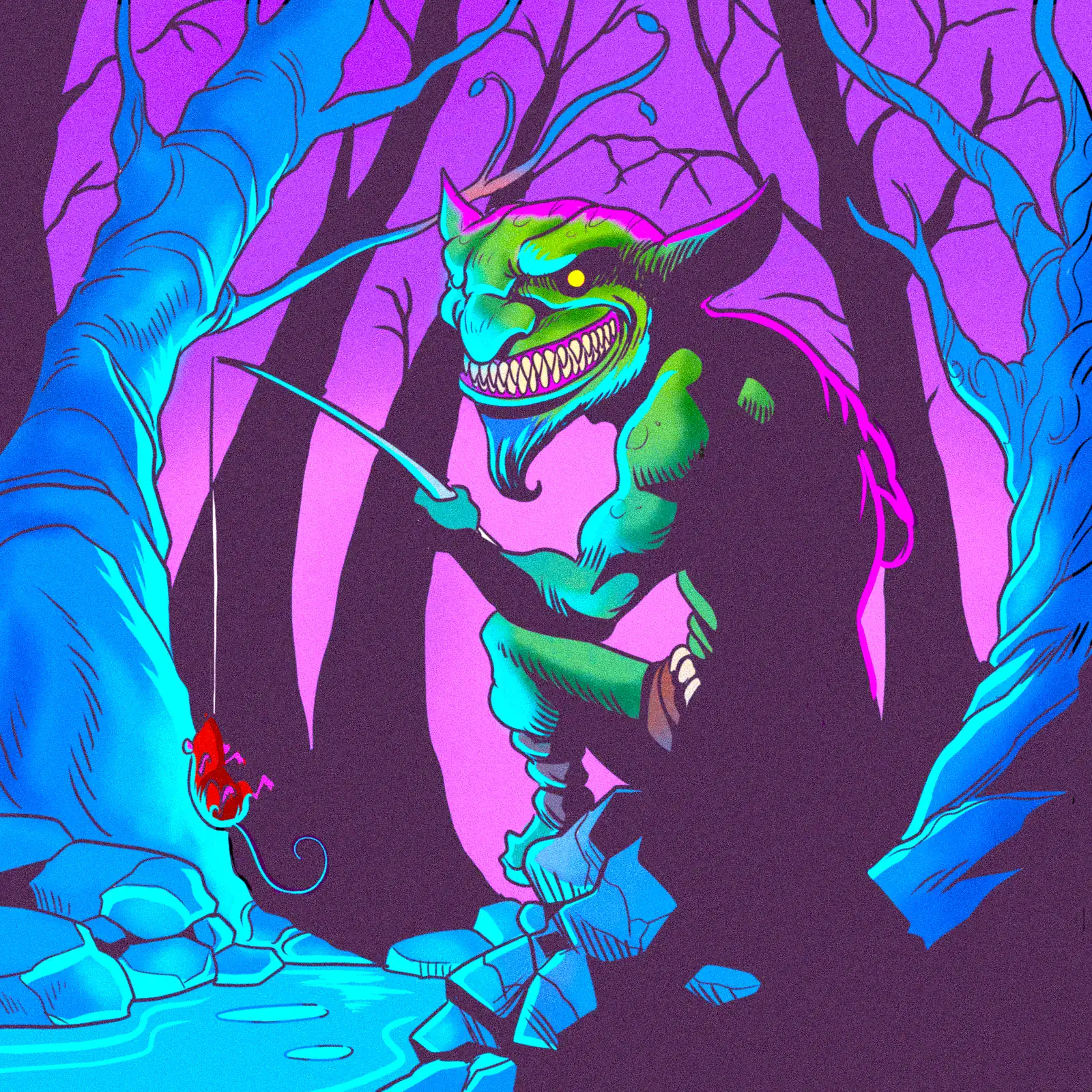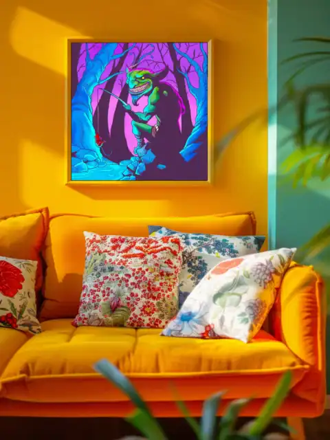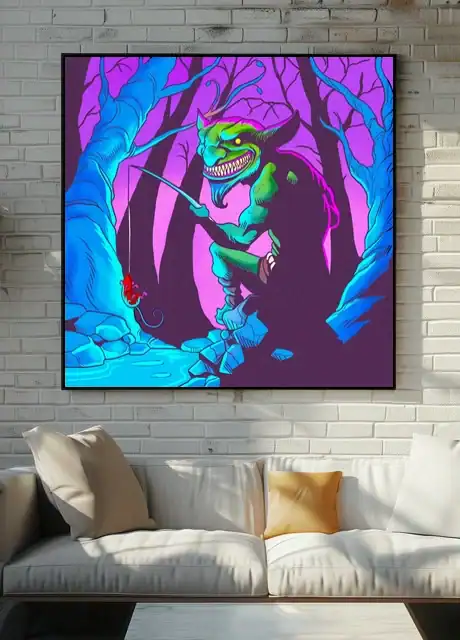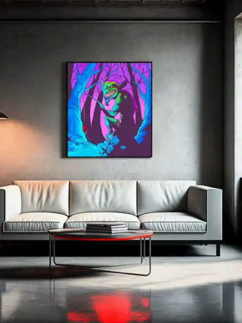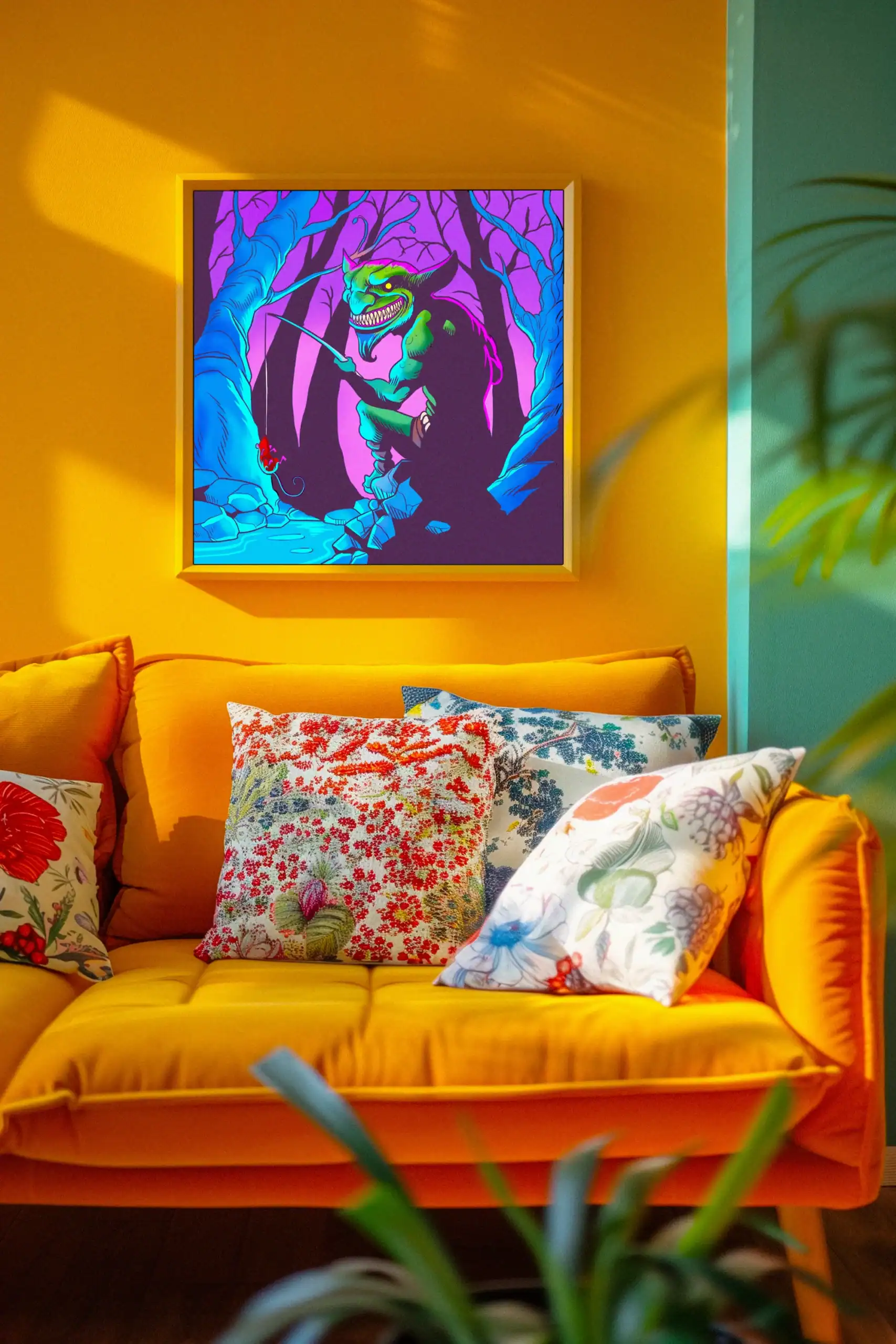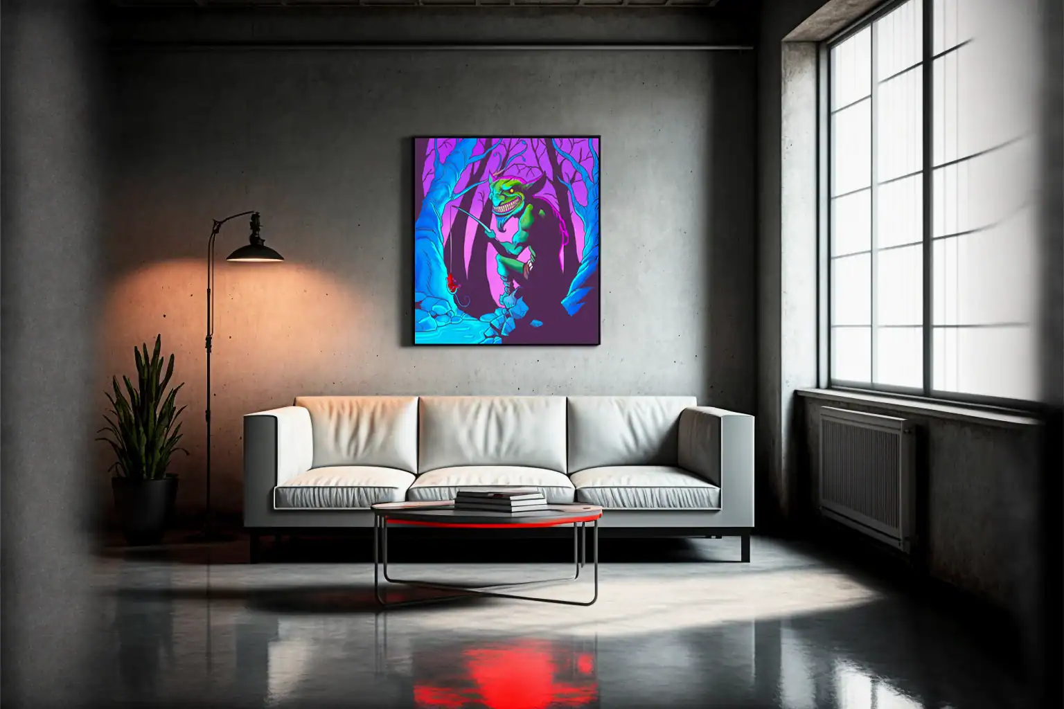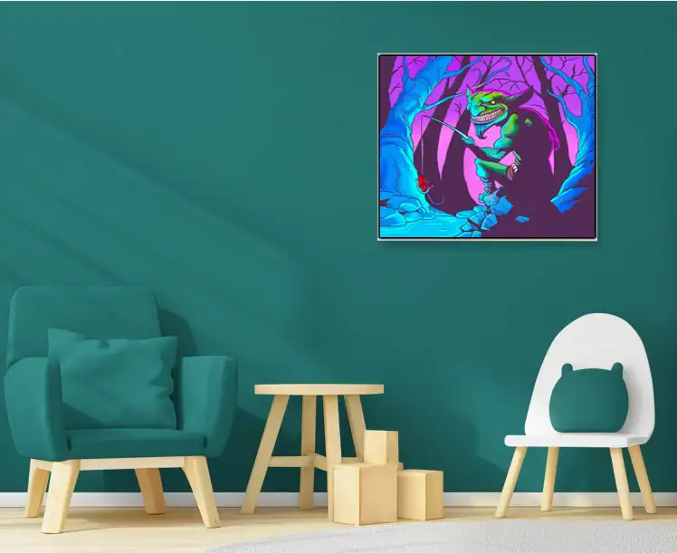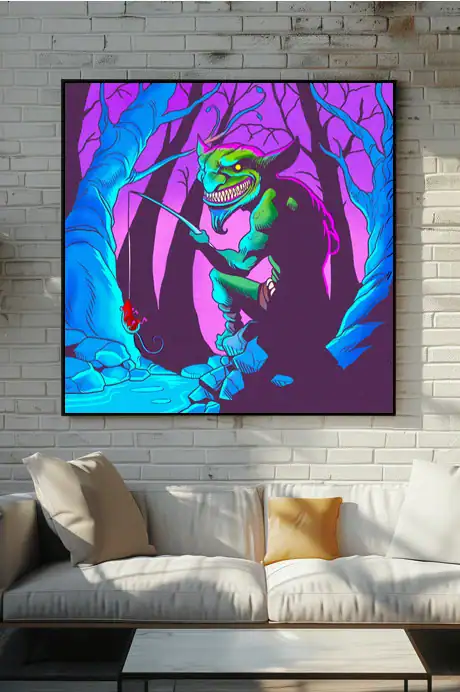 A green goblin dangles from a fishing line, grinning wickedly in neon forest shadows. This goblin art trading card canvas print captures Fabricio Vainer’s bold cel-shaded illustration from Ward TCG. Notably, electric blue twisted trees frame the creature’s mischievous orange-eyed stare.