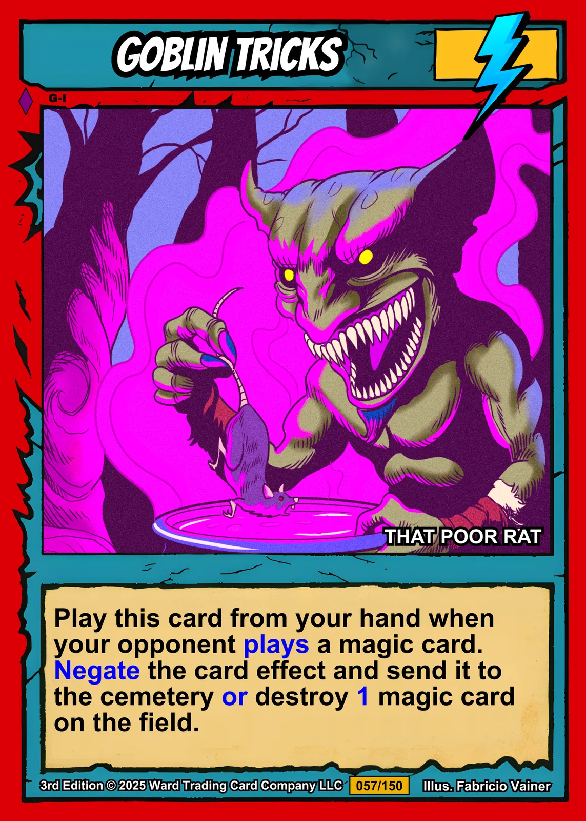 Moreover, the yellow header and footer sections frame the goblin’s mischievous expression perfectly. The red border creates a classic trading card aesthetic with clean stat displays. Indeed, the cel-shaded rendering gives every detail sharp definition and vibrant color saturation.