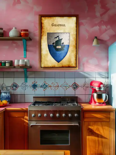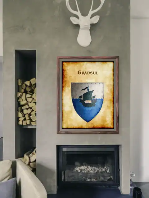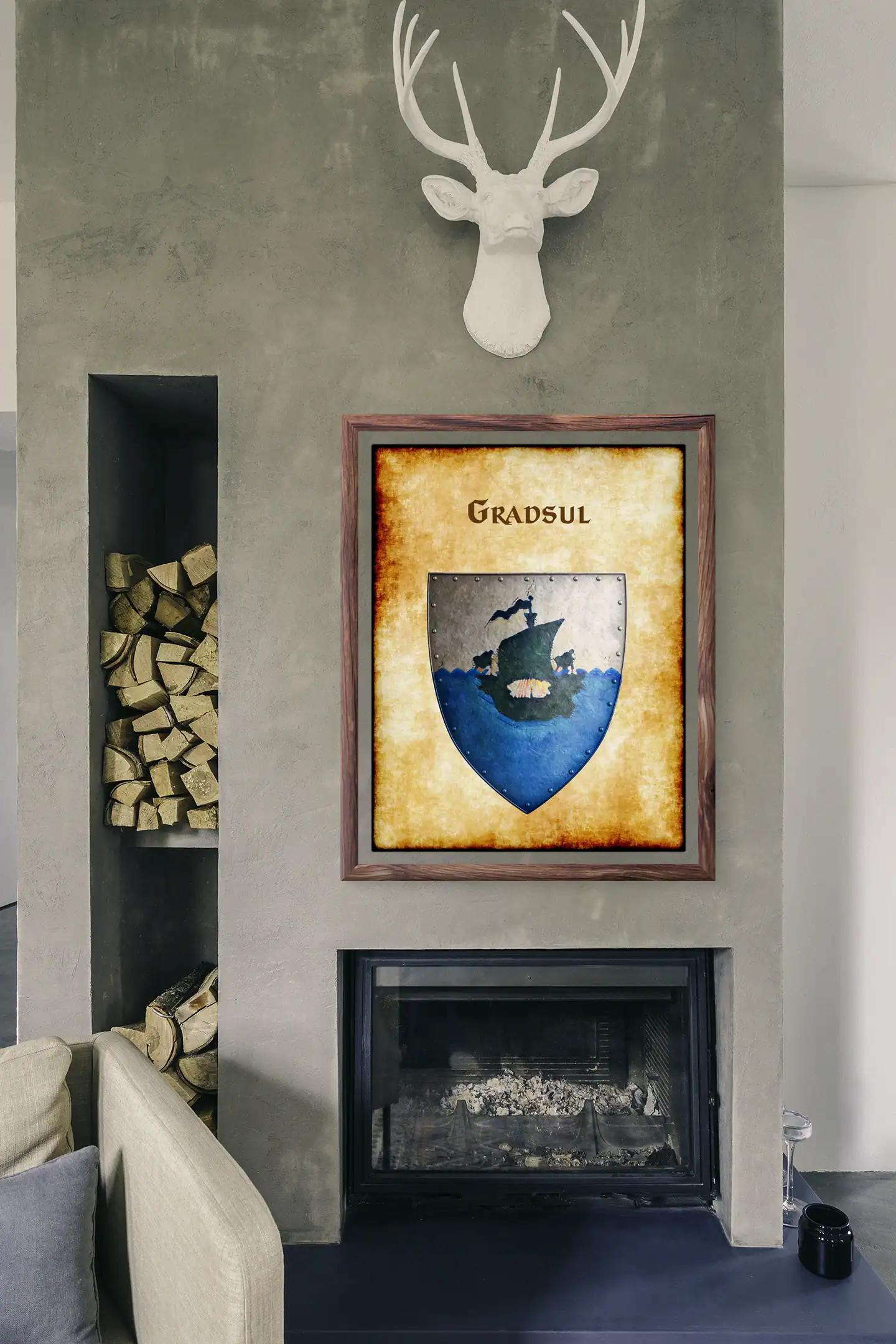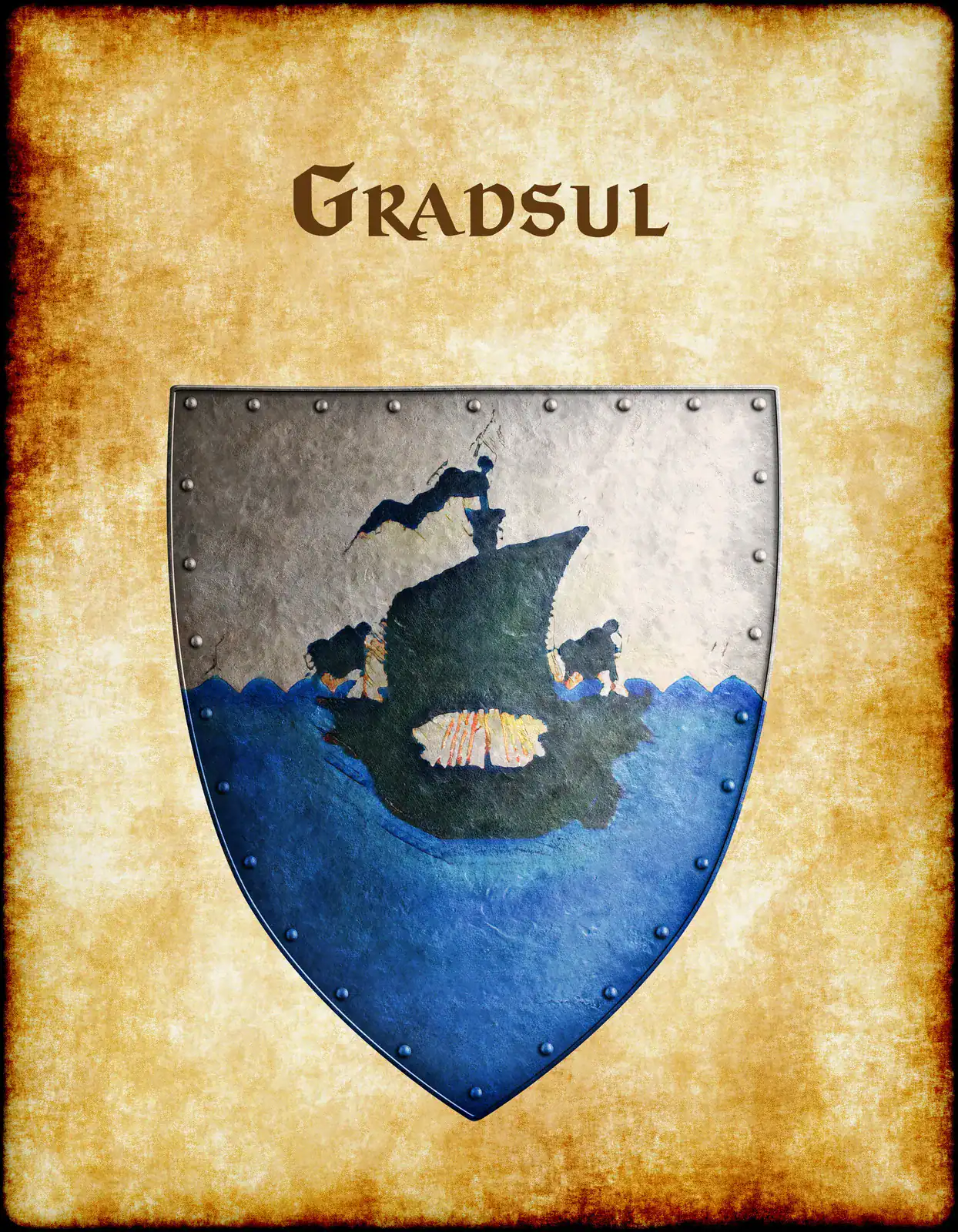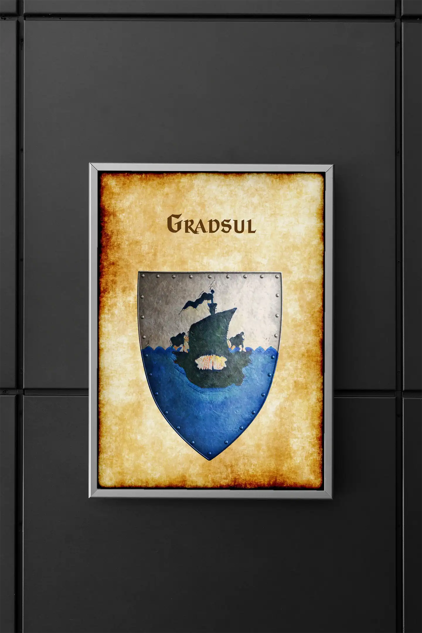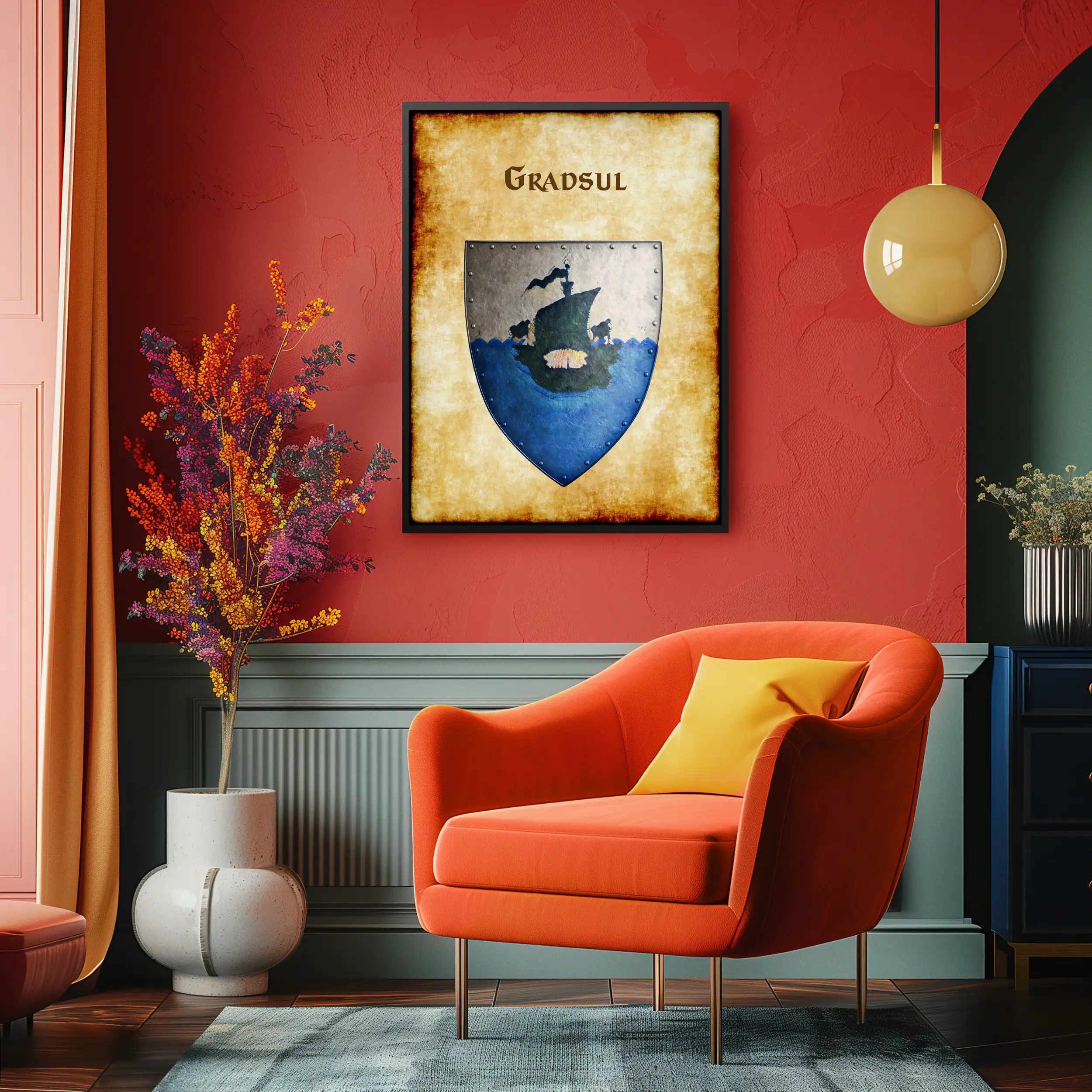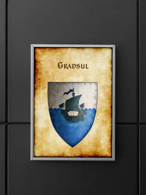 A traditional heater shield bears Gradsul’s maritime heraldry in weathered manuscript style. This gradsul Greyhawk heraldry canvas print displays the port city’s sailing vessel charge. Notably, the dark green ship carries a distinctive fish-emblazoned sail.