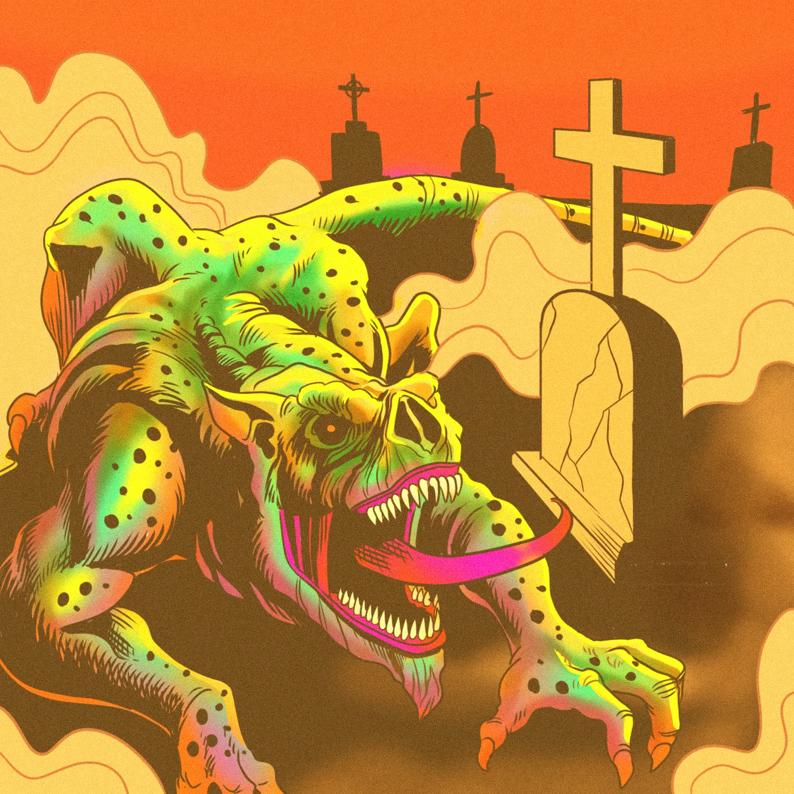 Additionally, the neon color palette combines sickly yellows with hot pink and magenta accents. Silhouetted gravestones anchor the composition against cream-colored mist swirls. The bold graphic linework and psychedelic orange backdrop create campy horror atmosphere, moreover.