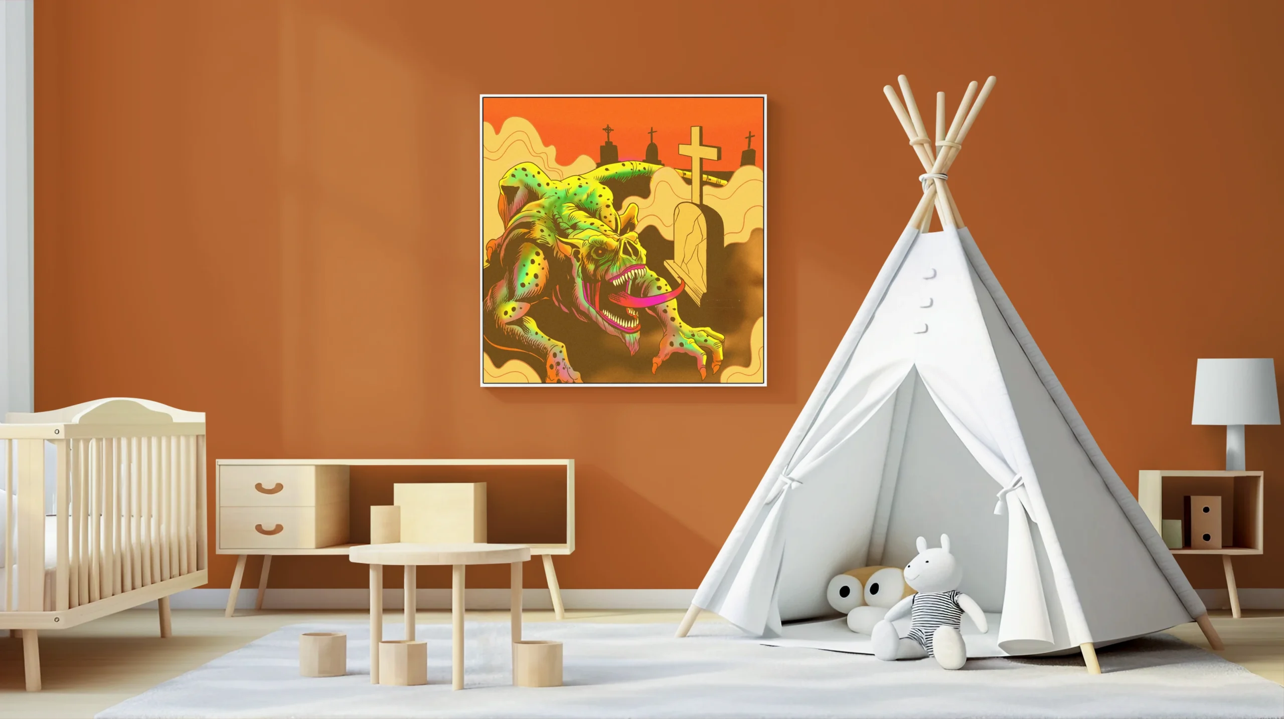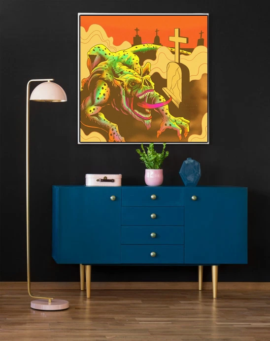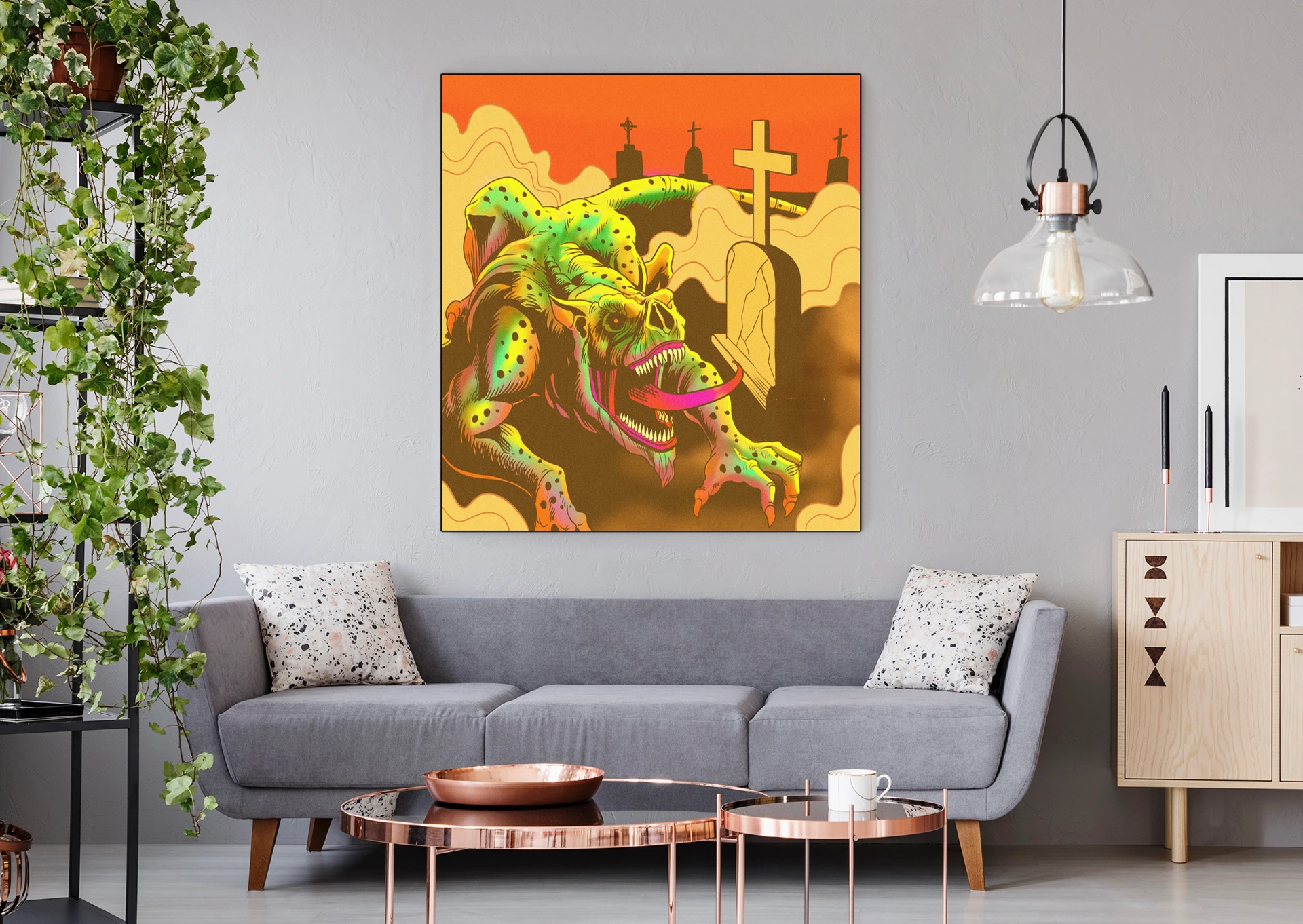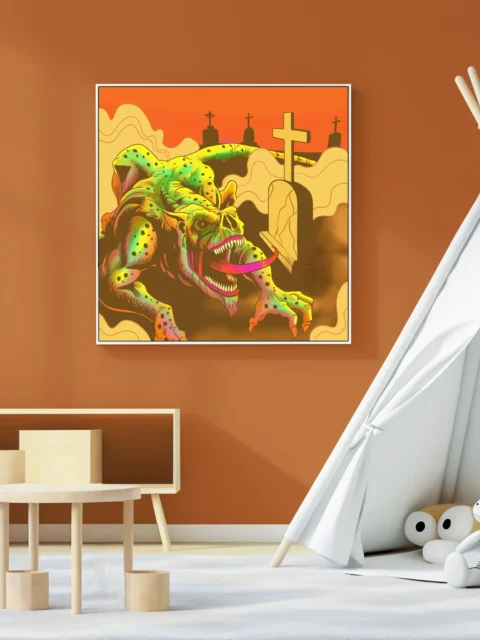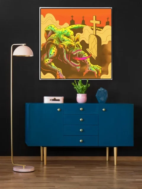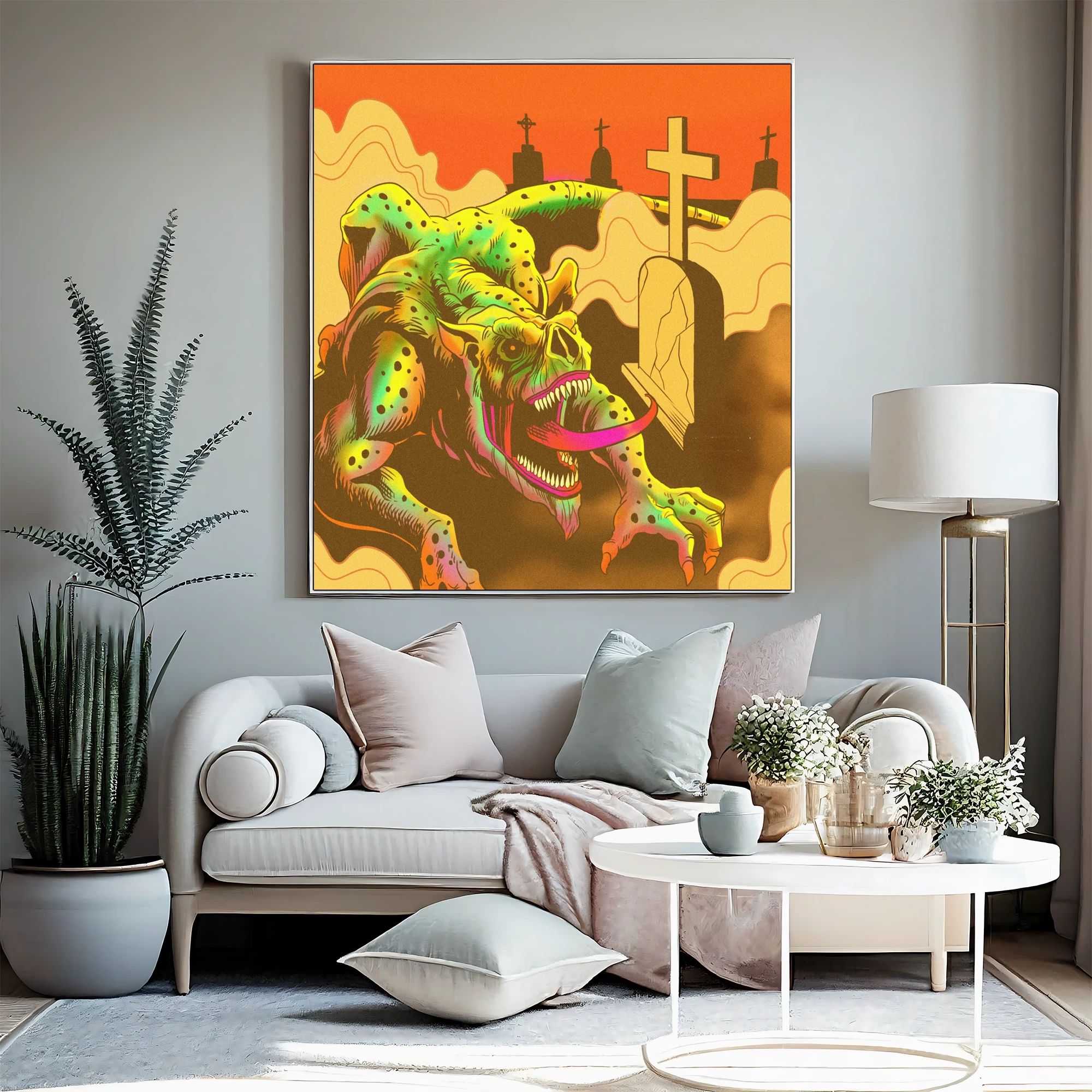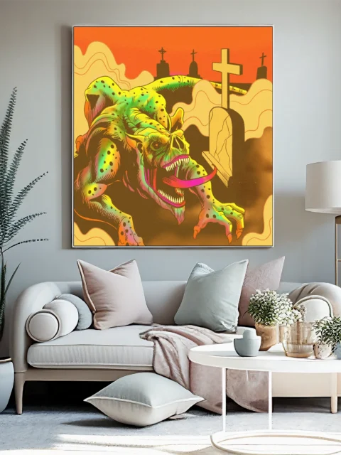 This belongs in game rooms where horror comic aesthetics and creature design take priority. Additionally, the piece works in creative studios that embrace bold graphic illustration and unconventional color choices.