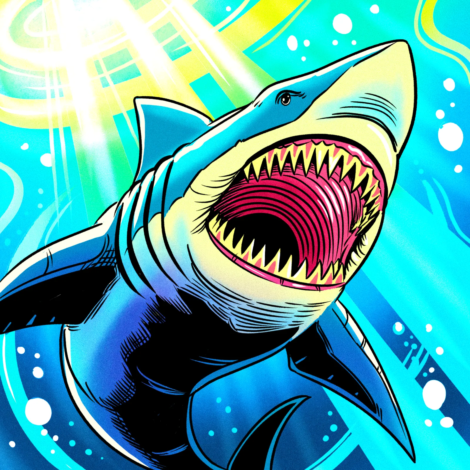 Additionally, the color palette contrasts steel blue dorsal tones against pale cream underbelly sections. Bold black outlines define the shark’s muscular form with comic book precision. Moreover, white bubbles scatter throughout cyan water currents for depth.