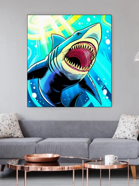On the wall, the predator’s direct approach creates genuine intensity at display scale. Ward TCG collectors and marine creature enthusiasts gain a pop art centerpiece. This great white art trading card art canvas print delivers Vainer’s energetic vision.