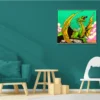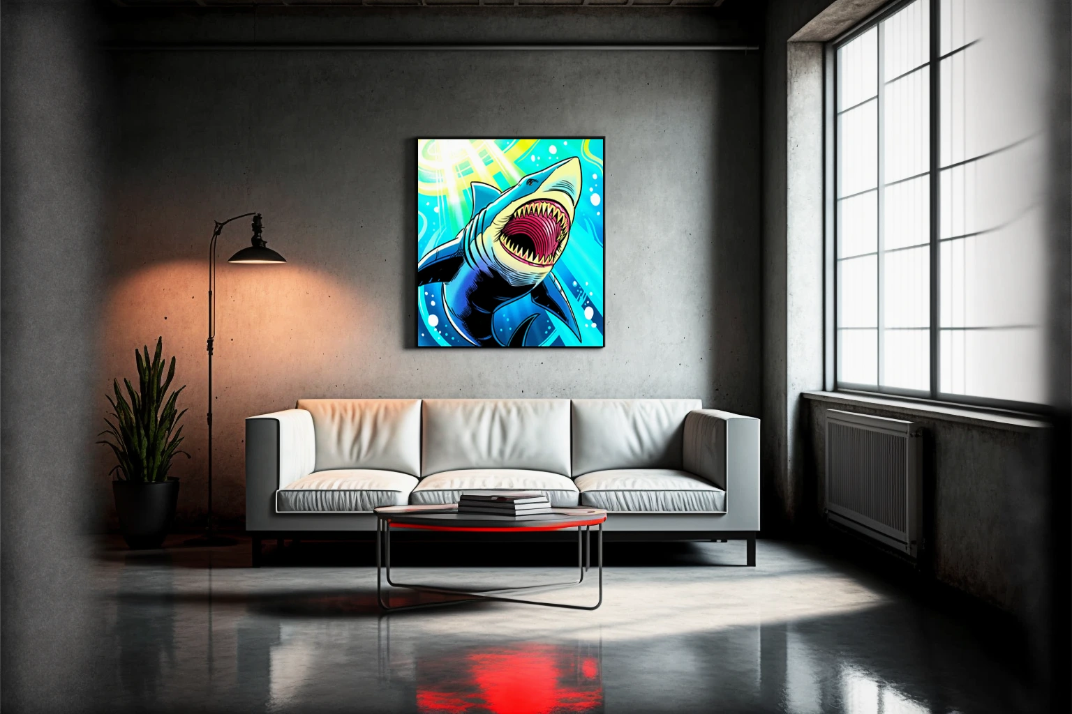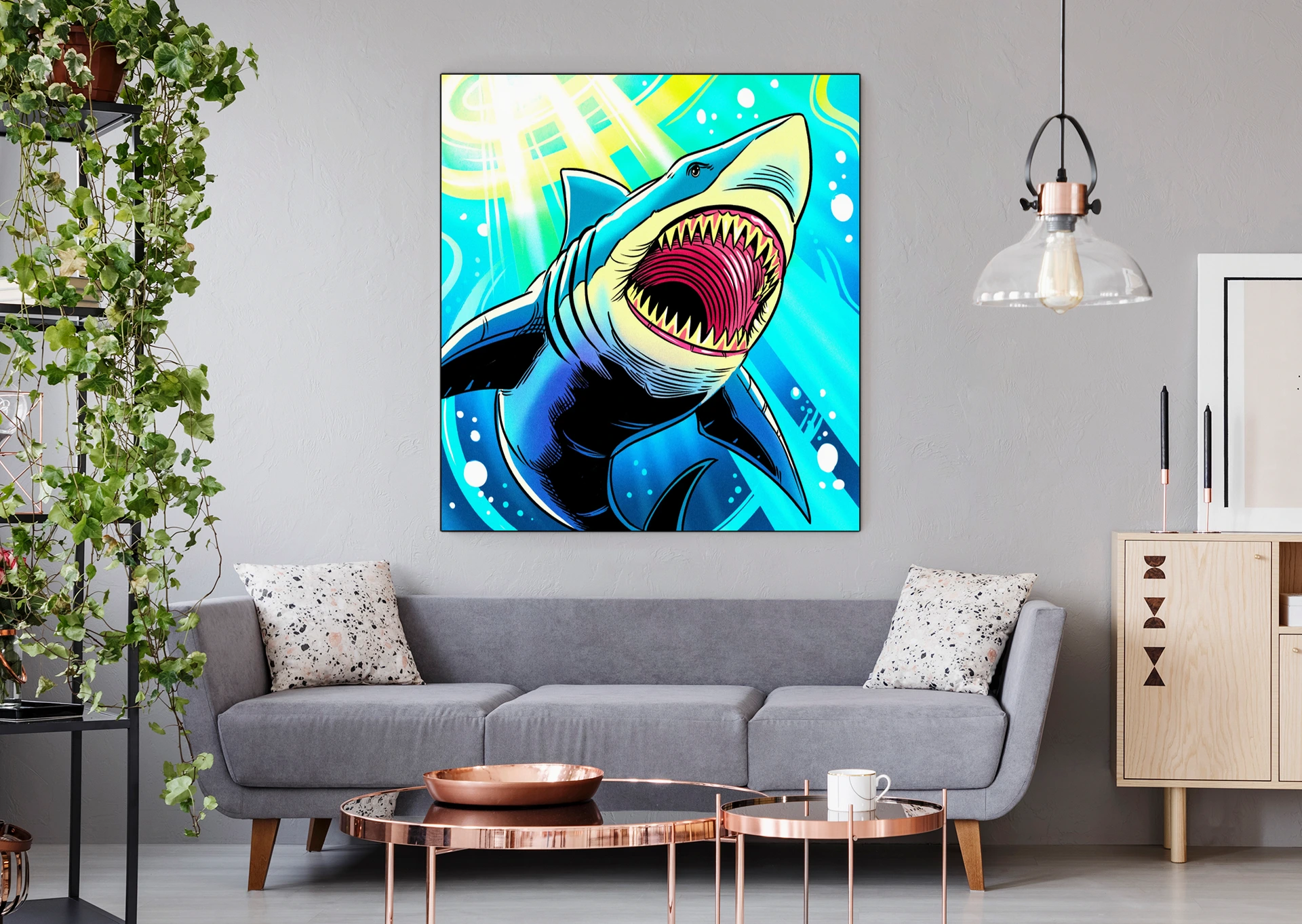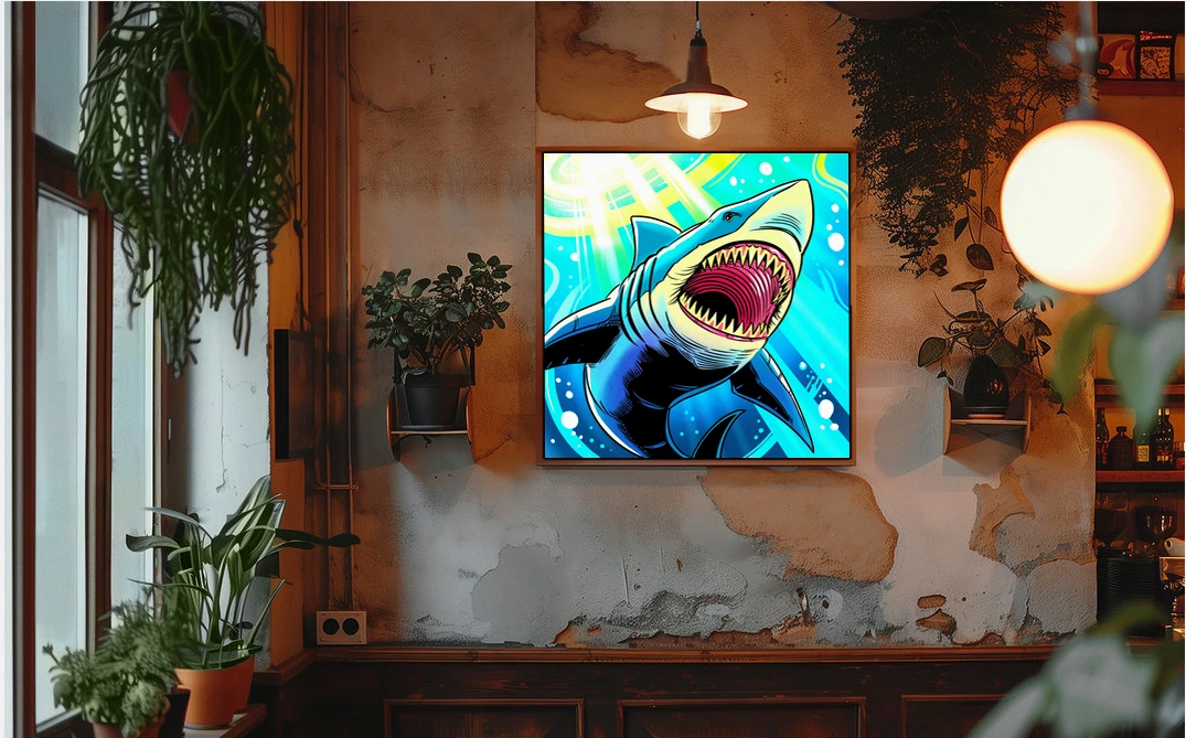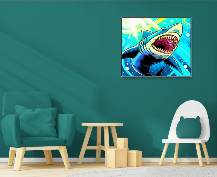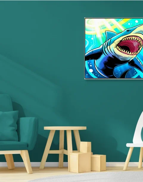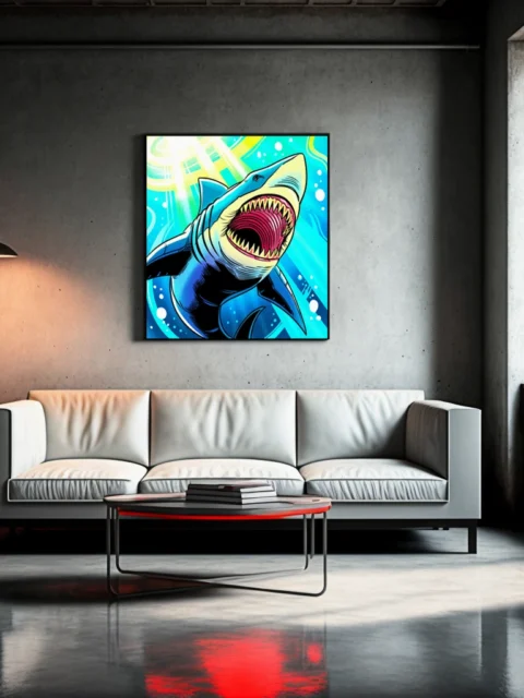 The aggressive composition suits game rooms where marine life and bold illustration styles align with competitive energy. Additionally, the high saturation and comic aesthetic complement modern collector spaces.