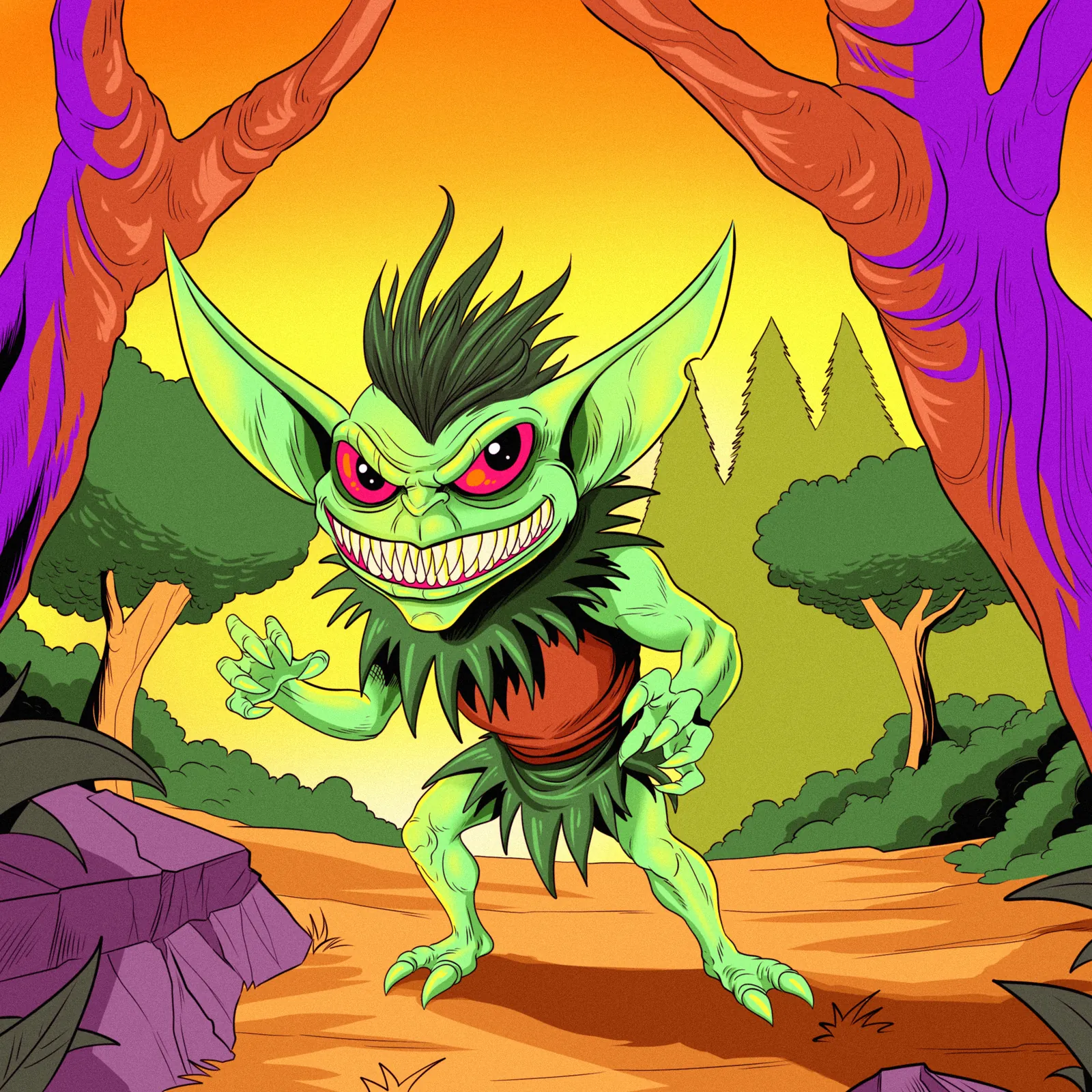A scrawny green gremlin grins with glowing pink eyes and clawed hands outstretched. This gremlin art trading card art canvas print showcases Fabricio Vainer’s cel-shaded illustration against a vivid orange-yellow sky. Notably, the creature’s oversized pointed ears and spiky black hair frame its wide toothy grin.