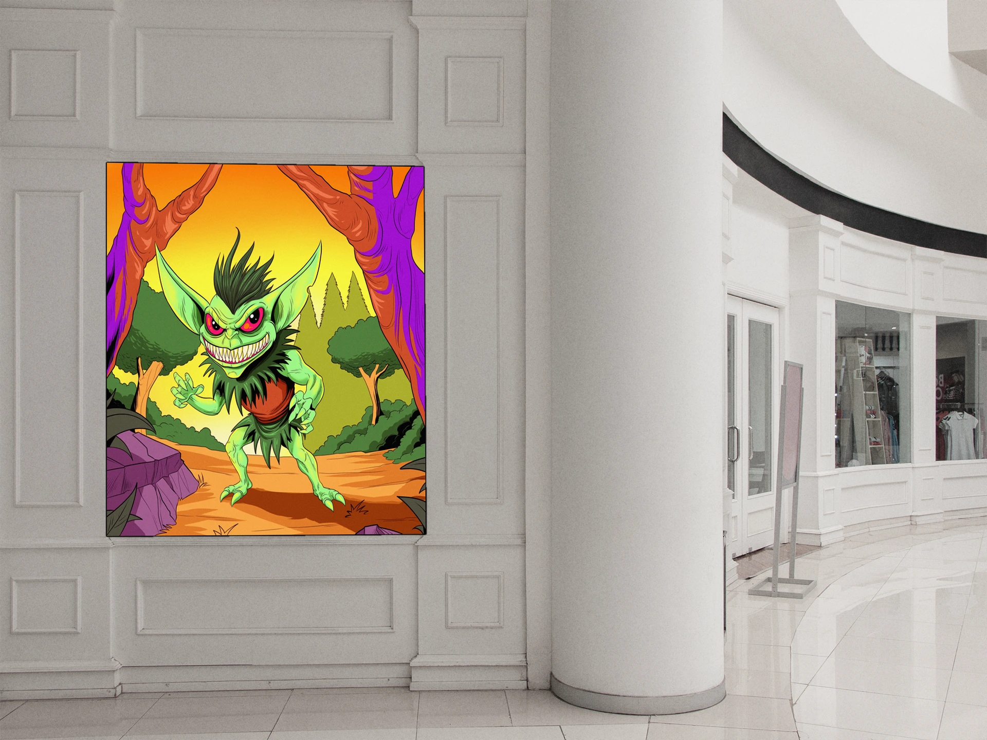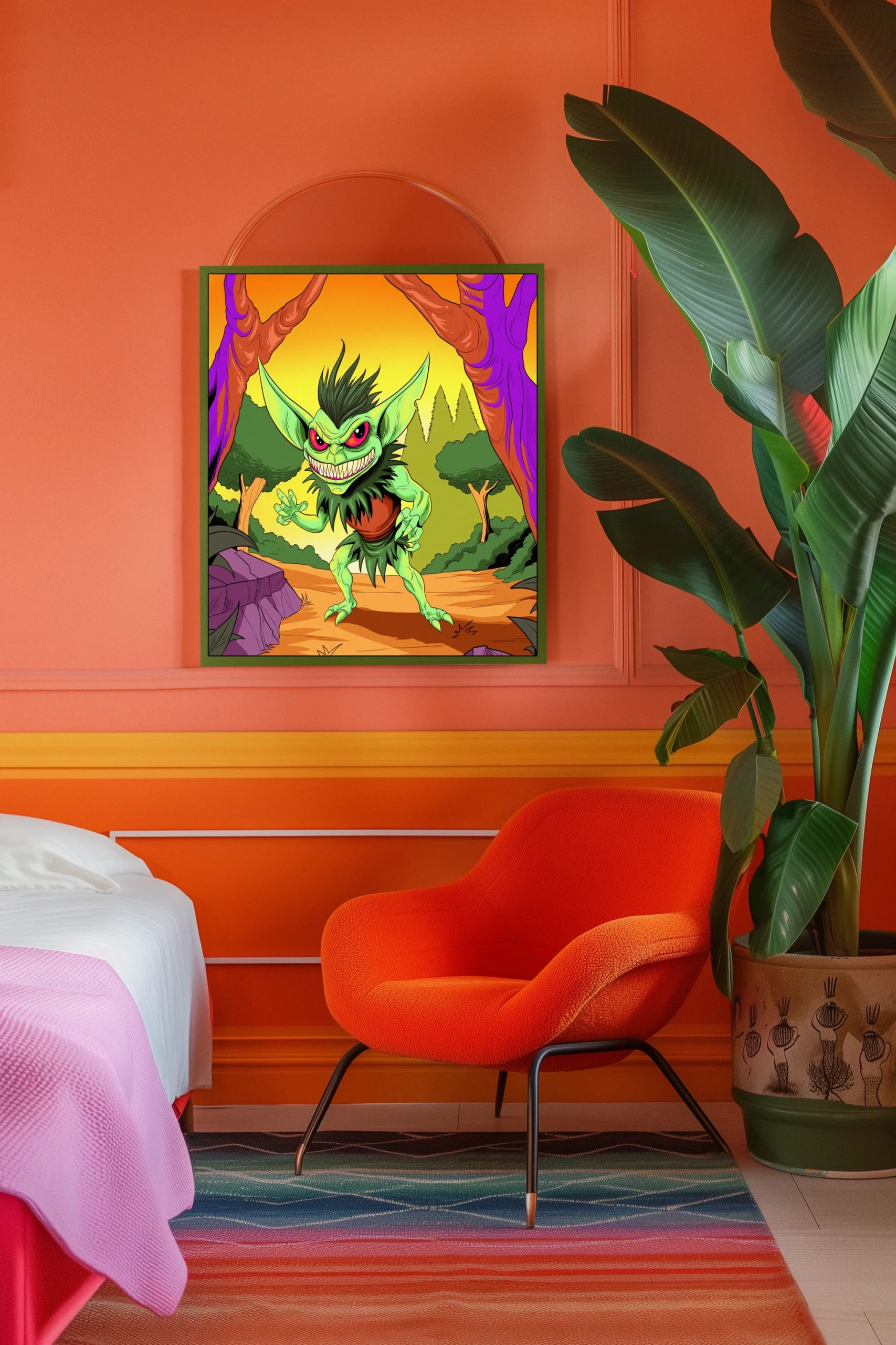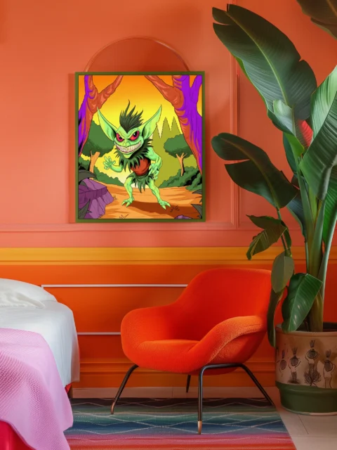 On the wall, the retro cartoon style reads larger and bolder than any card-sized version. This print appeals to Ward TCG collectors and fans of mischievous creature art with playful energy. The gremlin art trading card art canvas print delivers Vainer’s full illustration without borders or game elements.