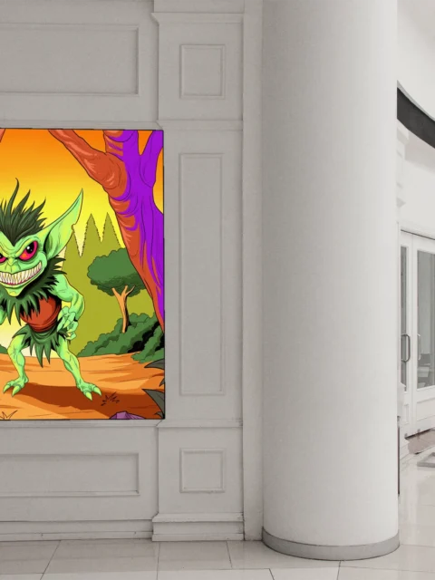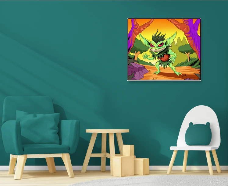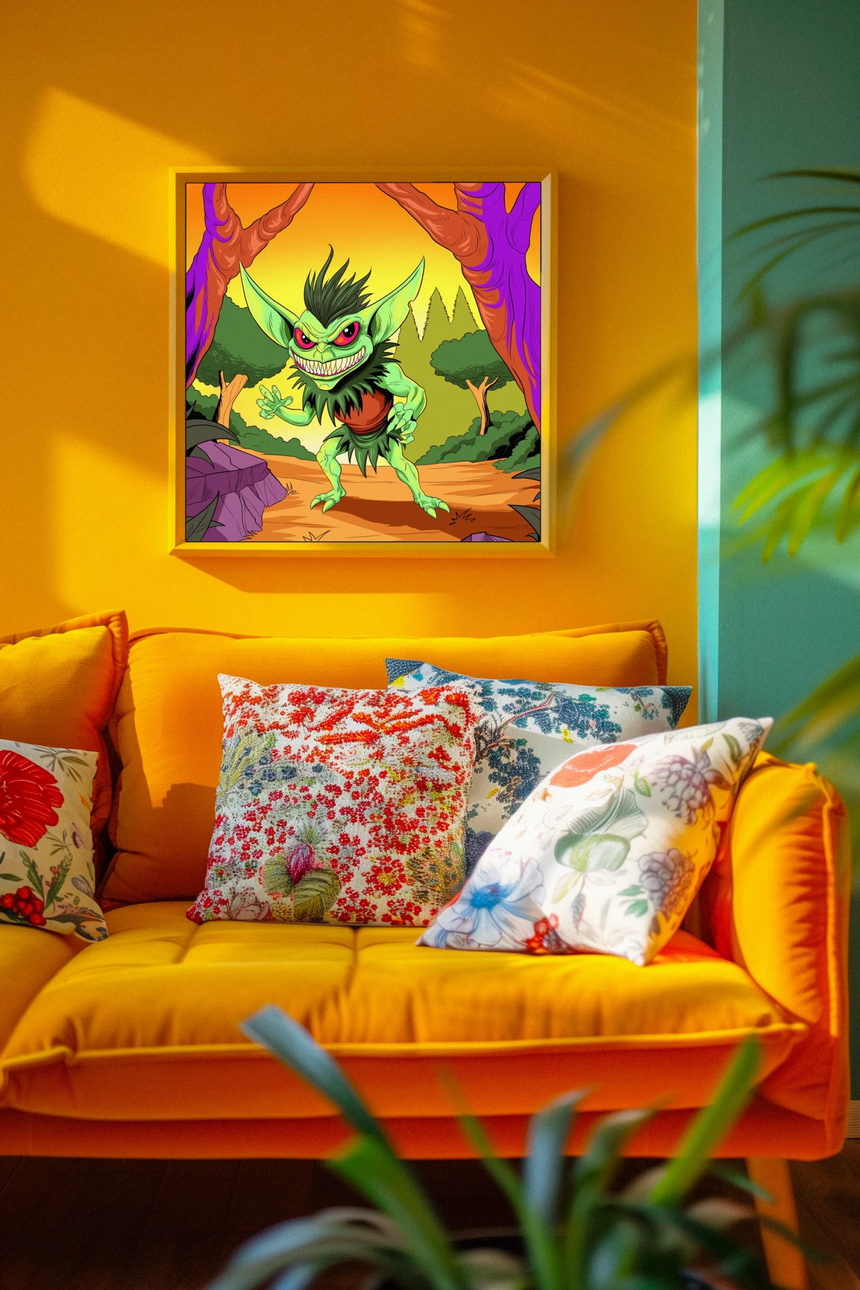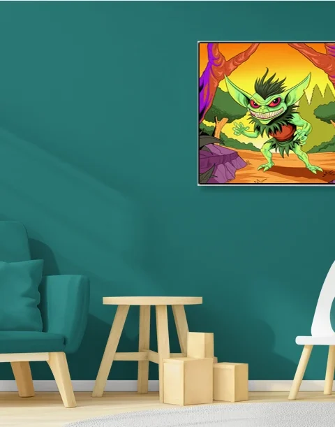 Display in a game room alongside other fantasy creature art or TCG collections where the playful sinister tone fits. Additionally, the bold outlines and saturated colors hold clarity in creative studio spaces with ambient lighting.