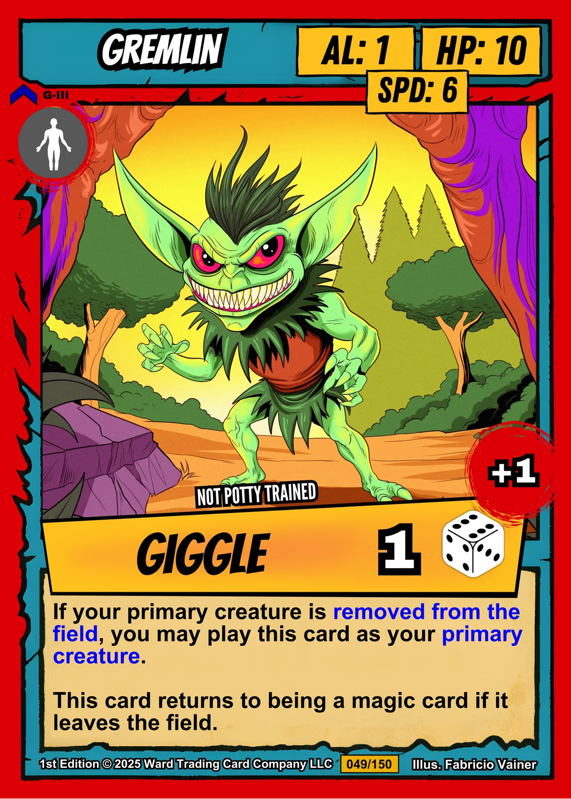 Additionally, the card layout features a bold red border and cyan title banner. Yellow stat boxes display AL: 1, HP: 10, and SPD: 6. A yellow ability banner labeled GIGGLE sits below the illustration with a dice icon.