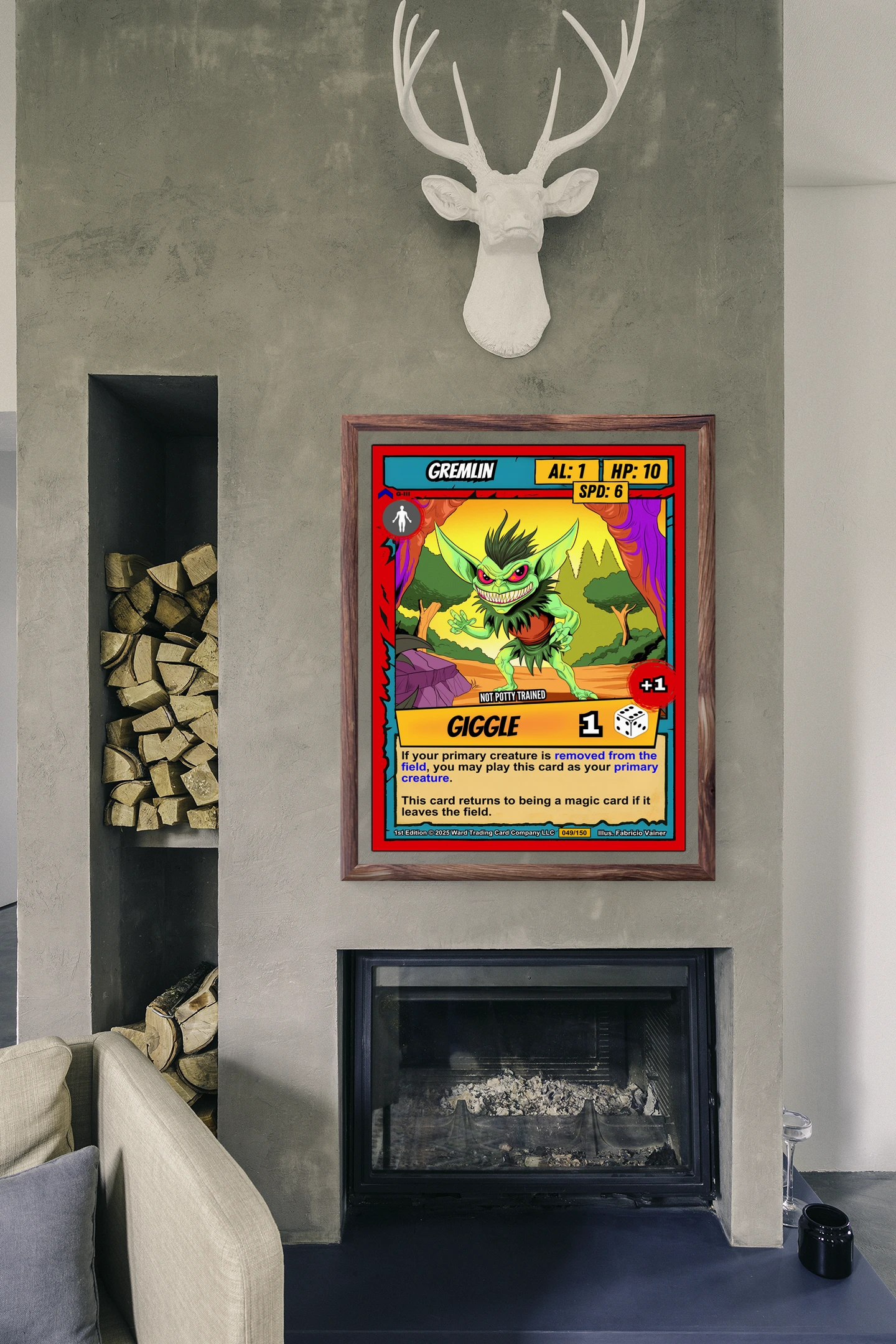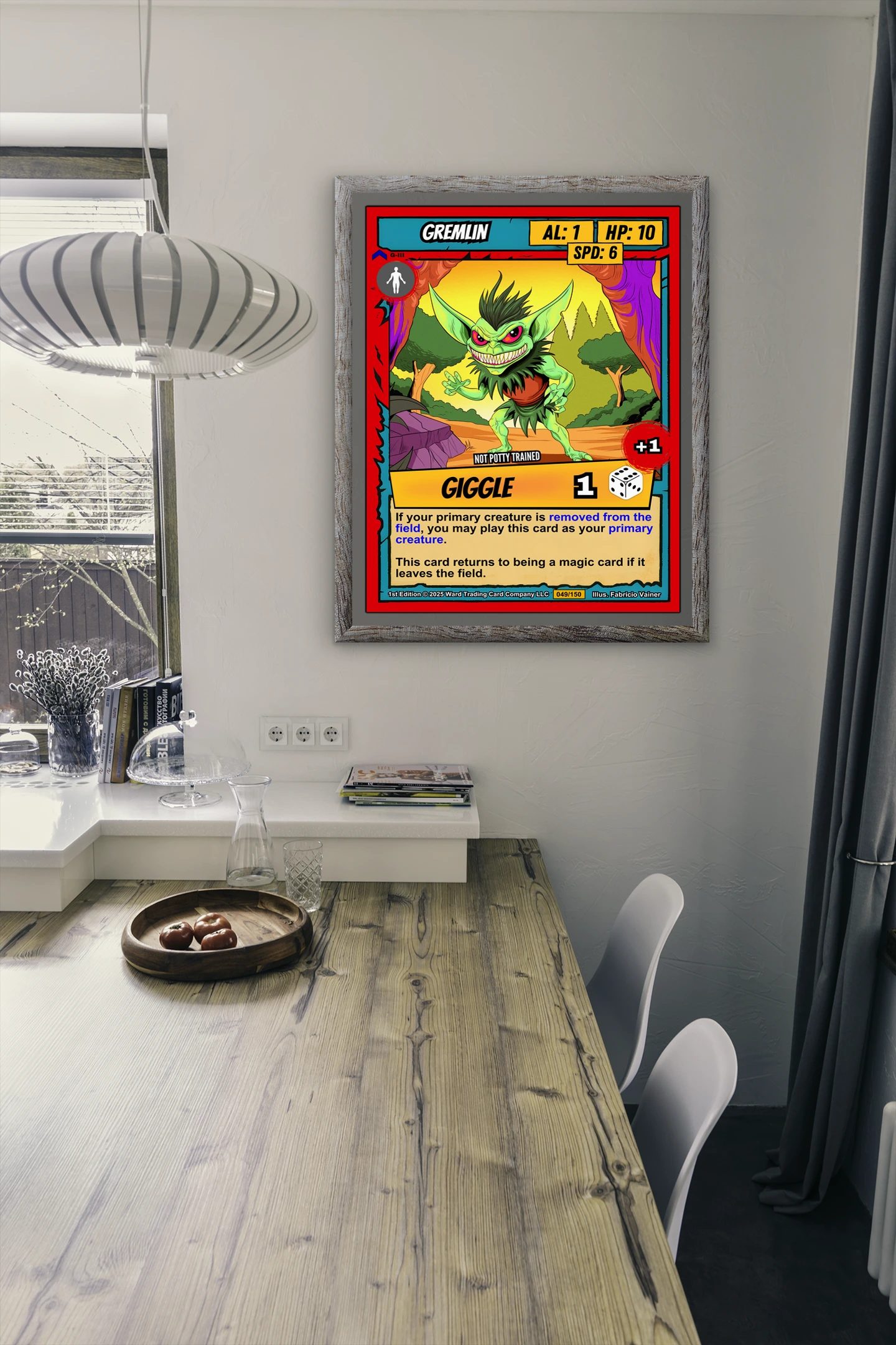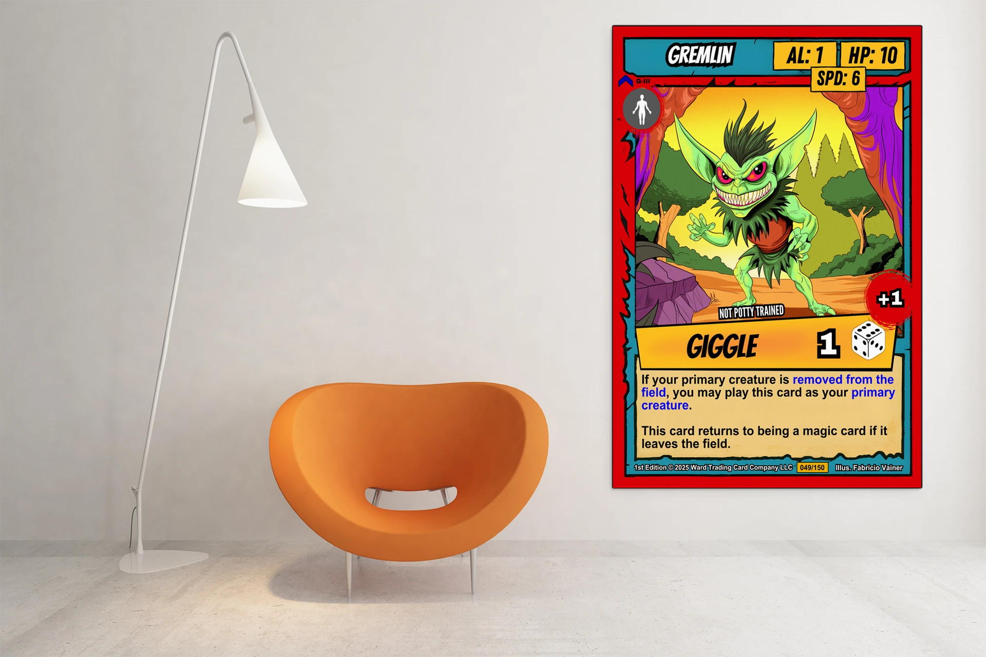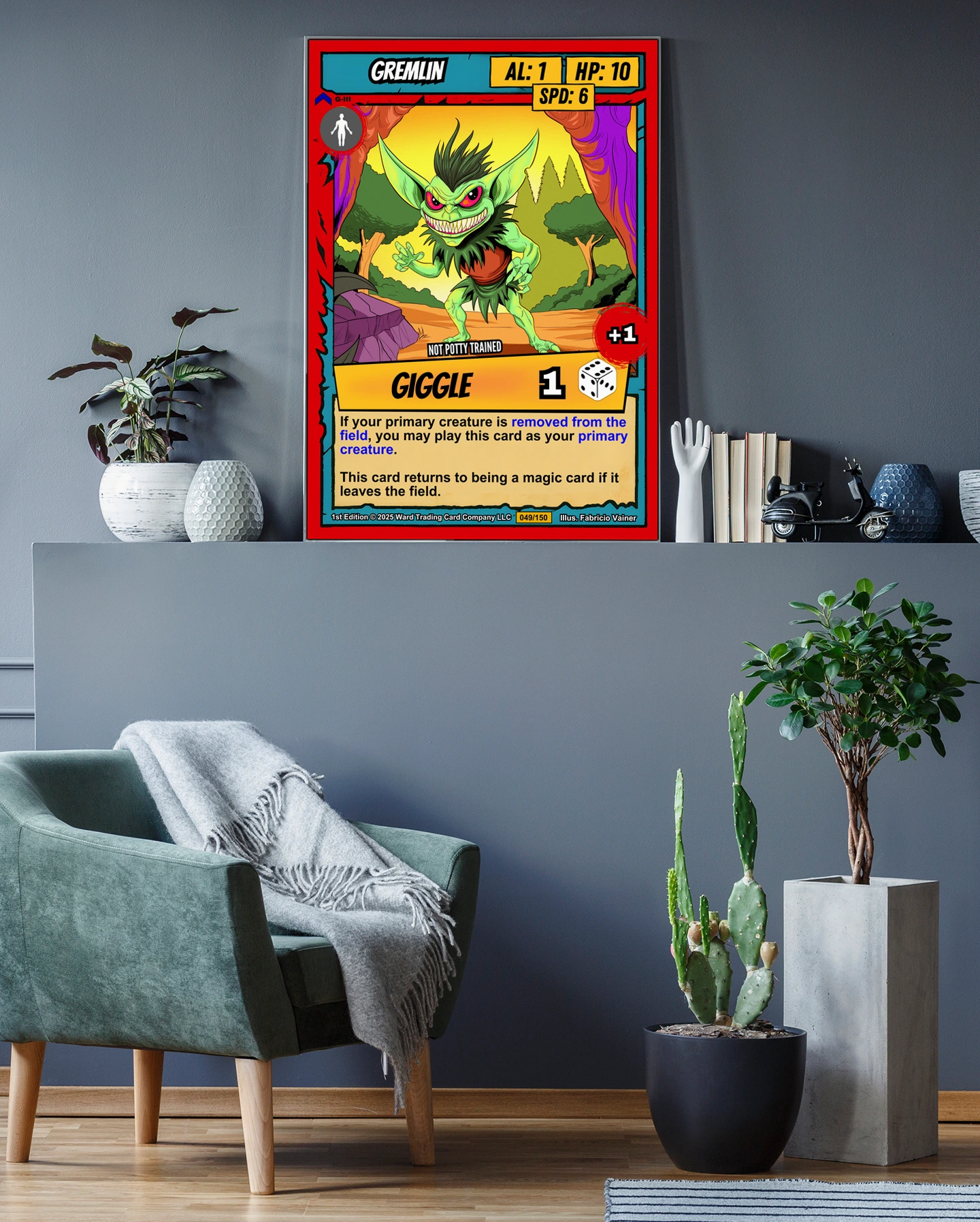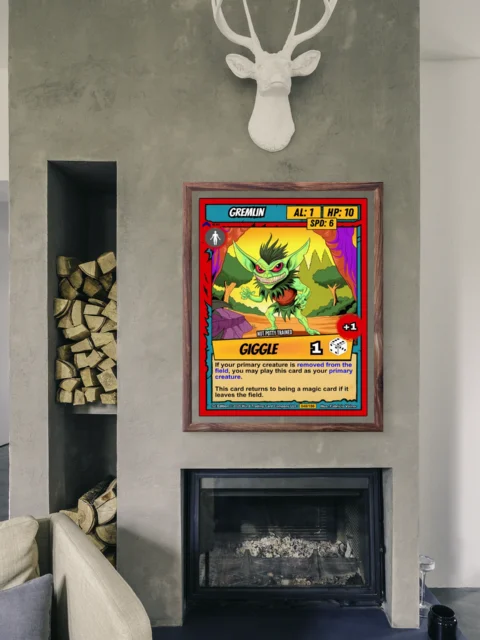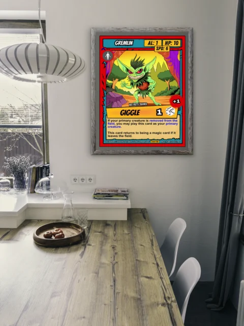 At room scale, the vivid colors and comic-book outlines hold strong across the space. This gremlin trading card canvas print appeals to Ward TCG collectors who want iconic low-stat creatures on the wall. The mischievous expression and bold graphic style anchor a playroom or game den.