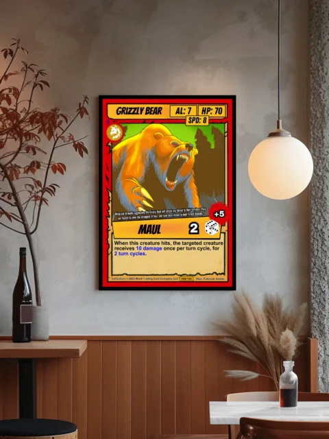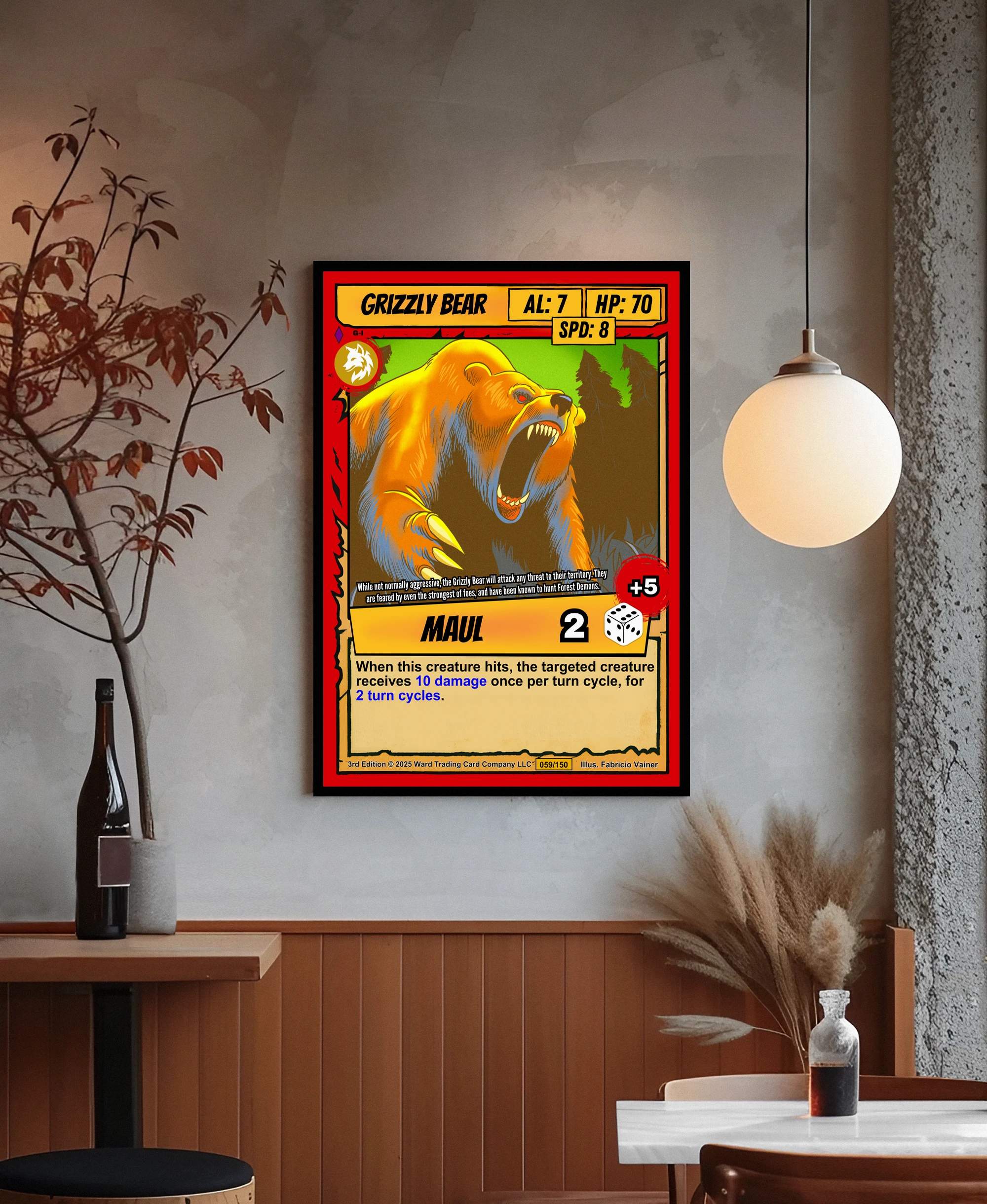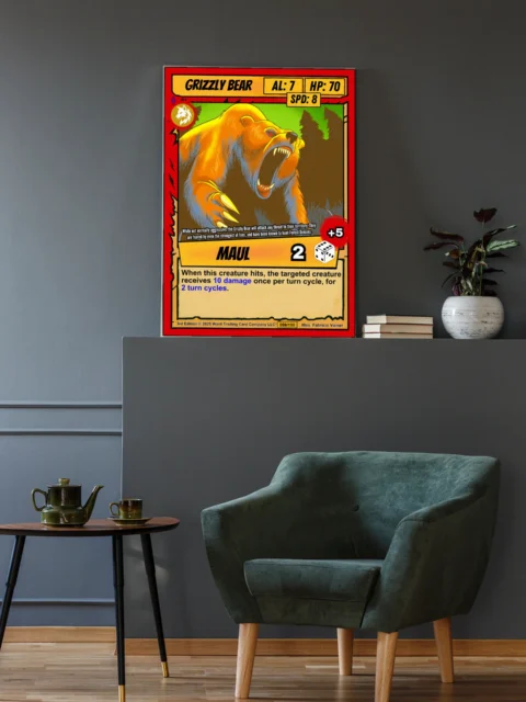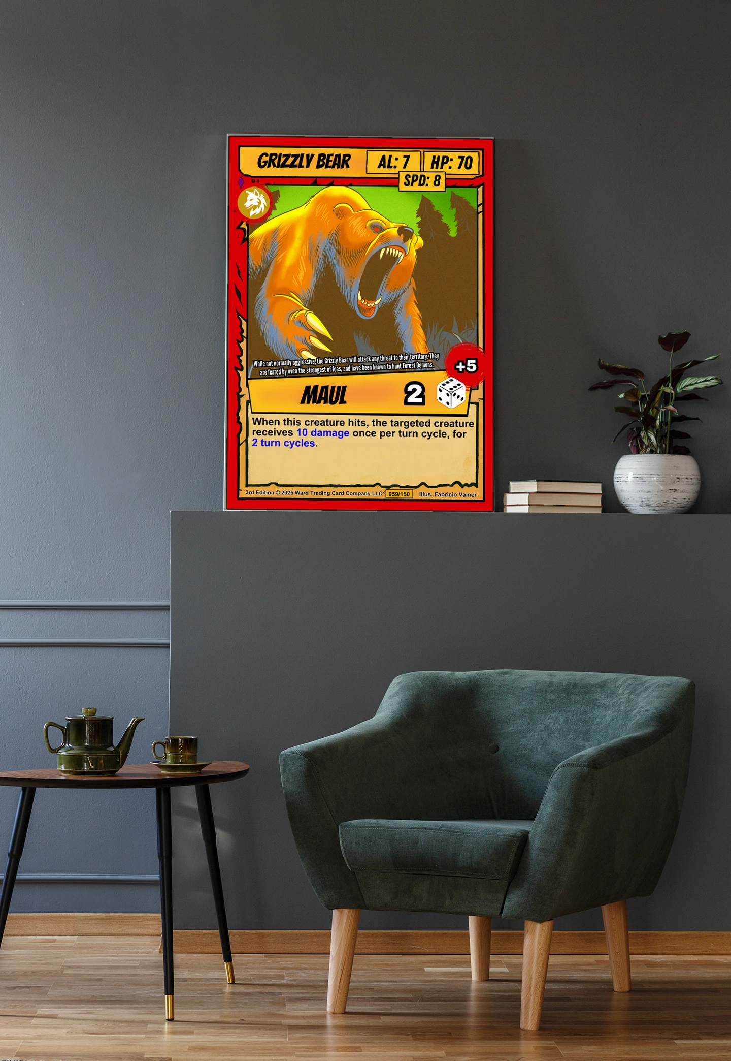 Owning this piece marks you as someone who appreciates both gaming heritage and bold art. TCG collectors recognize quality when Fabricio Vainer’s work commands the room. Particularly, this grizzly bear trading card canvas print represents Ward’s finest creature design.