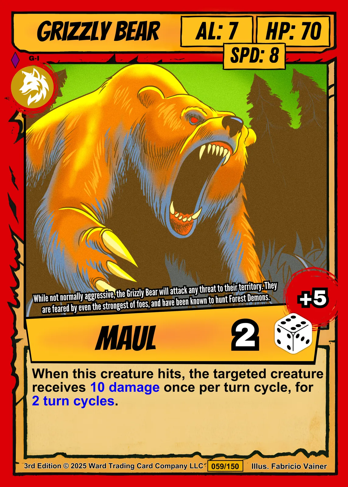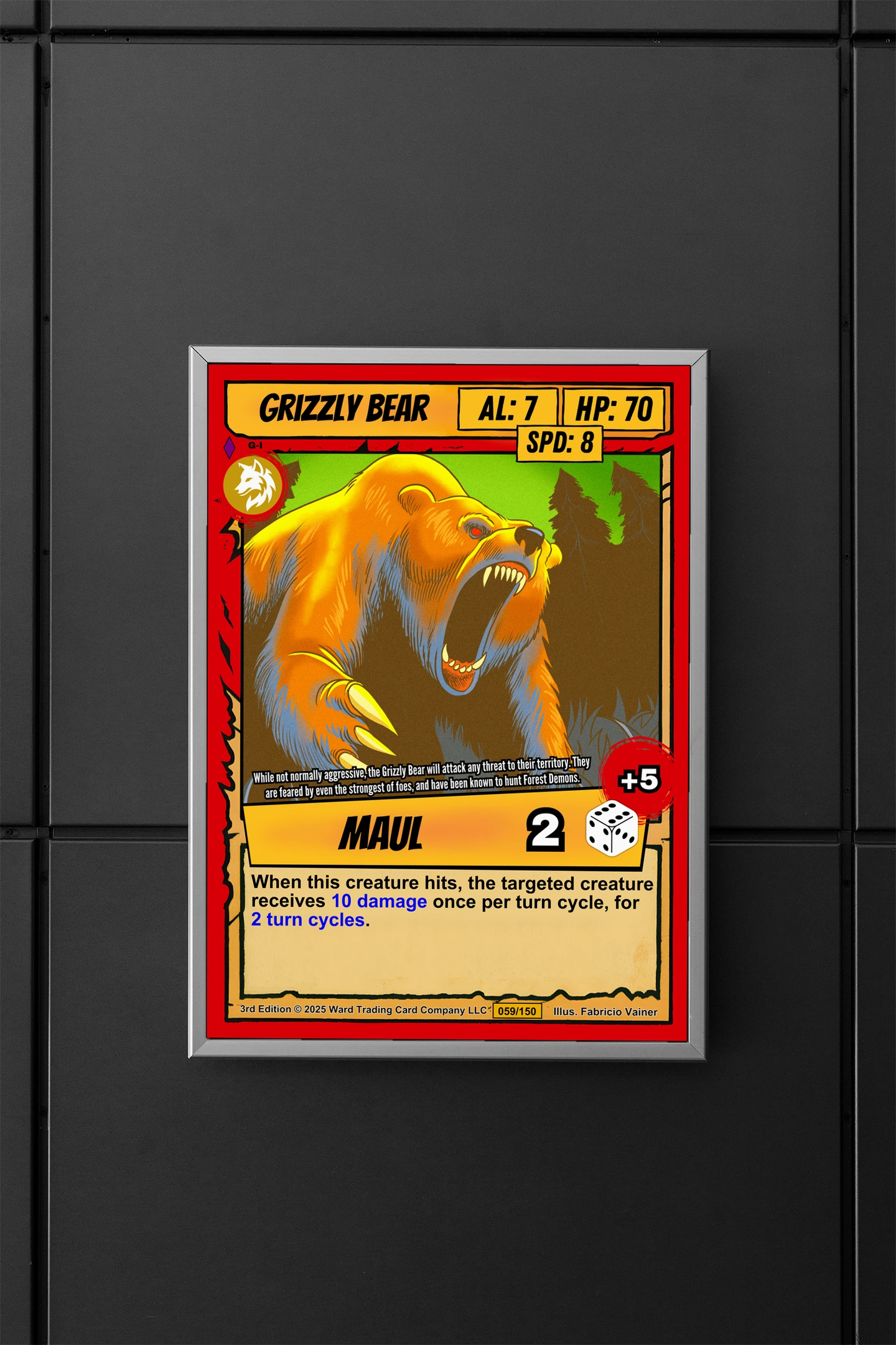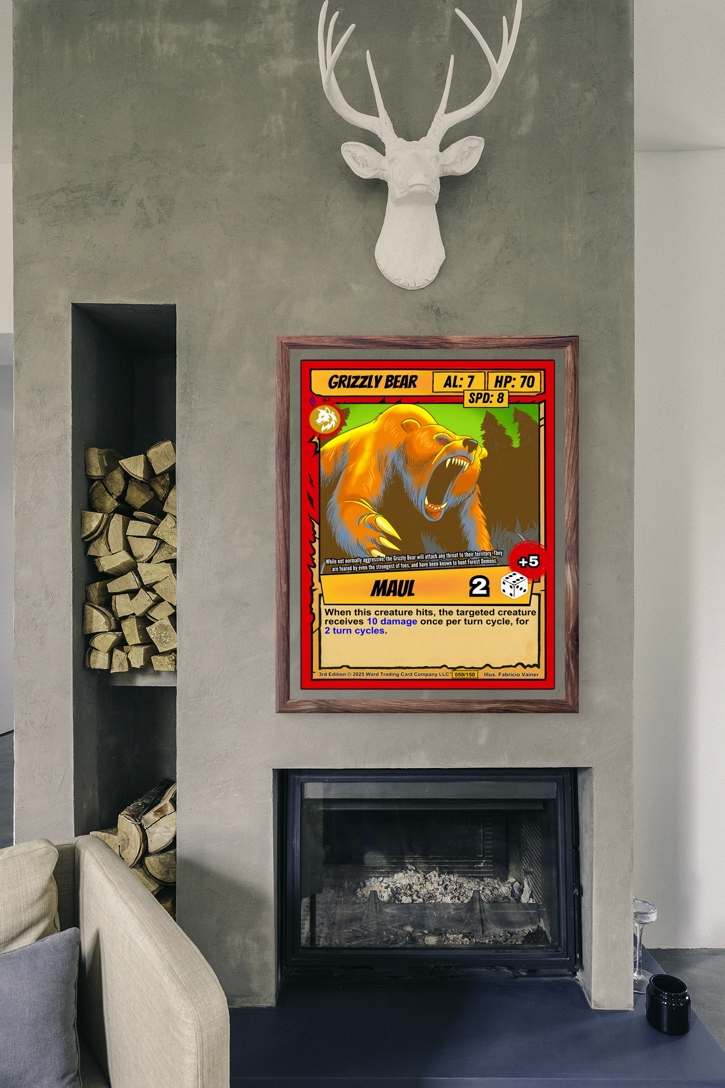 Owning this piece marks you as someone who appreciates both gaming heritage and bold art. TCG collectors recognize quality when Fabricio Vainer’s work commands the room. Particularly, this grizzly bear trading card canvas print represents Ward’s finest creature design.