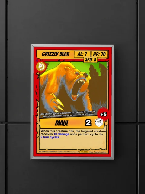 Fabricio Vainer’s grizzly bear erupts in primal fury, jaws wide and claws extended. This grizzly bear trading card canvas print captures Ward TCG’s signature retro comic style. Notably, vibrant yellow-orange fur contrasts against deep blue shadowing throughout.