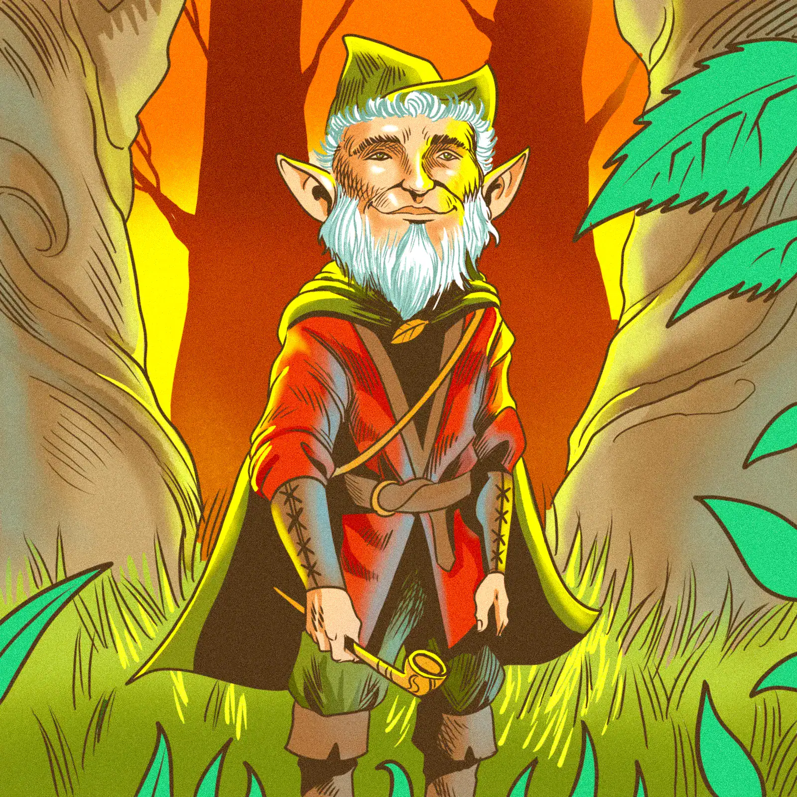 A gnome-like figure with pale blue-white beard clutches a golden key. This halfling art trading card canvas print captures Fabricio Vainer’s distinctive comic-book style. The character’s crosshatched details pop against vibrant yellow-orange radiating light.