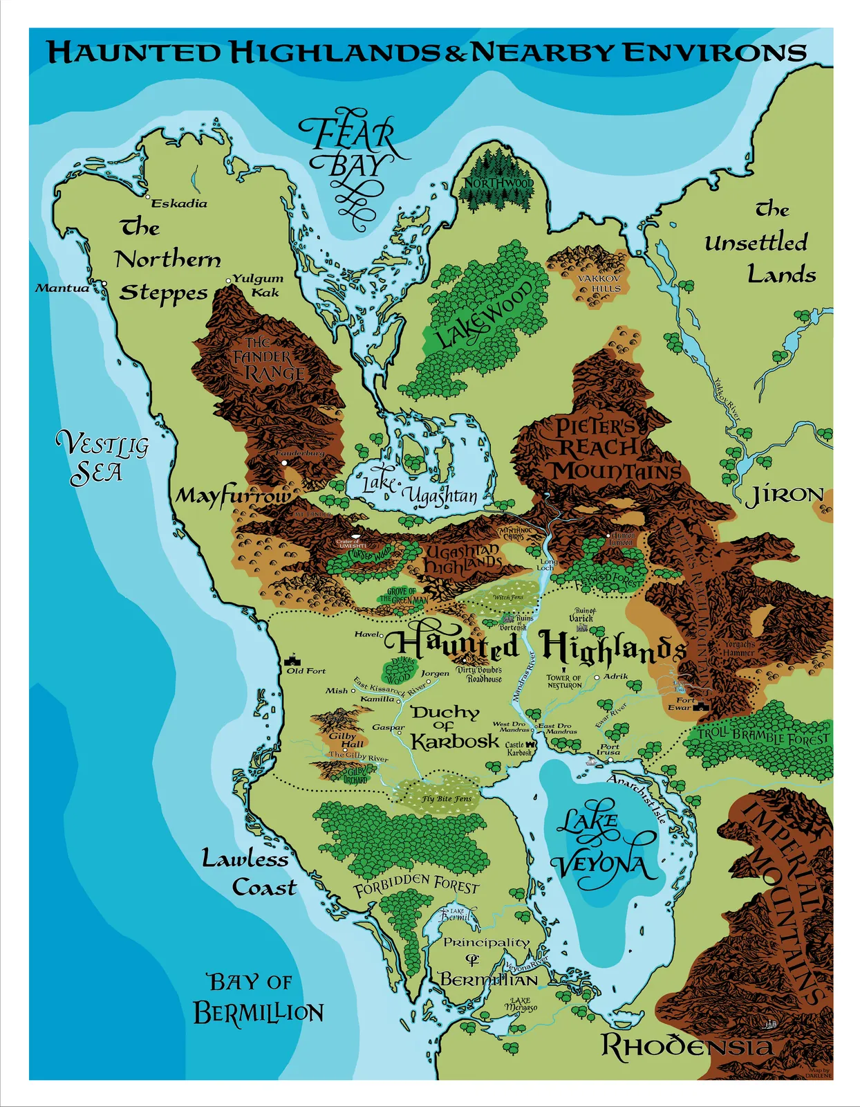 Moreover, named locations such as Fear Bay, Lake Veyona, and the Duchy of Karbosk guide the viewer through forests, coastlines, and mountain ranges. Meanwhile, rivers, borders, and terrain shifts create a clear sense of travel and political space. Consequently, the map balances artistic flair with functional readability. In addition, the varied color palette separates regions naturally while preserving visual cohesion.