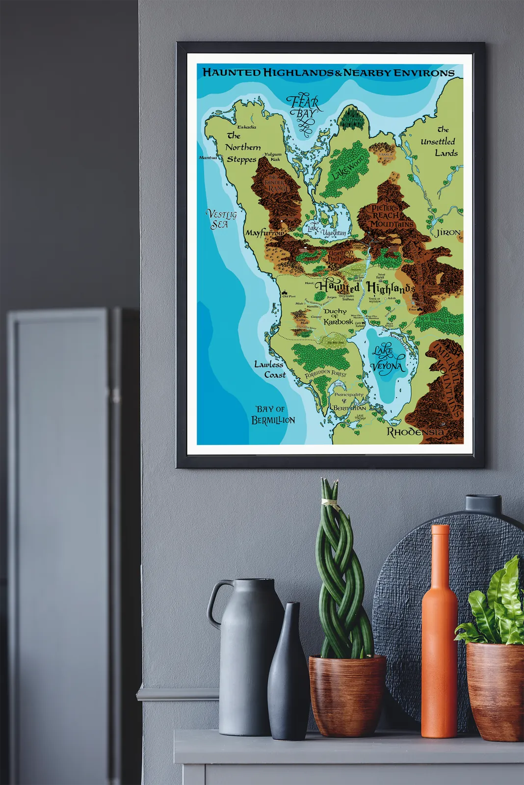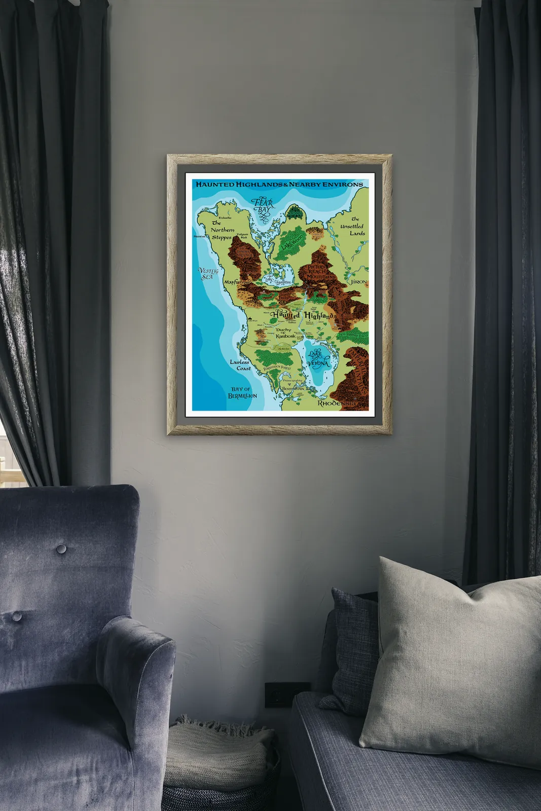 Haunted Highlands fantasy map canvas print presents a richly detailed cartographic view of a dangerous and storied region shaped by legend and conflict. From the first glance, the focus keyphrase establishes this piece as a fantasy map designed for exploration and world-building. As a result, the artwork immediately communicates scale, geography, and narrative depth.