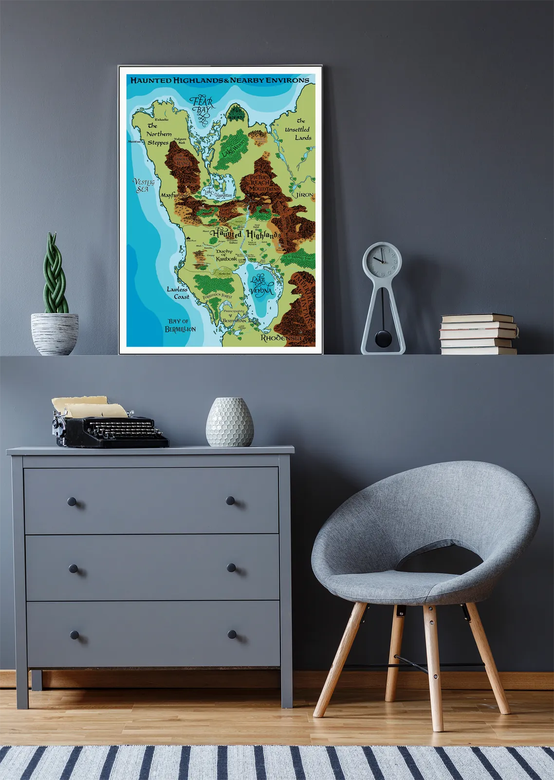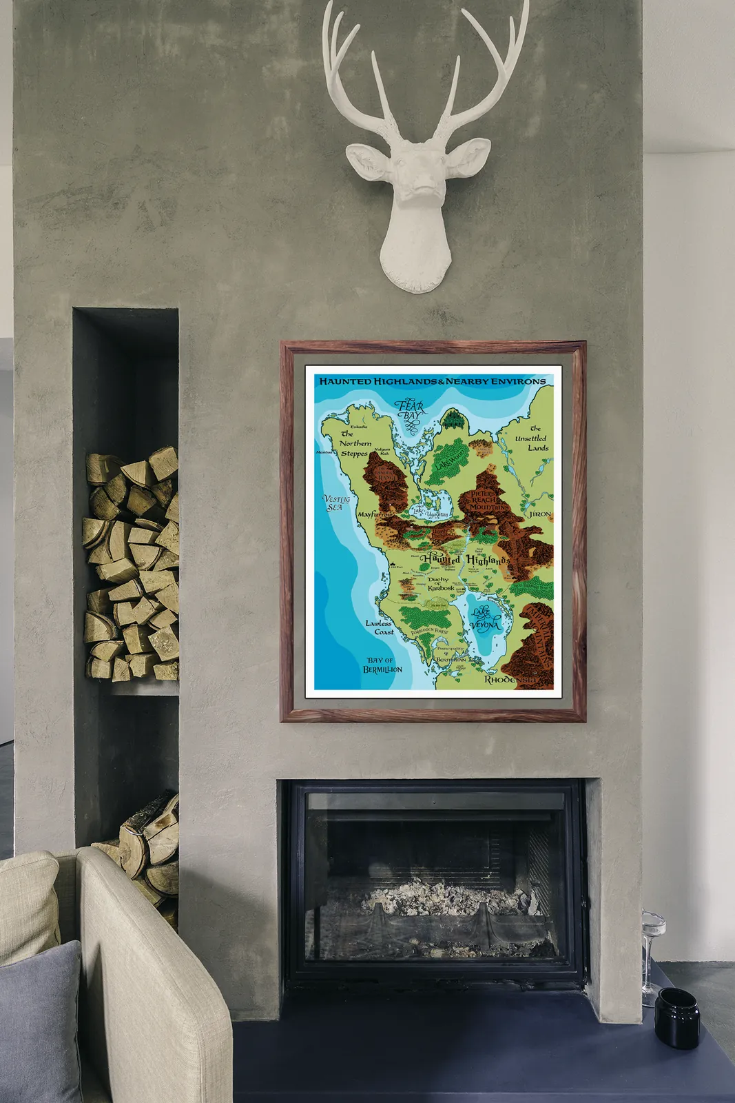Above all, Haunted Highlands fantasy map canvas print delivers clarity, atmosphere, and classic tabletop world-building in a visually striking format.