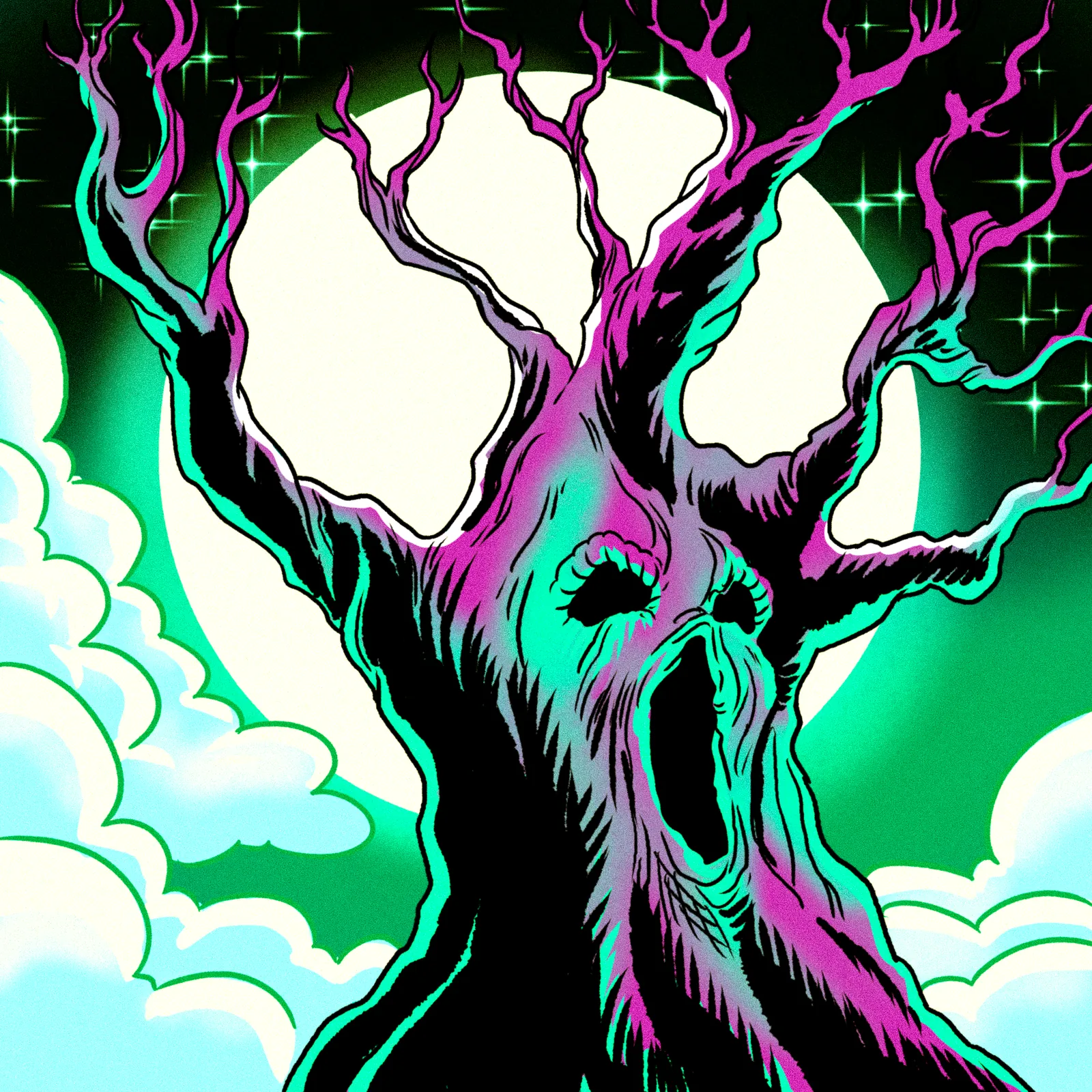 Additionally, electric cyan and vibrant magenta highlights trace the twisted branches against deep black. A massive pale moon anchors the background while stylized clouds fill the lower left. Moreover, four-pointed teal stars punctuate the dark sky with retro horror poster energy.