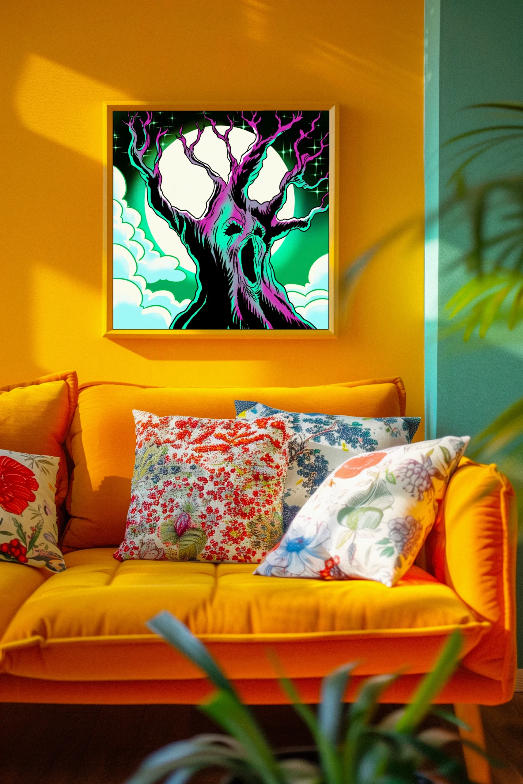 On the wall, the screen-print aesthetic and bold linework command attention at display scale. Ward TCG collectors and psychedelic horror art enthusiasts will recognize Vainer’s distinctive visual language. This haunted tree art trading card art canvas print delivers pure illustration without card frame distractions.