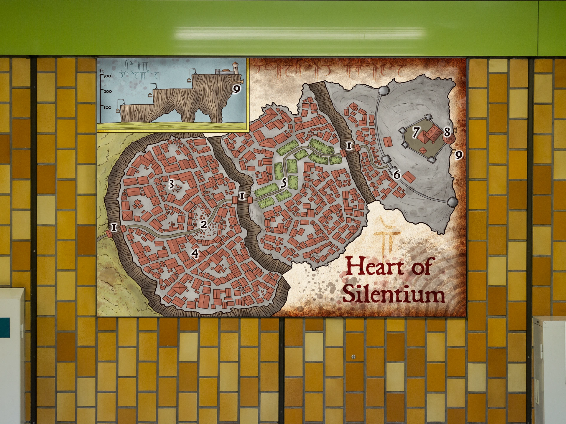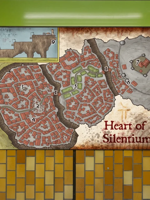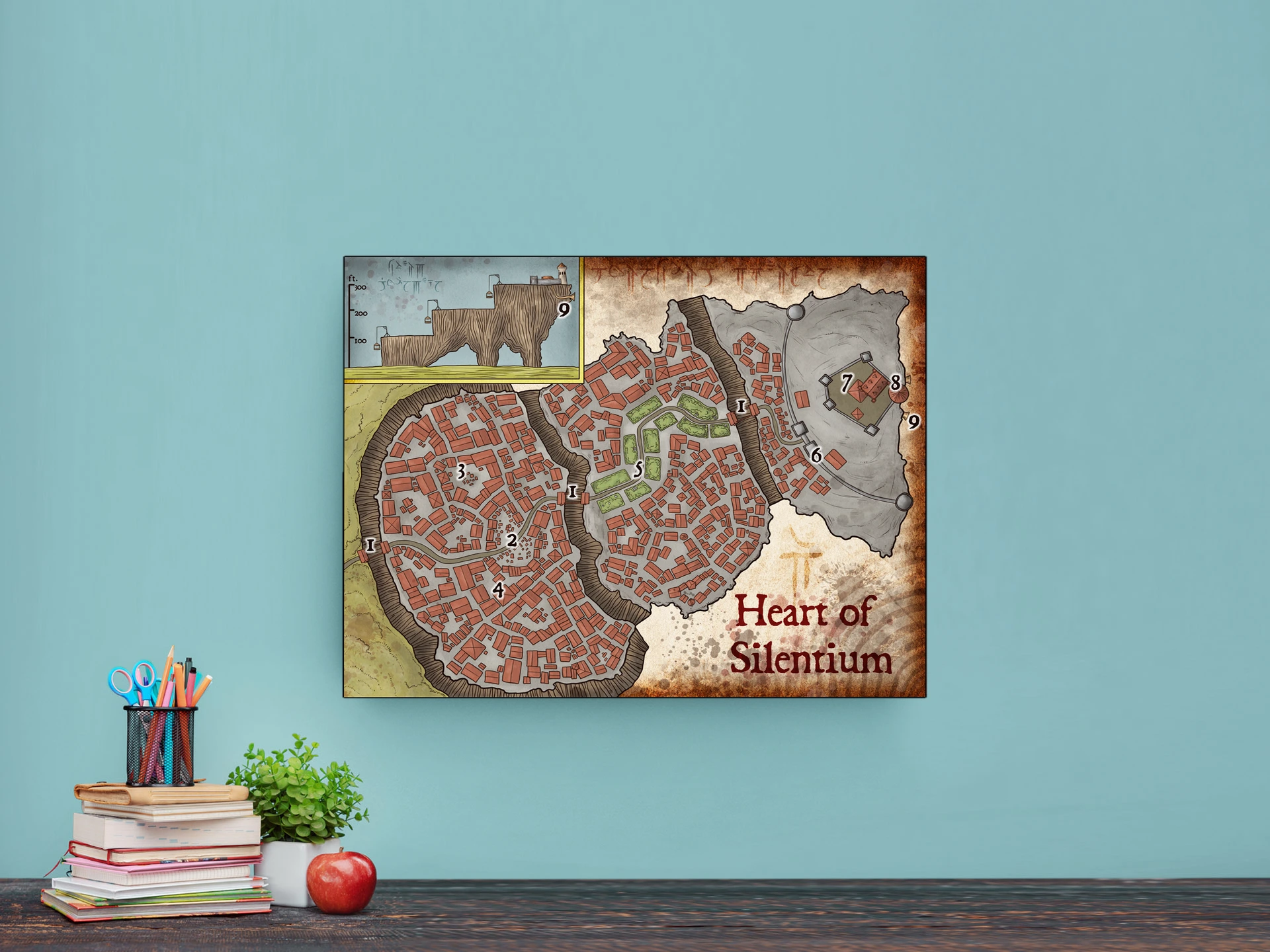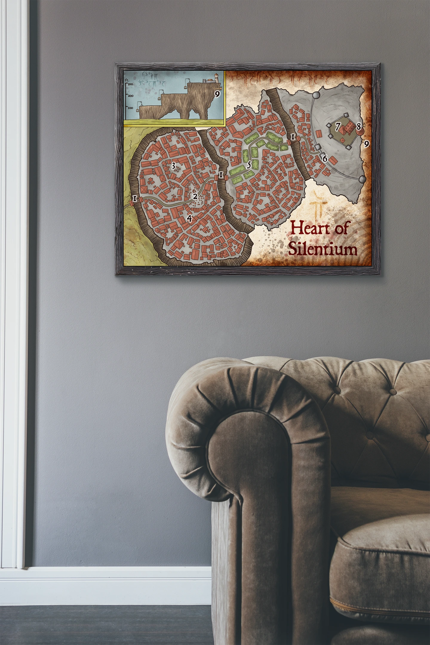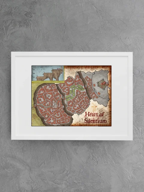 Nine numbered districts fill a cliffside city crowned by orange-red roofs. This heart of the mountain fantasy battle map canvas print shows Silenrium perched on tiered brown cliffs. A central green park divides irregular clusters of medieval buildings.