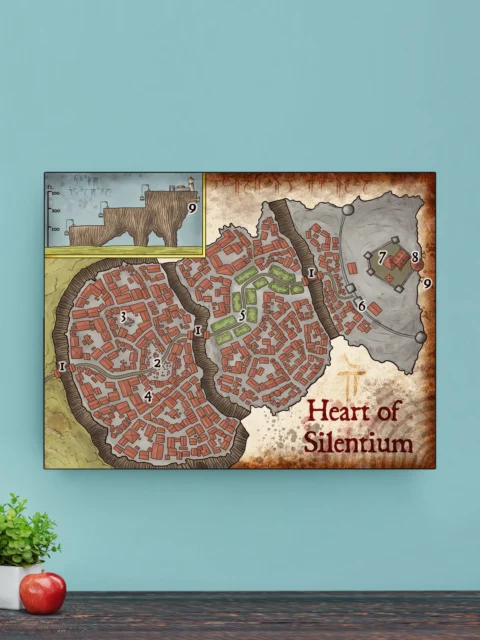 Dungeon masters running urban campaigns trace patrol routes and ambush points across numbered sectors. Players who build worlds reference district layouts and vertical terrain during session prep. This heart of the mountain fantasy battle map canvas print particularly suits DMs running intrigue-heavy adventures.