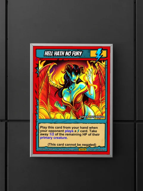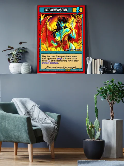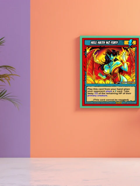 At display scale, vibrant flat colors and heavy black outlines create instant visual impact. The lightning bolt energy symbol and ‘LOVES HOT WINGS’ subtitle add playful character. This hell hath no fury trading card canvas print transforms any wall into a collector’s showcase.
