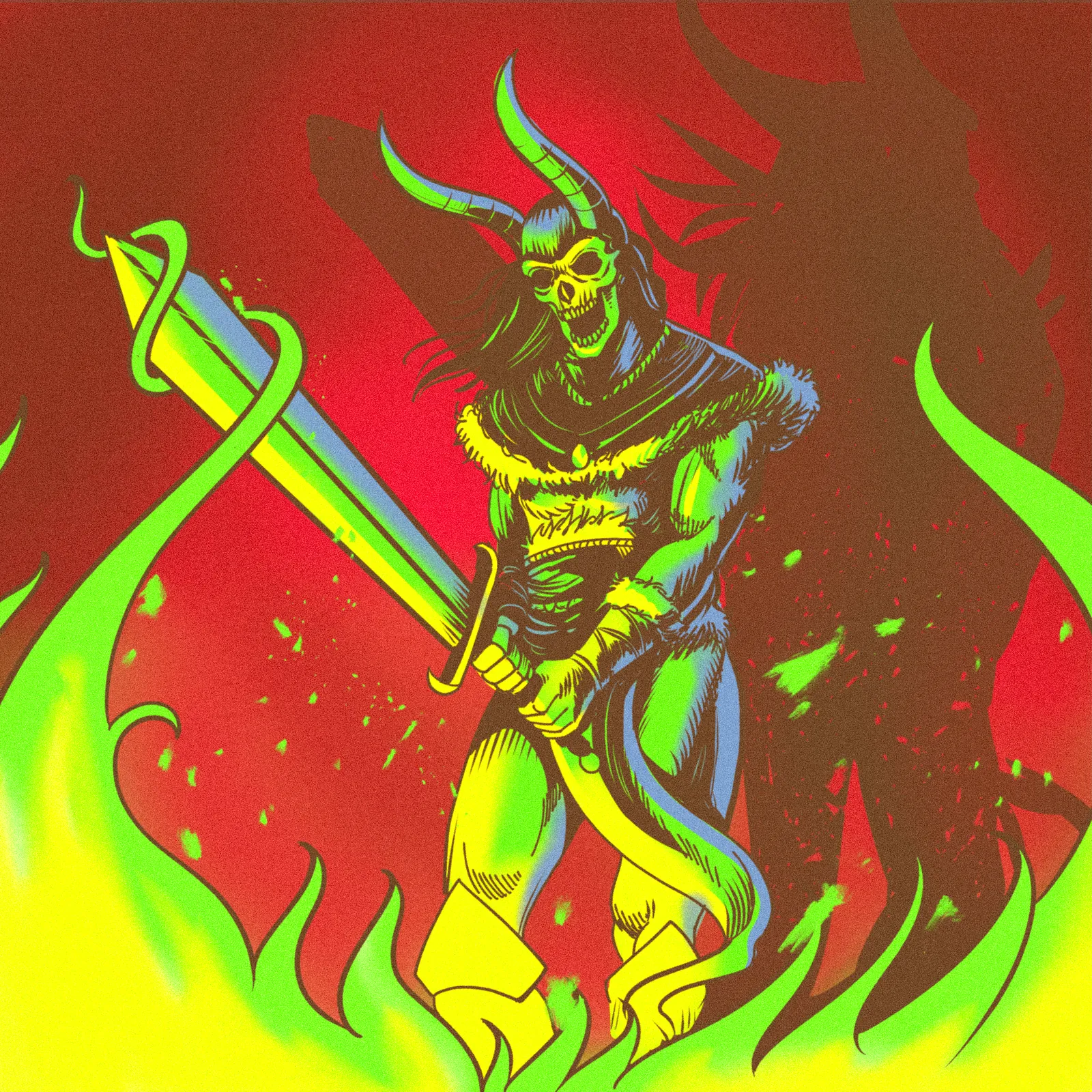 Additionally, neon green flames erupt from the bottom while a deep red field dominates the background. The limited palette of red, brown, and acidic green creates screen print-style intensity. The bold outlines and splatter effects also reinforce the comic book aesthetic throughout.