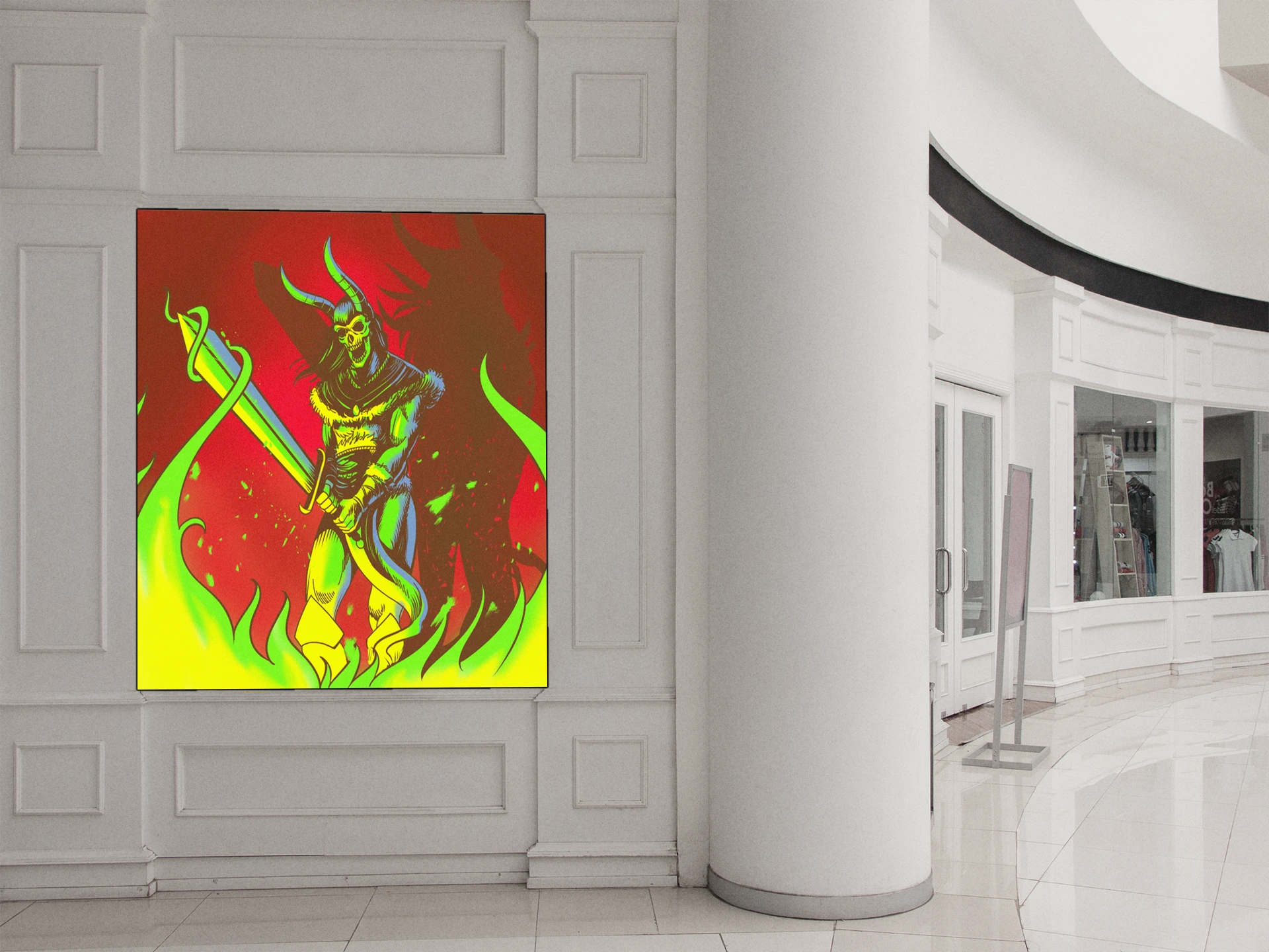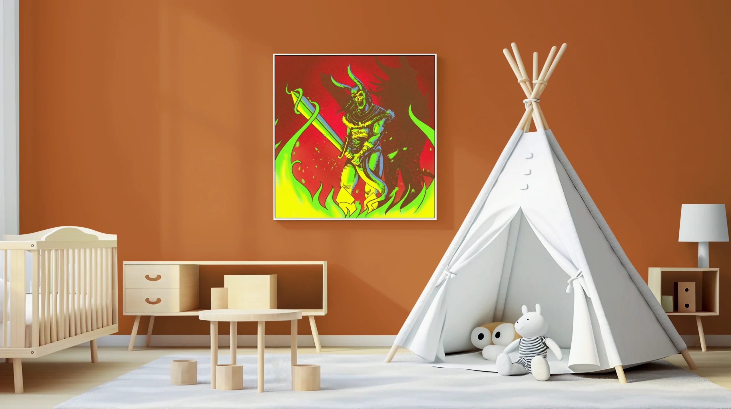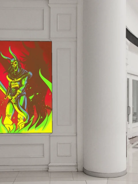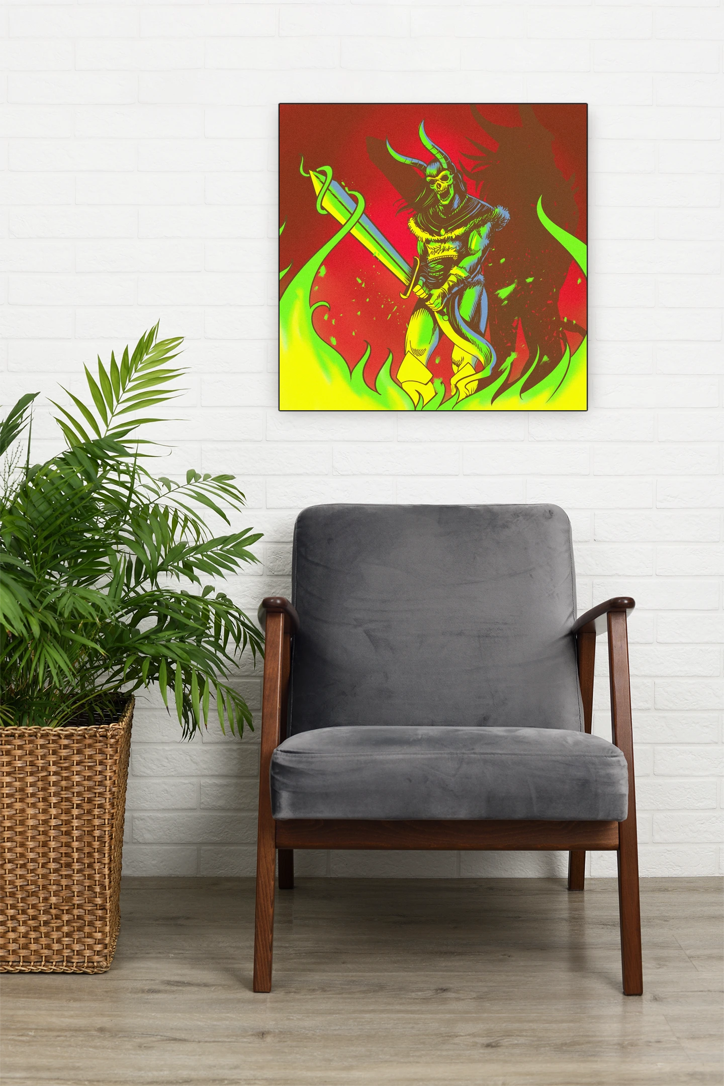 Game rooms and collector walls benefit from the aggressive red-and-green palette and demon warrior subject. Additionally, the screen print aesthetic pairs well with horror-themed or fantasy illustration collections.