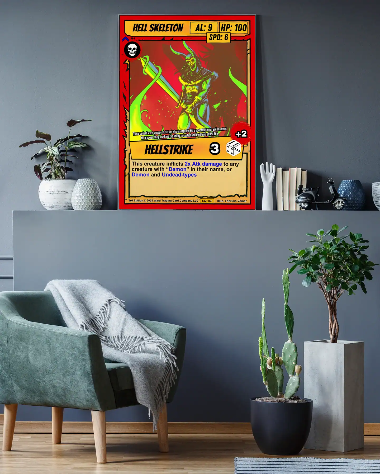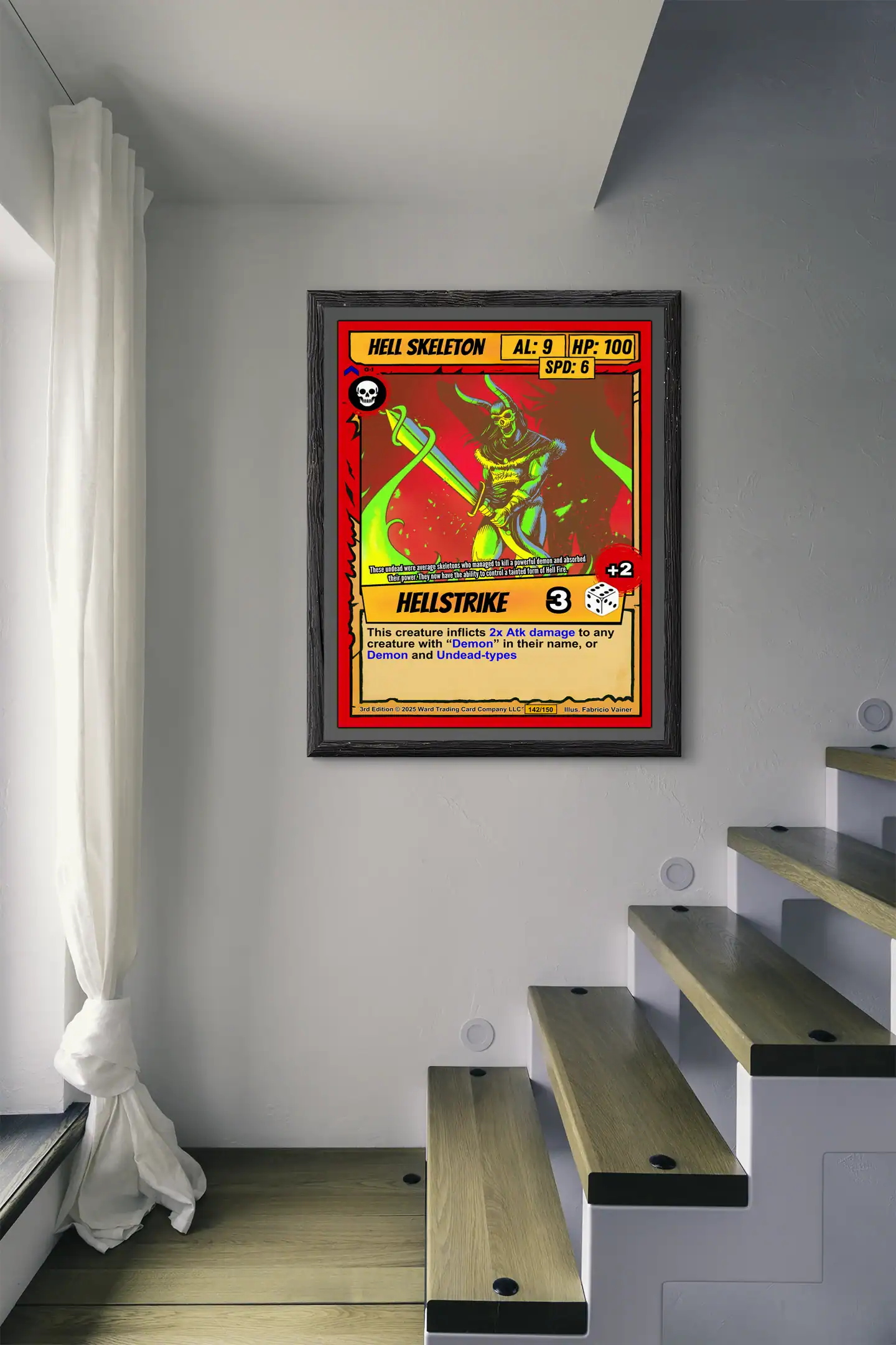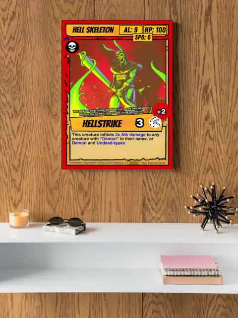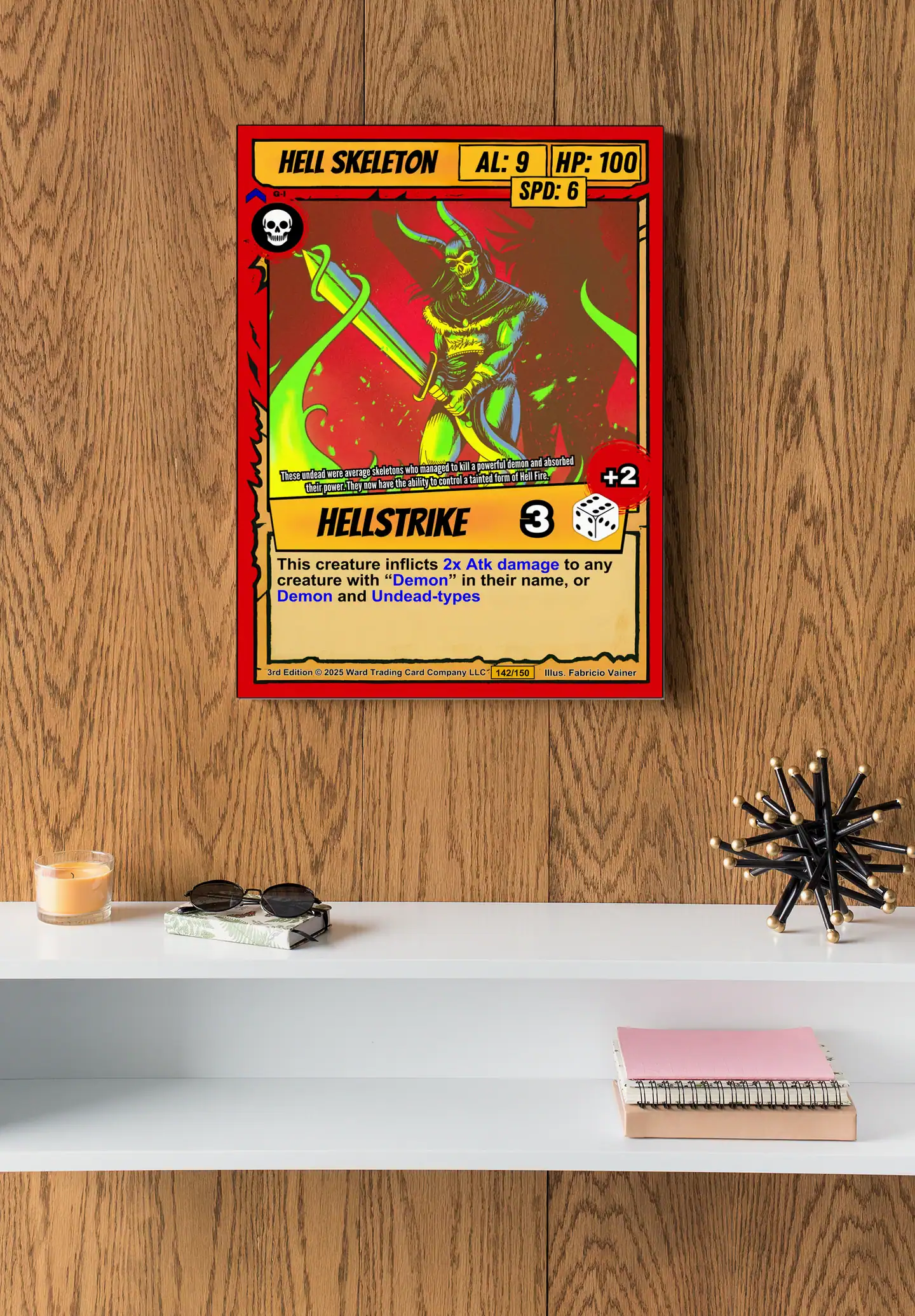Canvas reproduction preserves every stat box and energy symbol that screens blur. TCG collectors and retro gaming enthusiasts recognize authentic 1990s comic aesthetics immediately. This skeleton trading card canvas print particularly appeals to Ward TCG players.