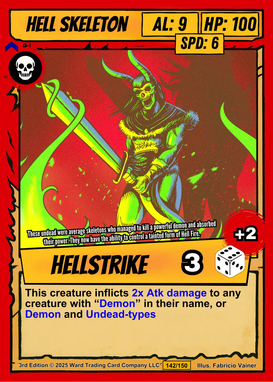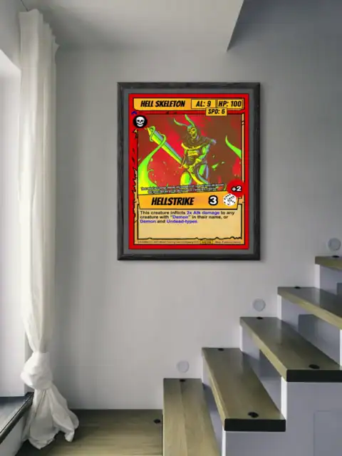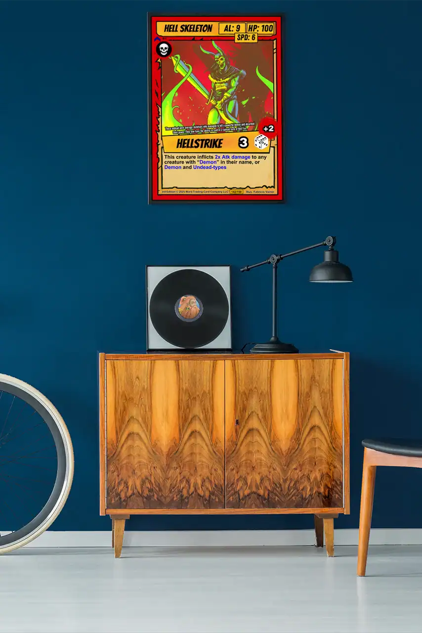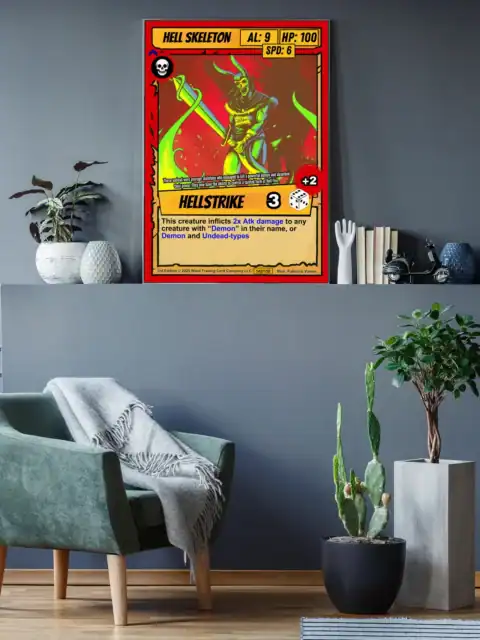 Canvas reproduction preserves every stat box and energy symbol that screens blur. TCG collectors and retro gaming enthusiasts recognize authentic 1990s comic aesthetics immediately. This skeleton trading card canvas print particularly appeals to Ward TCG players.