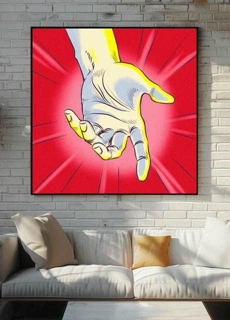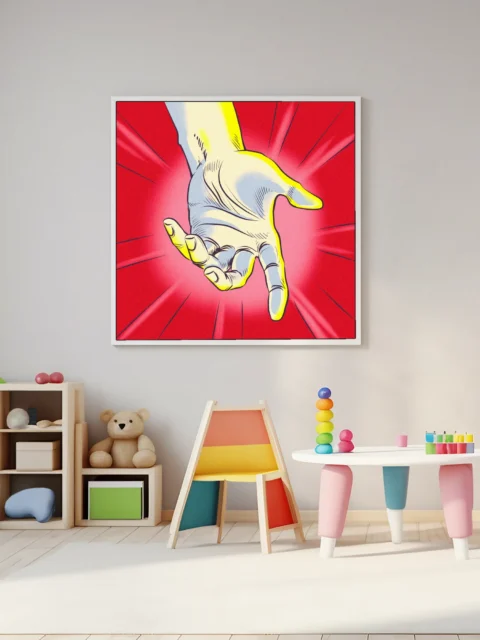 A pale hand reaches downward with fingers slightly curled in rescue gesture. This helping hand art trading card art canvas print showcases Fabricio Vainer’s comic book illustration style. The hand features bright yellow edge highlights, notably emphasizing knuckle definition and fingernail detail.